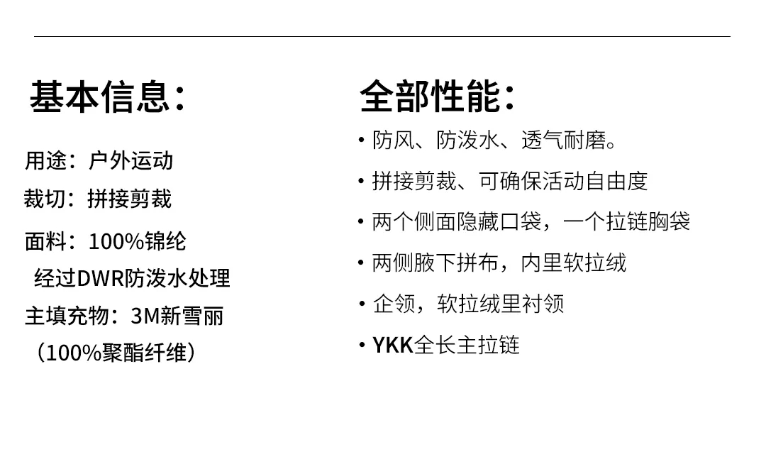 【成分】:面料100%锦纶、填充(3M新雪丽)100%聚酯纤维
