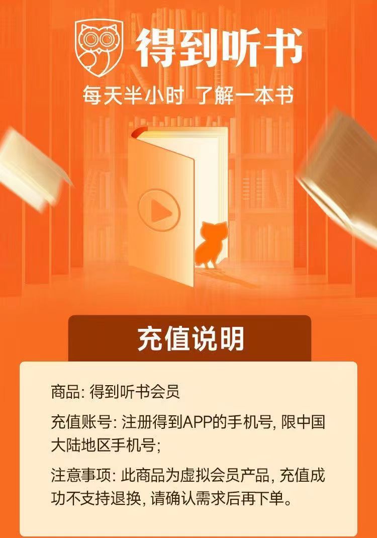 充值注意事项: 1、发货时间:直充到您提供的得到账号,5-60分钟到账 2、充值账号:得到账号为手机号,请务必提供正确充值账号 3、产品规格:本产品为得到听书会员,并非得到电子书会员,得到听书与得到电子书会员权益有所不同,请务必下单前核对并确认了解 3、本产品为特殊价格产品,不适用于网络购买商品七日无理由退货条款,一经购买,不退不改。请不要填错充值账号,因个人原因造成充值错误,责任自负,不予退款,请务必仔细填写 4、如遇市场断货问题,平台将无条件为客户进行退款 5、下单前请您务必仔细阅读产品中各项说明,然后再下单订购 6、下单购买后,则视为您已仔细阅读本产品中的各项说明,并认同此声明以及产品规则 |