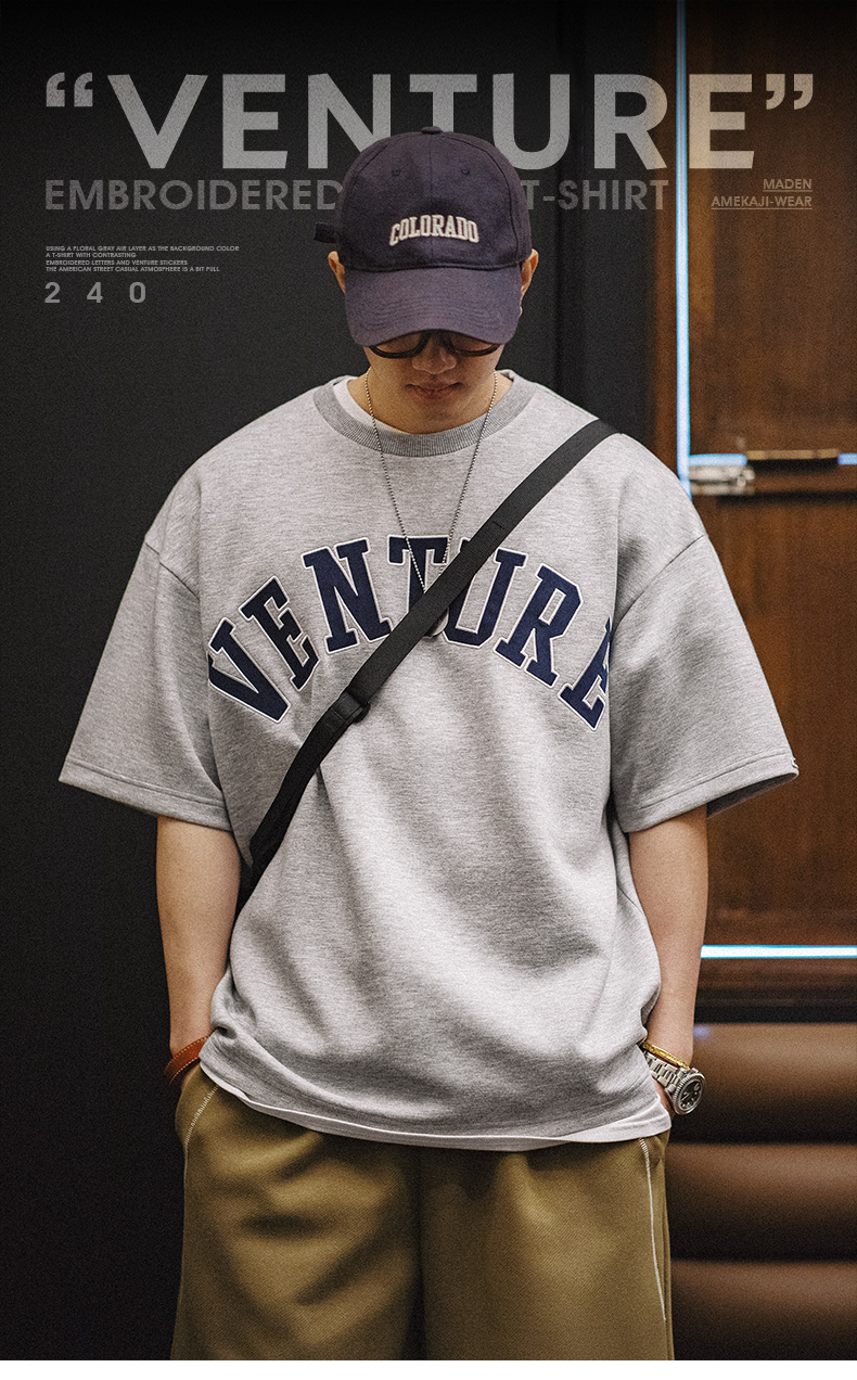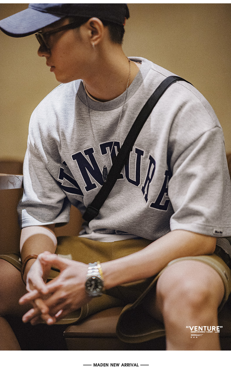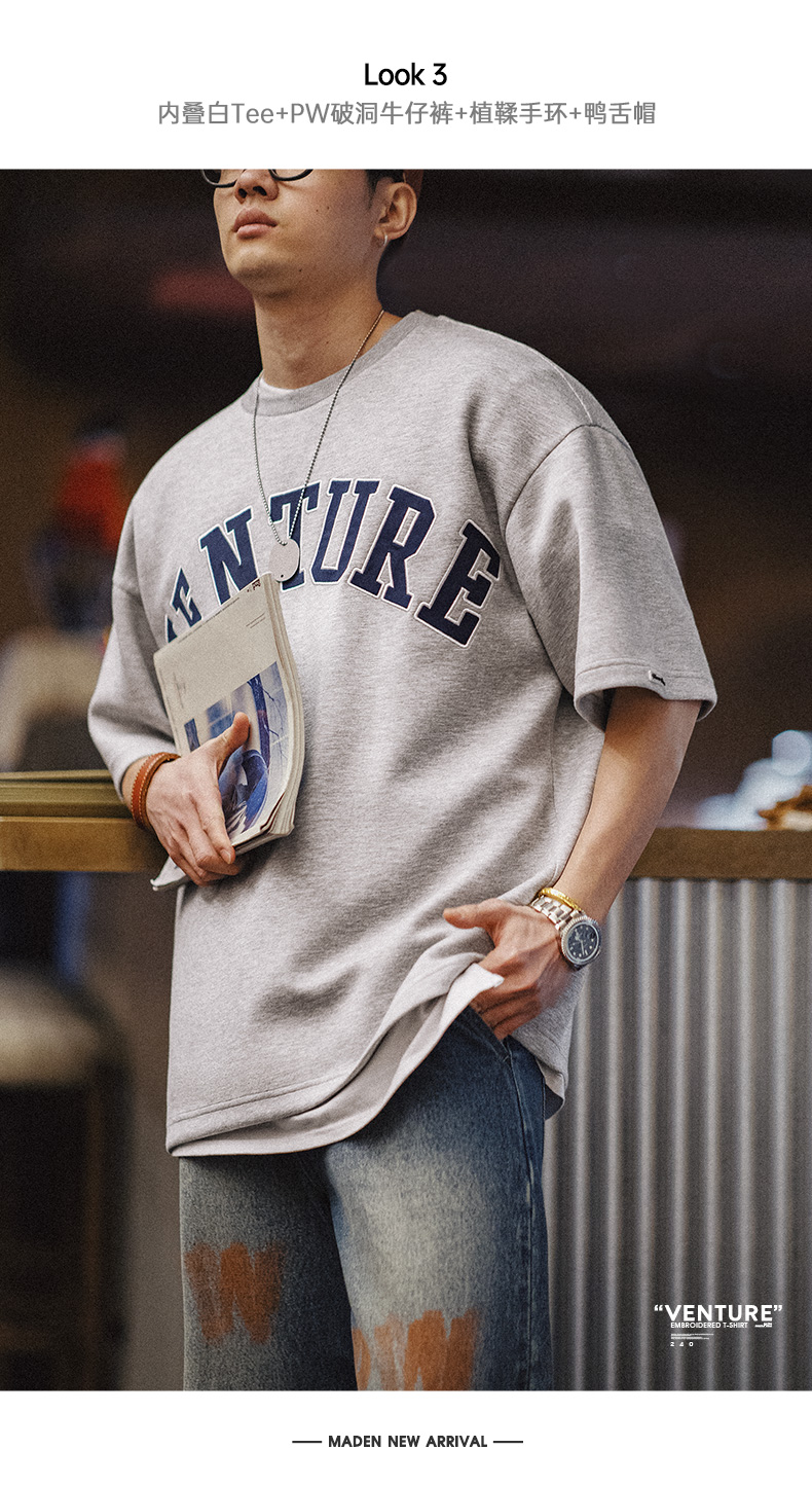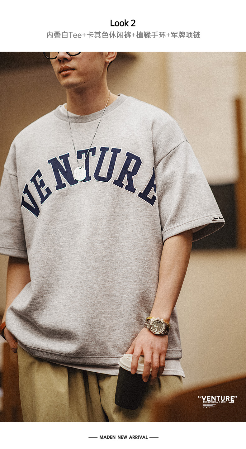工装优选 美式复古空气层字母刺绣T恤宽松重磅五分袖圆领短袖男夏