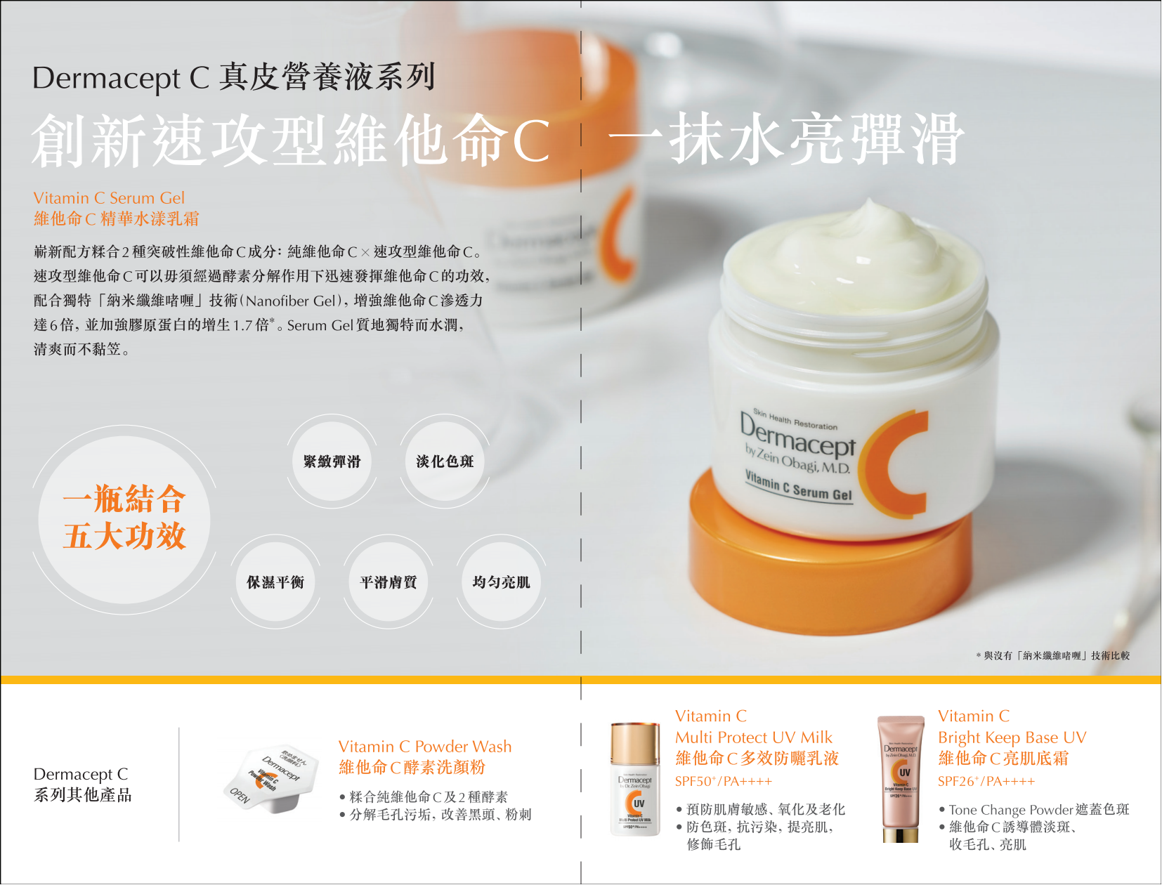功 效:崭新配方糅合2种突破性维他命C成分:純維他命C x速攻型维他命C,采用「纳米纤维啫喱」技术(Nanofiber Gel),增强维他命C渗透力达6倍,并加强胶原蛋白的增生1.7倍,一瓶结合五大功效,能迅速主动进攻五大肌肤问题:缺乏弹性、肤色黯哑、色斑、干燥缺水及粗糙困扰。