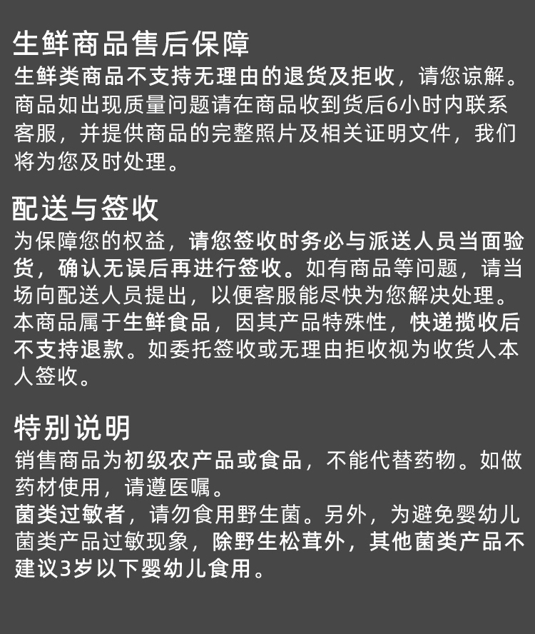 1.顾客收到松茸后应立刻开箱检查,如有坏品请及时联系客服售后处理,售后有效时间在收到松茸后的1小时内,超过时效不予售后。