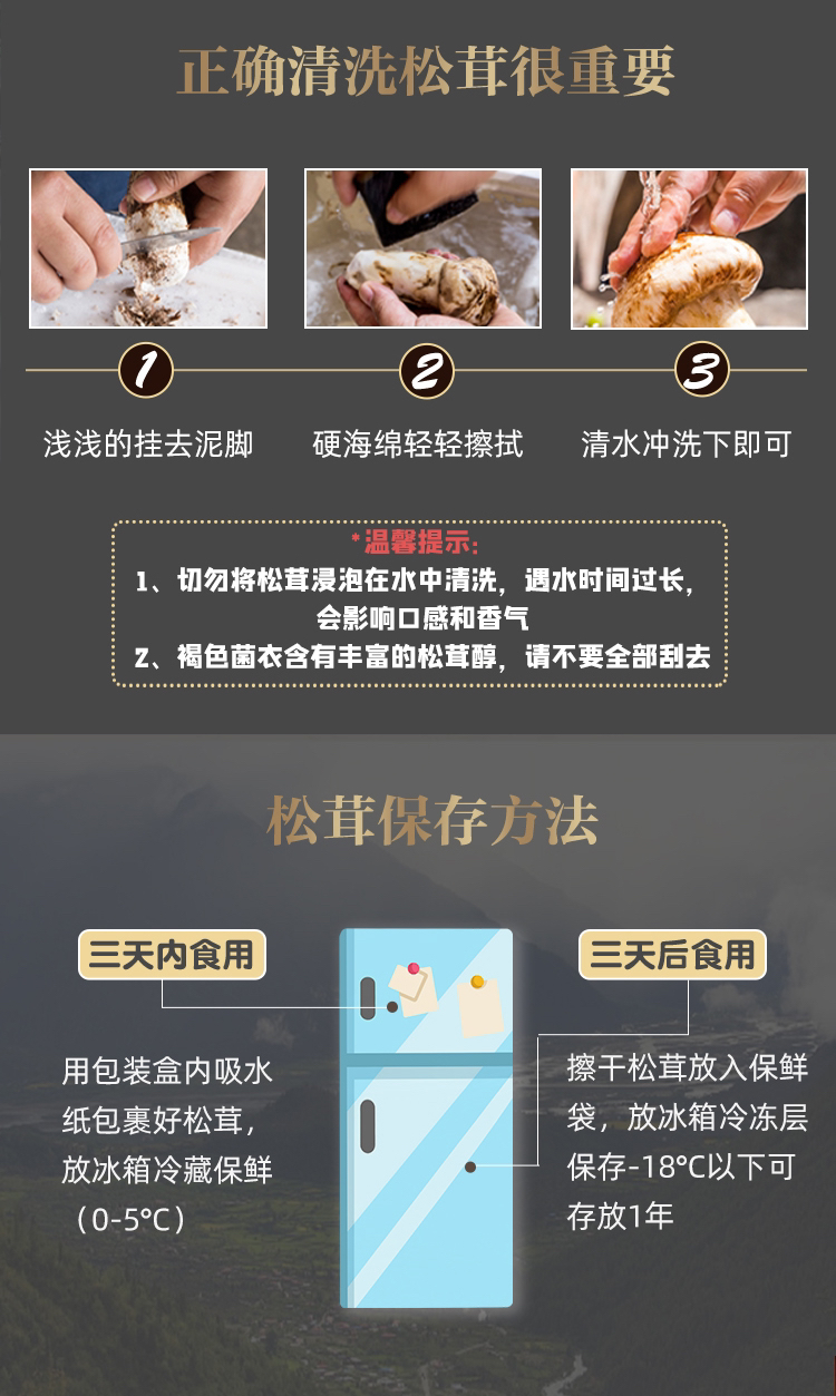 4.顾客收到松茸后应立即放入冰箱冷藏保存,建议在48小时内食用,以确保松茸的新鲜口感。