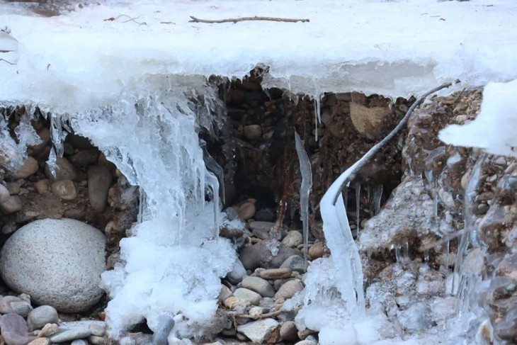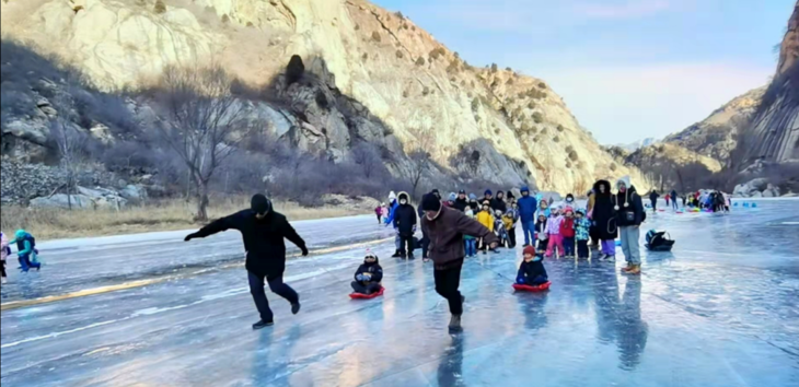 冰层约40-50cm厚,冬季最冷的时候,甚至可以承受住小汽车的碾压。有些流速湍急的河段未被冻上,冰层和流水的组合形成一点点刺激的体验,更让孩子们兴奋不已。