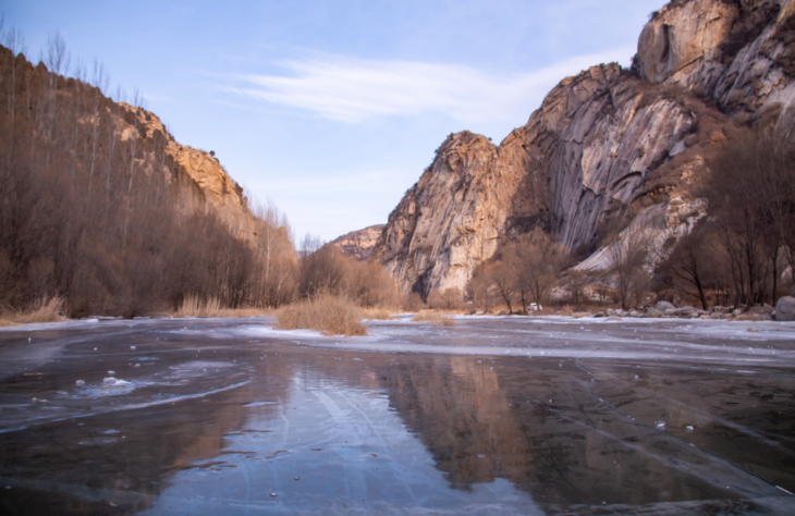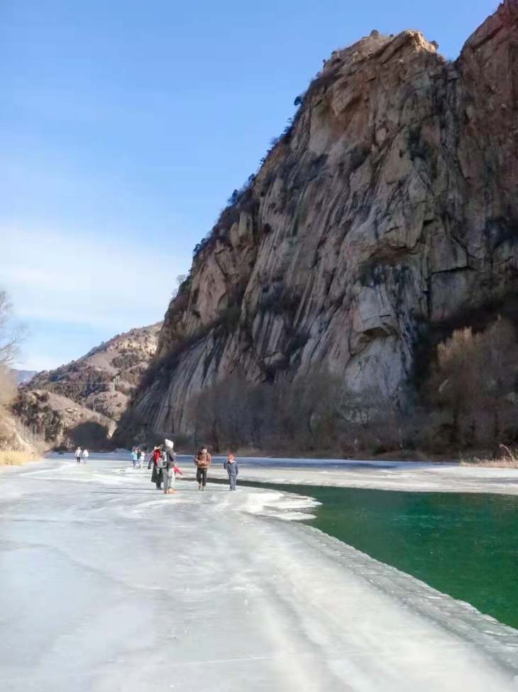 我们的路线一路向西,全程大约3公里左右。这里深处峡谷中央,为我们隔绝了冬日凌冽的北风,拥有很好的体感温度,非常适合走冰徒步,畅享美好的冬日时光。