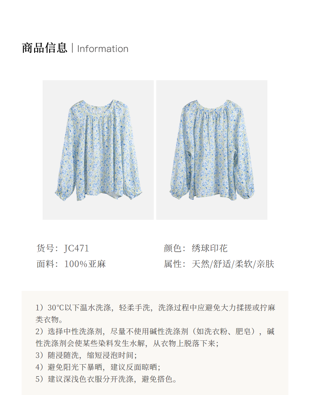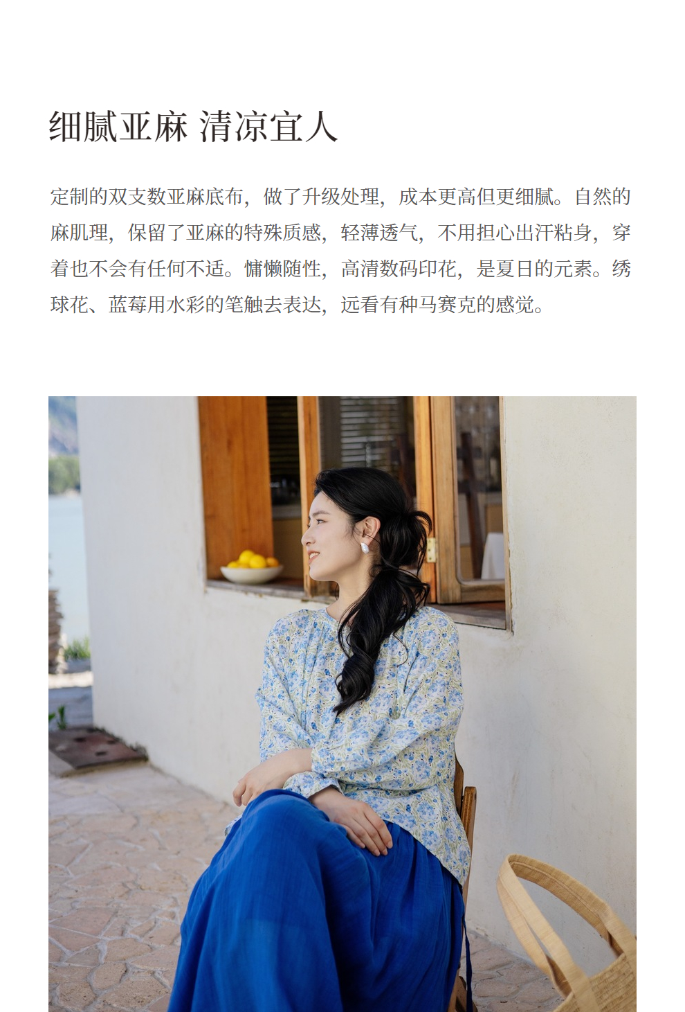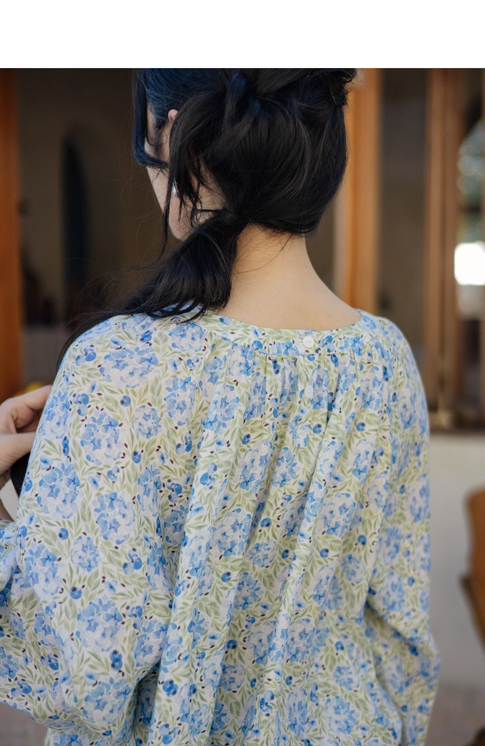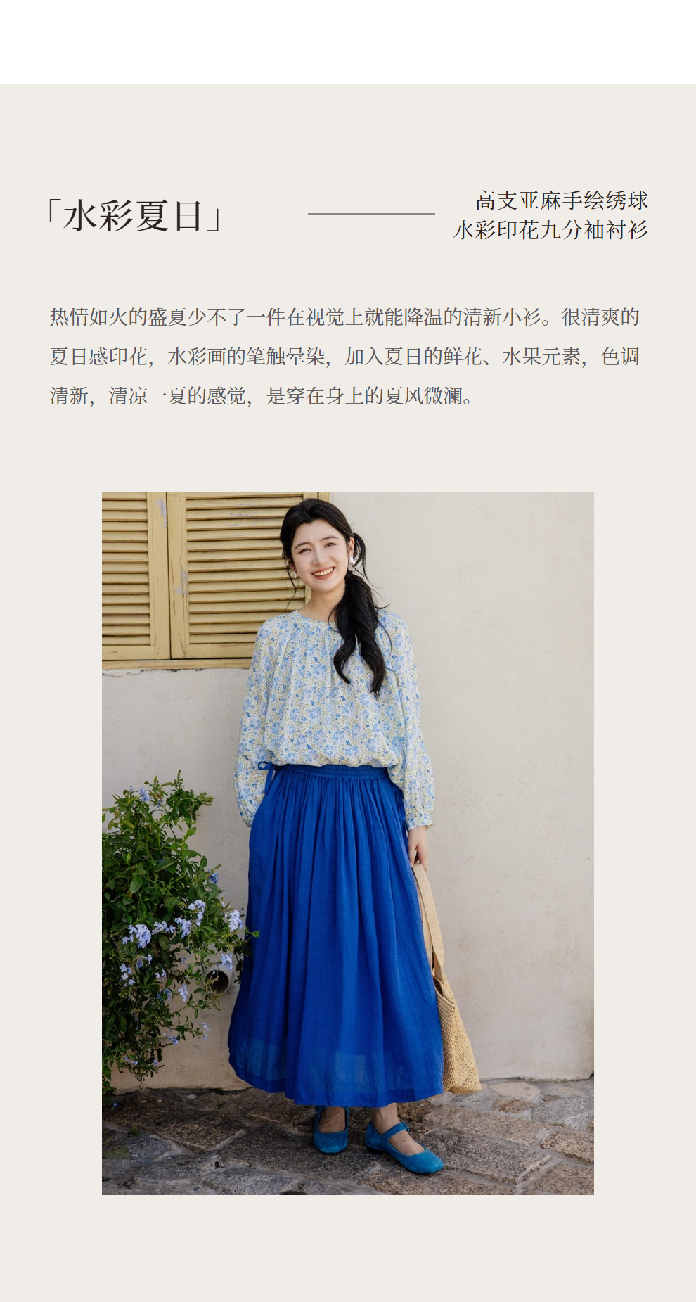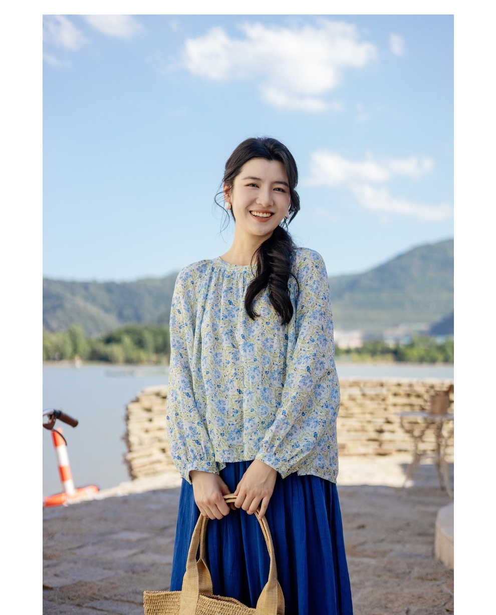 * 绽放旅行女装471朵/高支亚麻手绘绣球水彩印花九分袖圆领短款衬衫