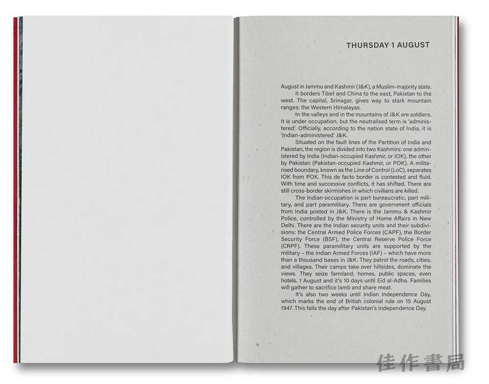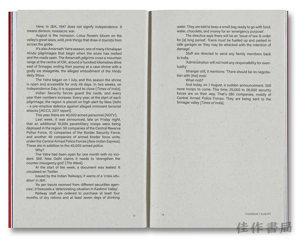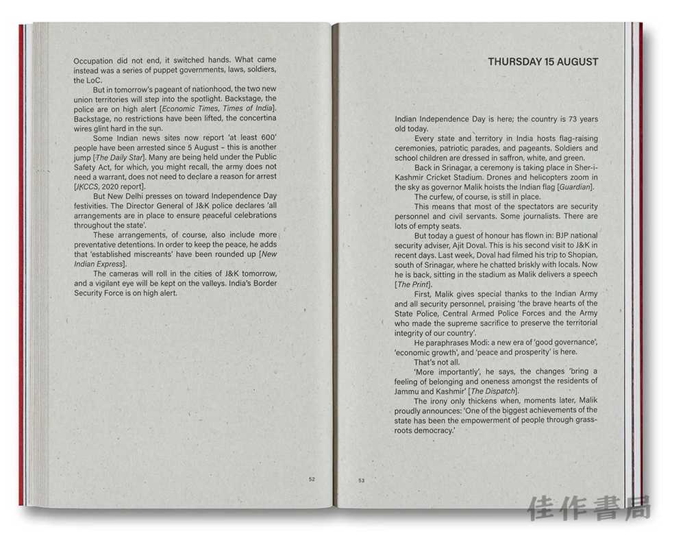 在书的第一部分中,斯科特和托马斯汇集了数百个信息来源,填补了从斯利那加到印度和巴基斯坦实际控制线沿线偏远的喜马拉雅山谷之间的信息空白,创建了一份独特的、为期十五天的围城日志。在这期间,克什米尔人的宪法权利被剥夺,该邦被分割,并失去了其特殊地位。在第二部分中,作者们审视了克什米尔的被占领土,以及印度如何复杂地借鉴以色列对巴勒斯坦的占领方式,来建立其监控和占领的基础设施。