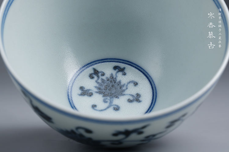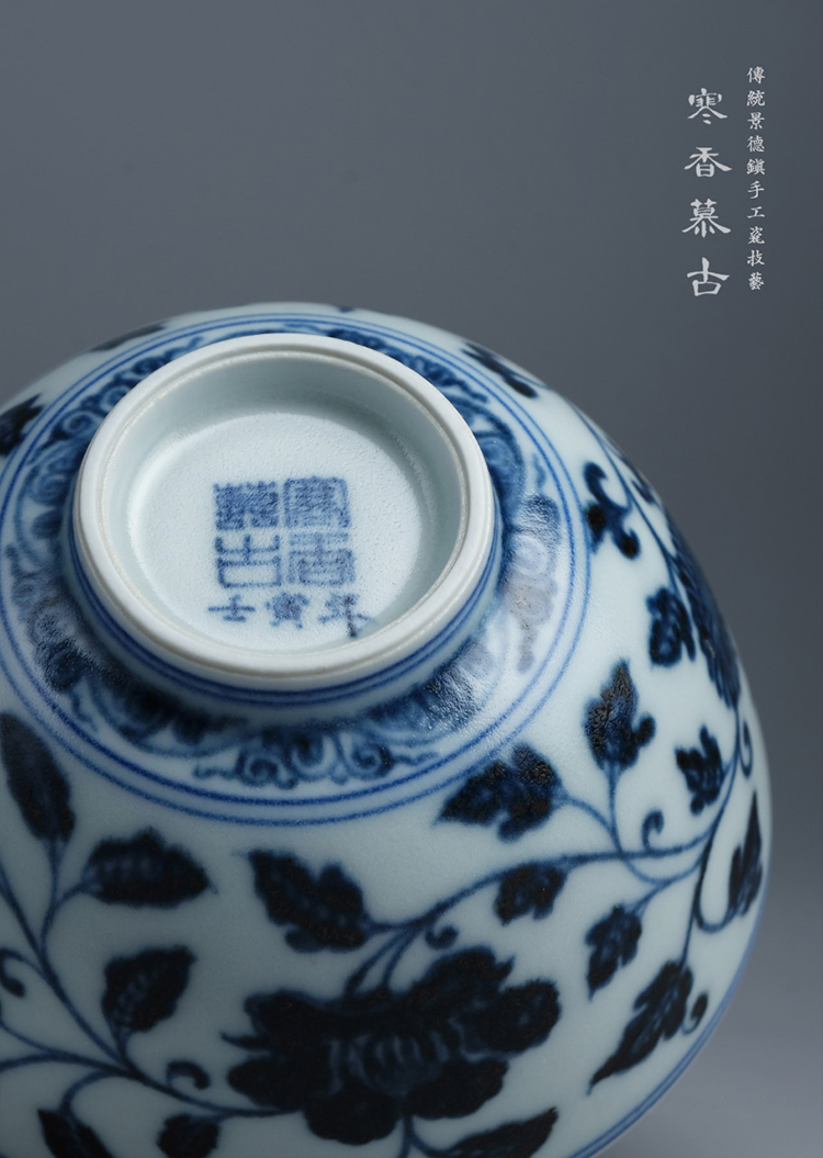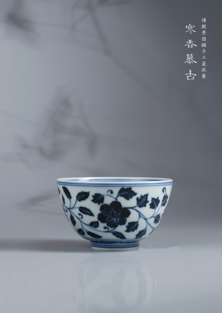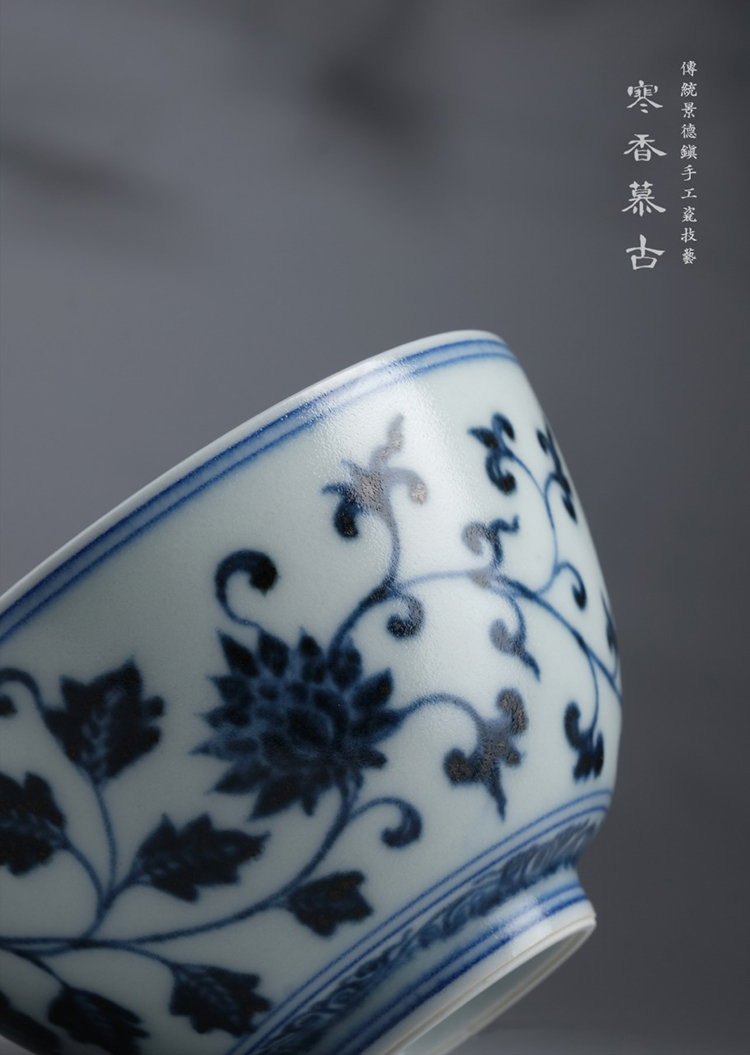 寒香慕古元明青花糯米釉缠枝花卉纹茶碗