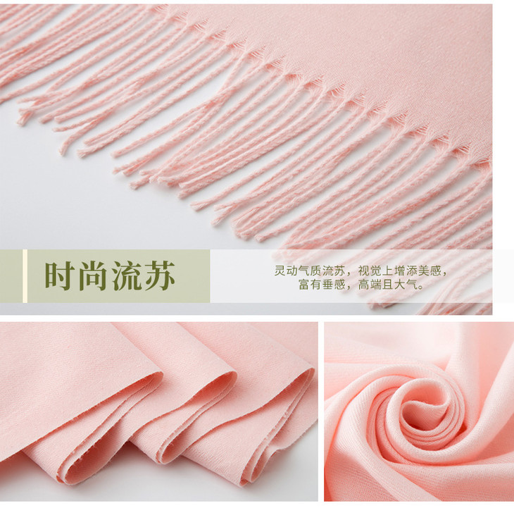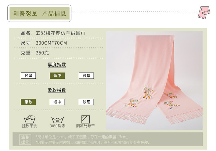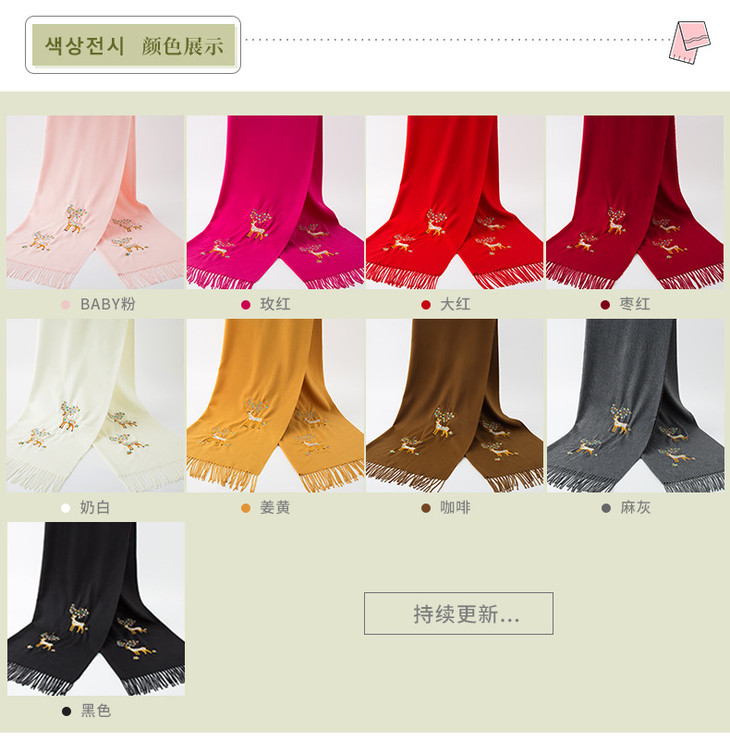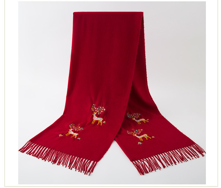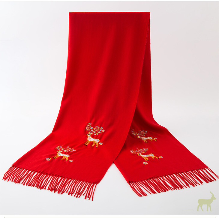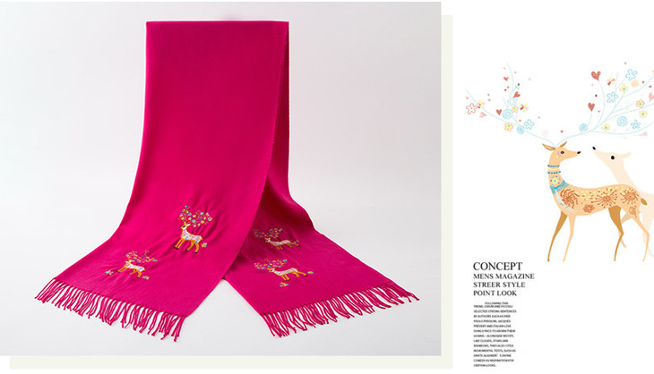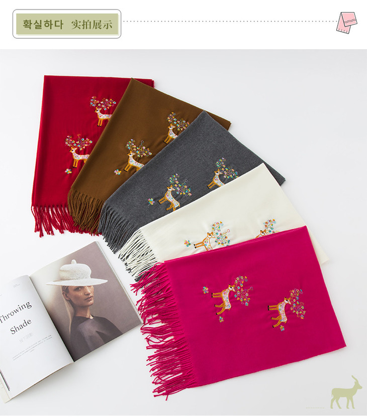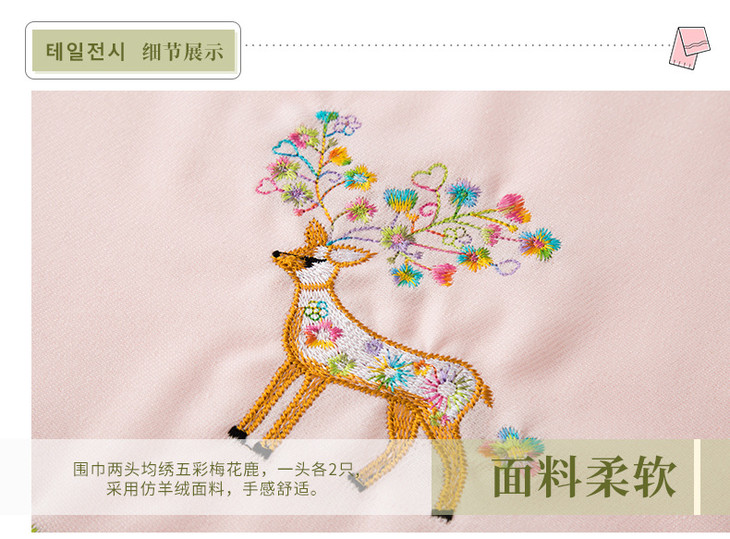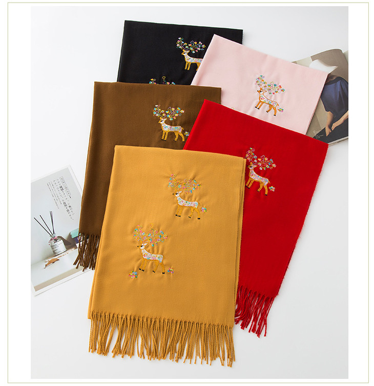【围巾女】双头刺绣五彩梅花鹿轻刺毛时尚围脖 纯色流苏仿羊绒围巾