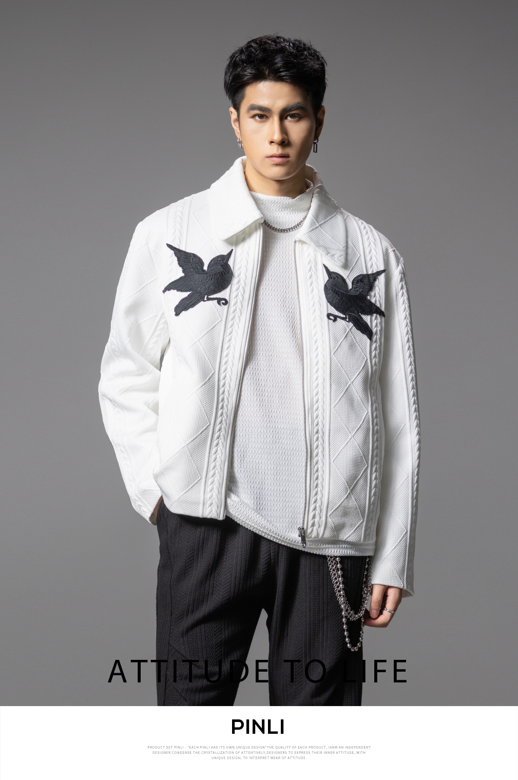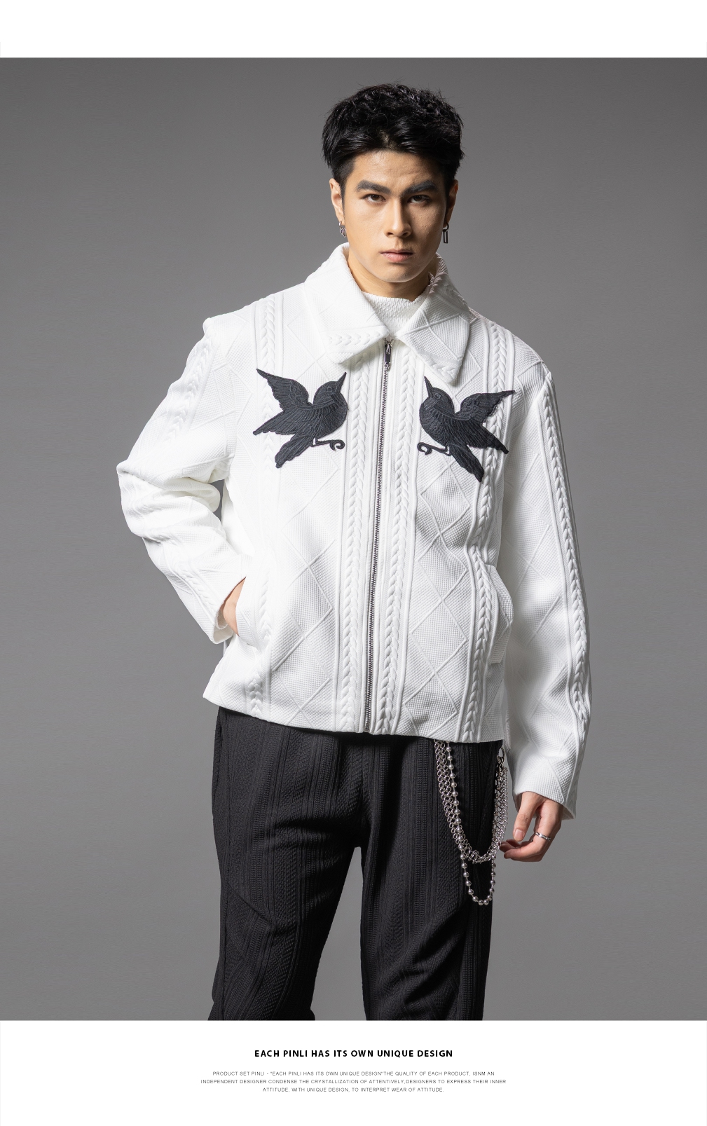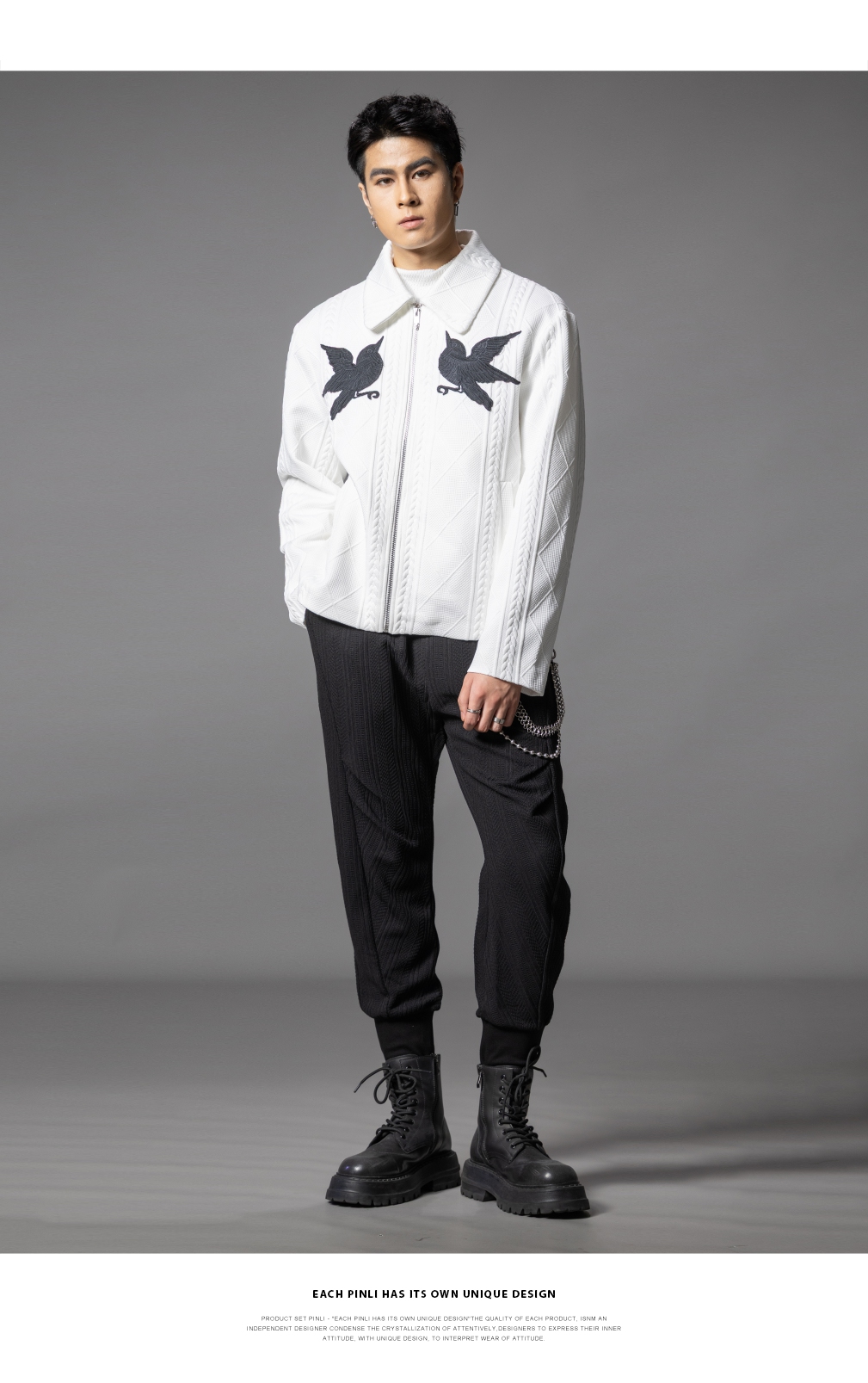 PINLI品立2025秋季新款可翻高领针织提花夹克男士贴布绣短款外套B253104018