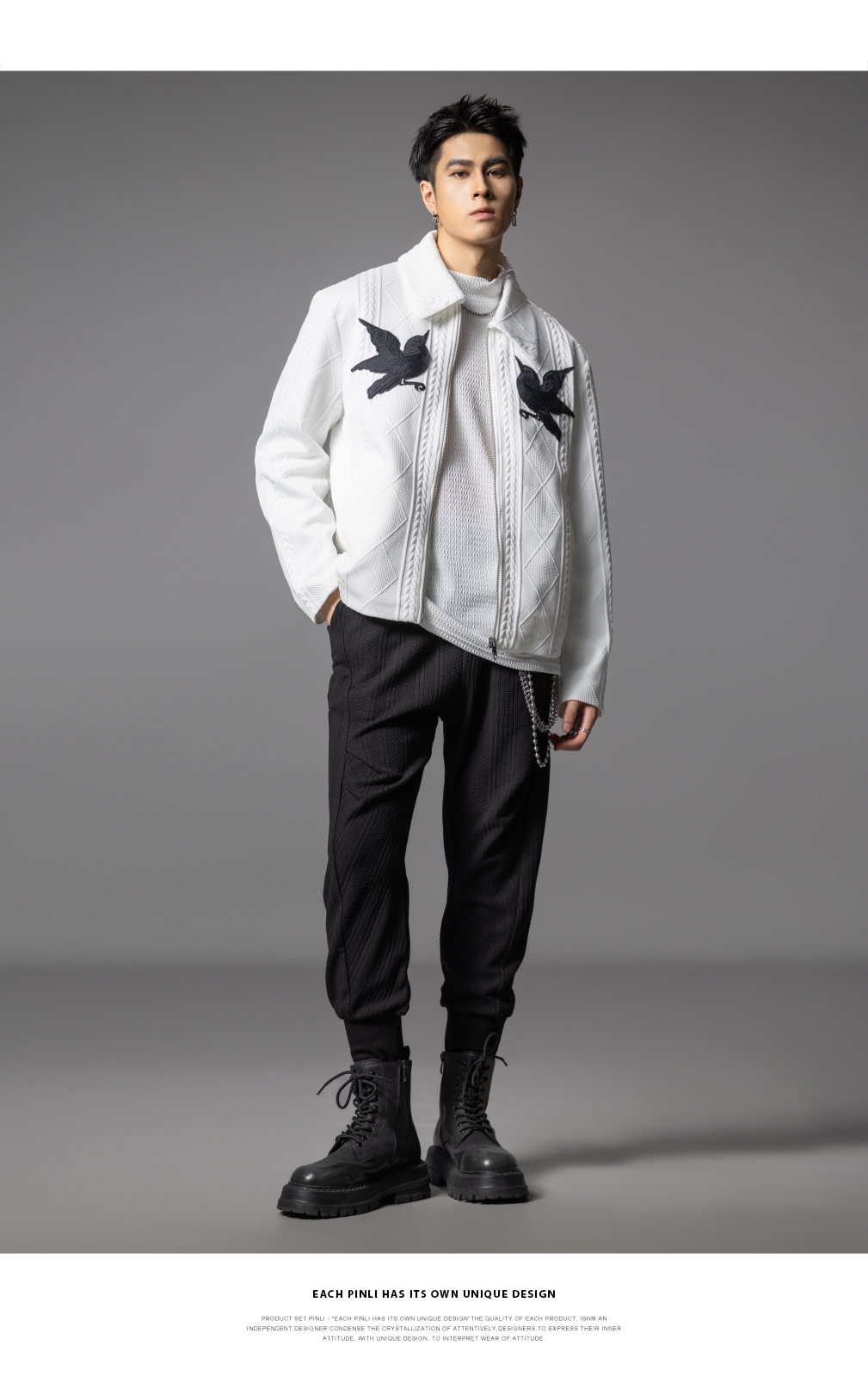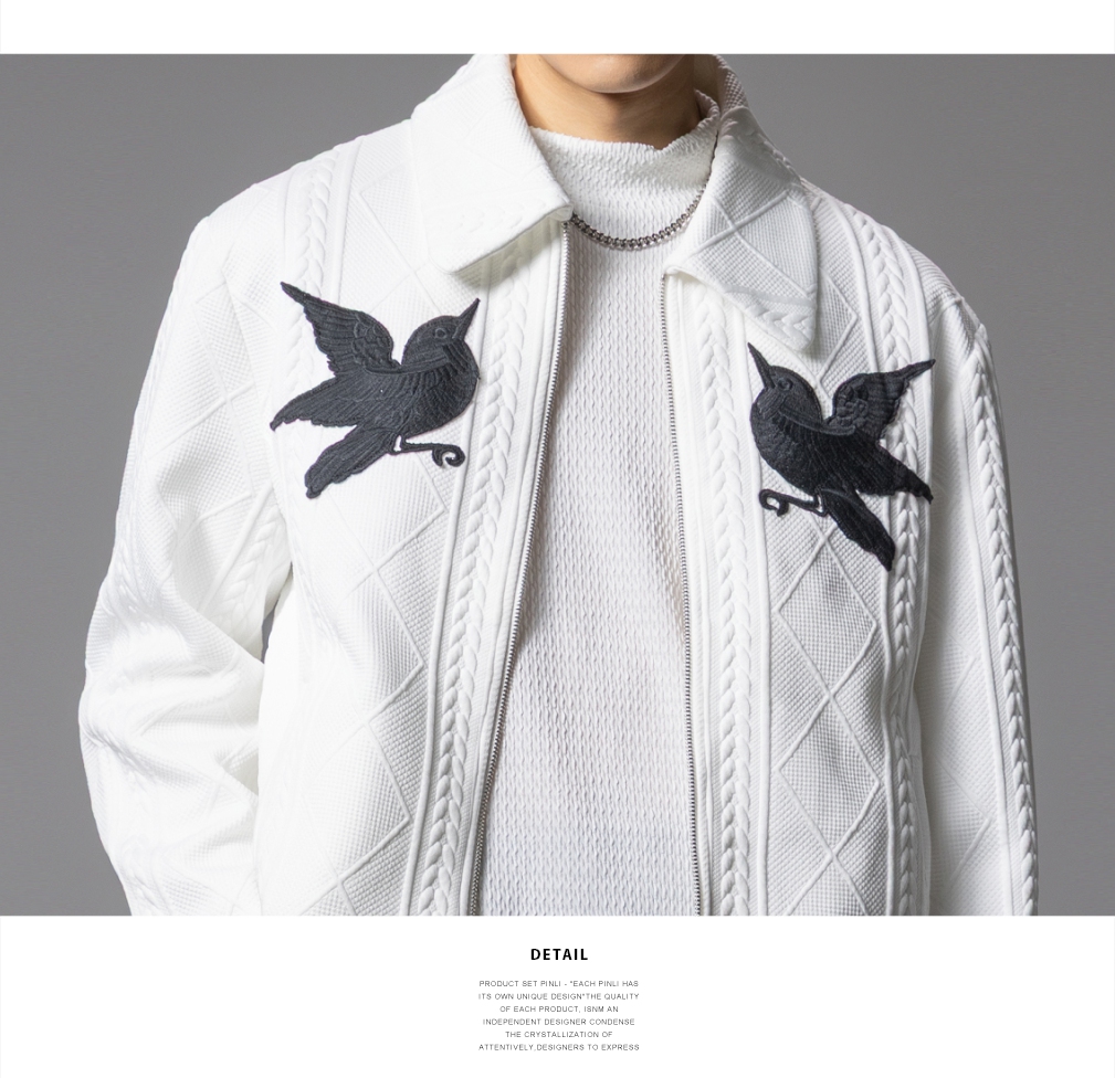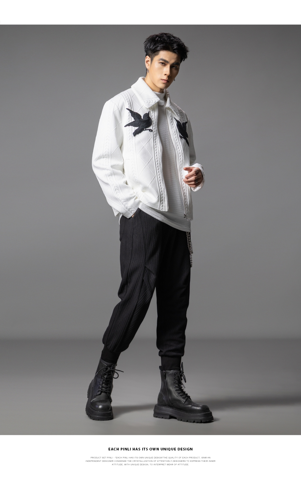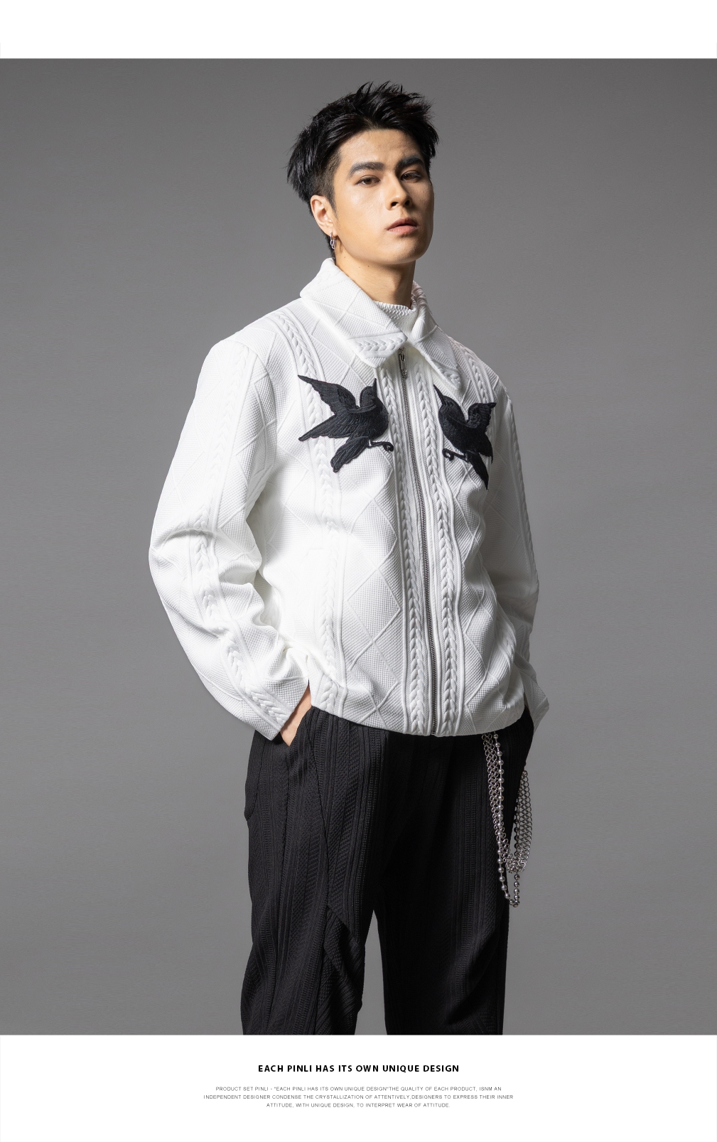 PINLI品立2025秋季新款可翻高领针织提花夹克男士贴布绣短款外套B253104018