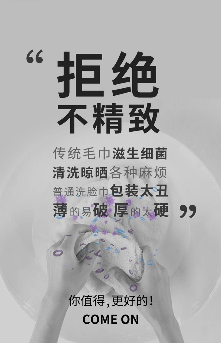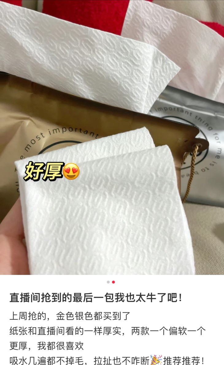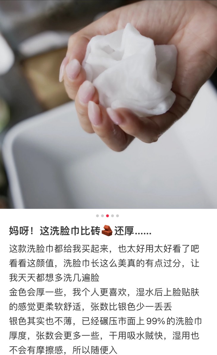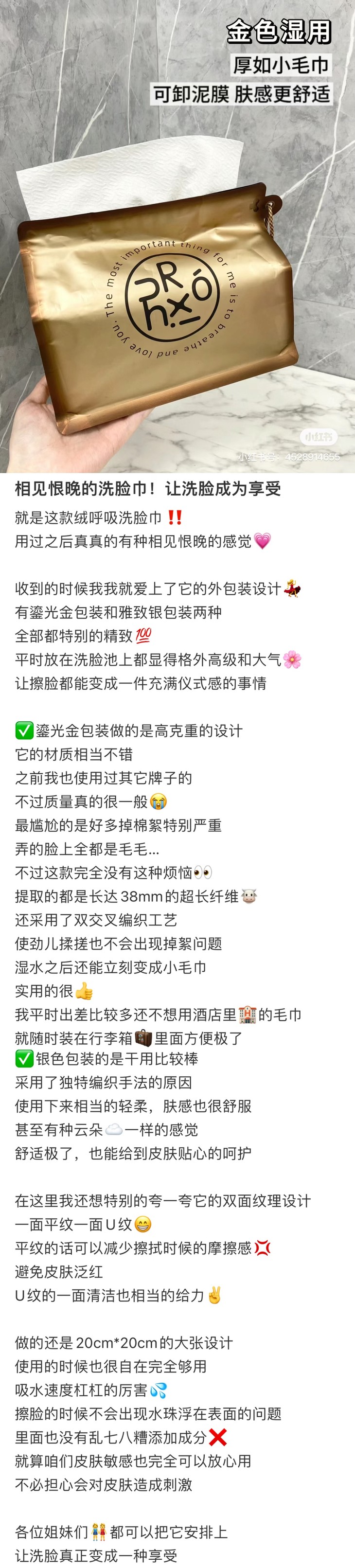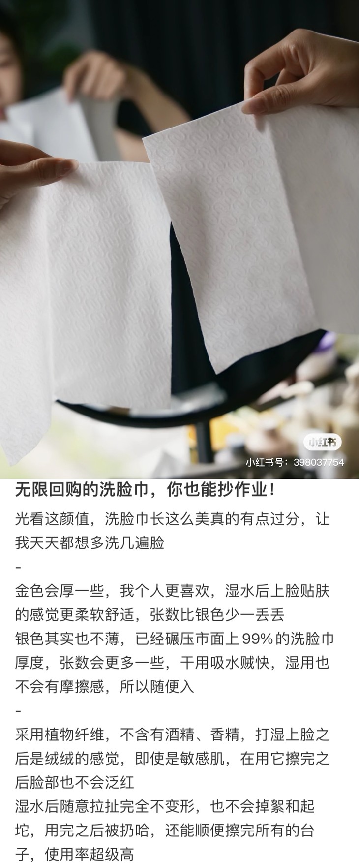 洗脸巾有做了两款,大家可以根据需求挑挑。鎏光金是厚实款,揉搓不起坨,完全可以卸泥膜;雅致银是轻柔款,更软,也更适合敏感肌,细腻轻盈,非常舒适。虽然只是简单的洗脸巾,但细节设计很到位:外包装配有挂绳,可悬挂可摆放;防尘密封条,一用一封,安全卫生;防水外衣,遇水不渗透;颜值也在线,放哪里都好看!我自己是真的十几年没用到毛巾了,架子上空空如也,全都用洗脸巾!