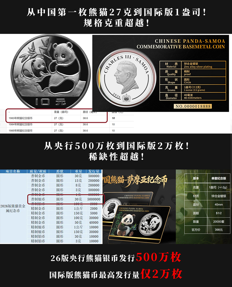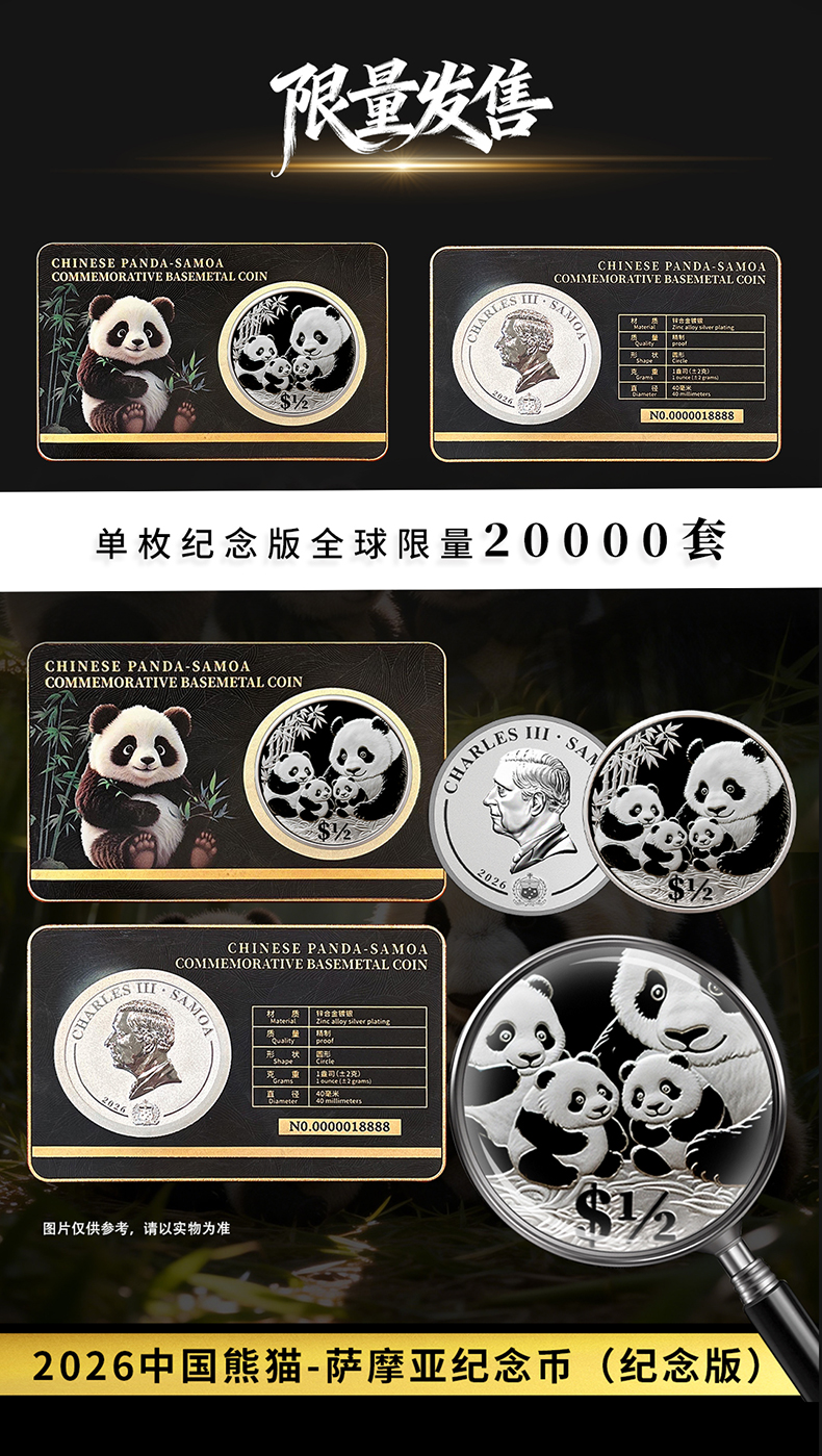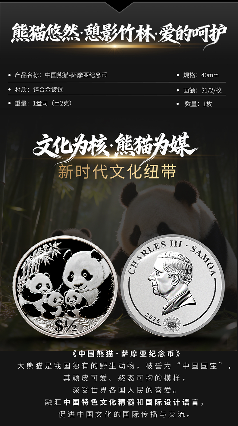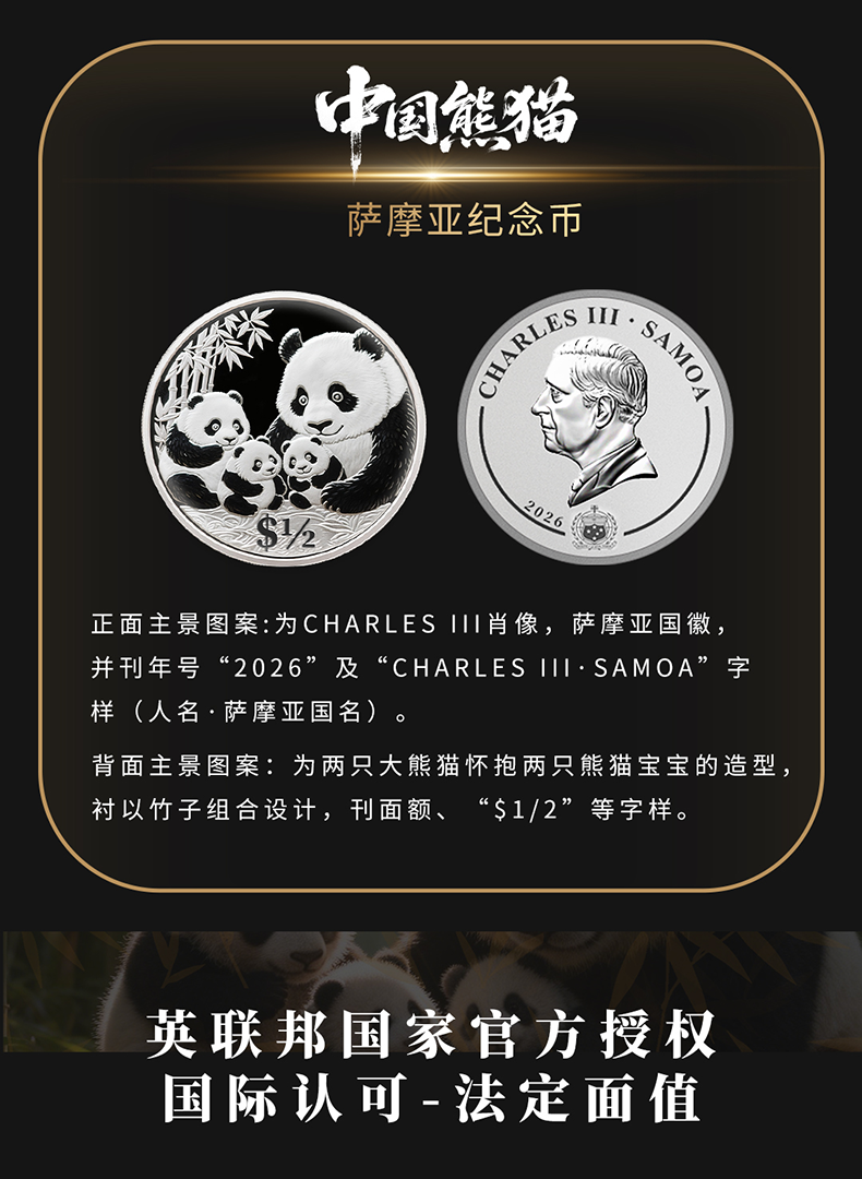 热卖中!!【首枚法定面值国际版熊猫币】2026中国熊猫 - 萨摩亚纪念币