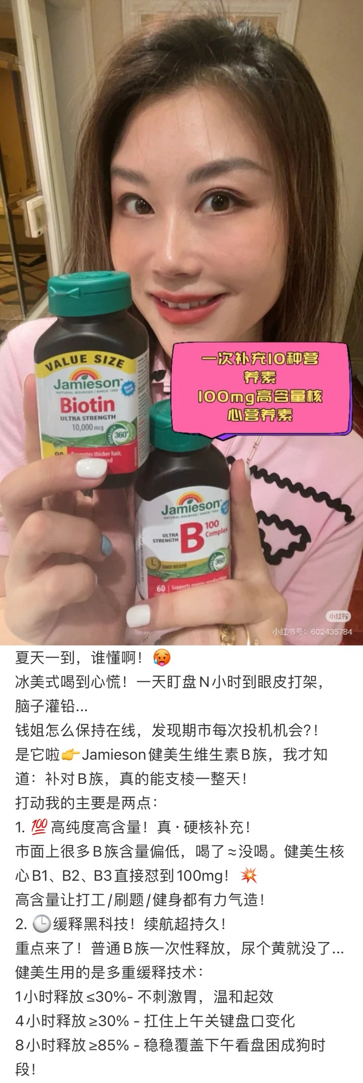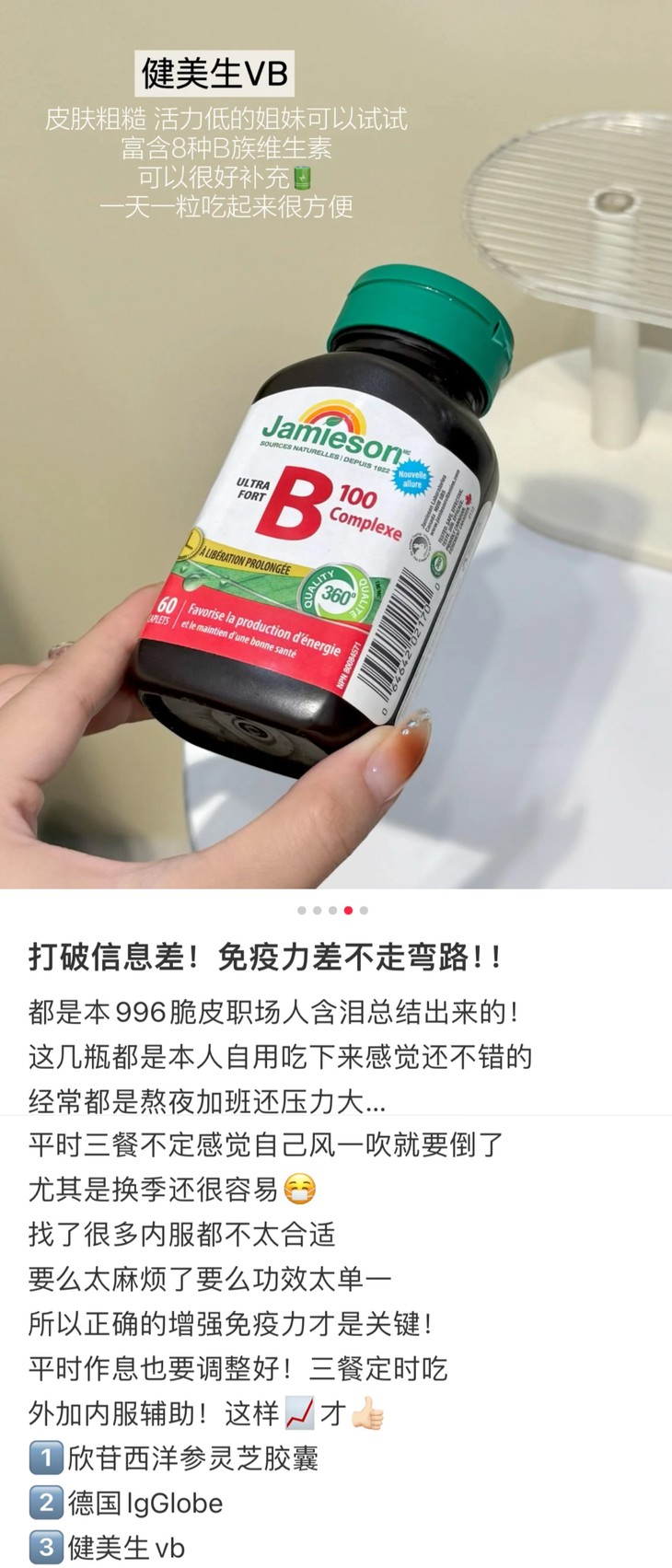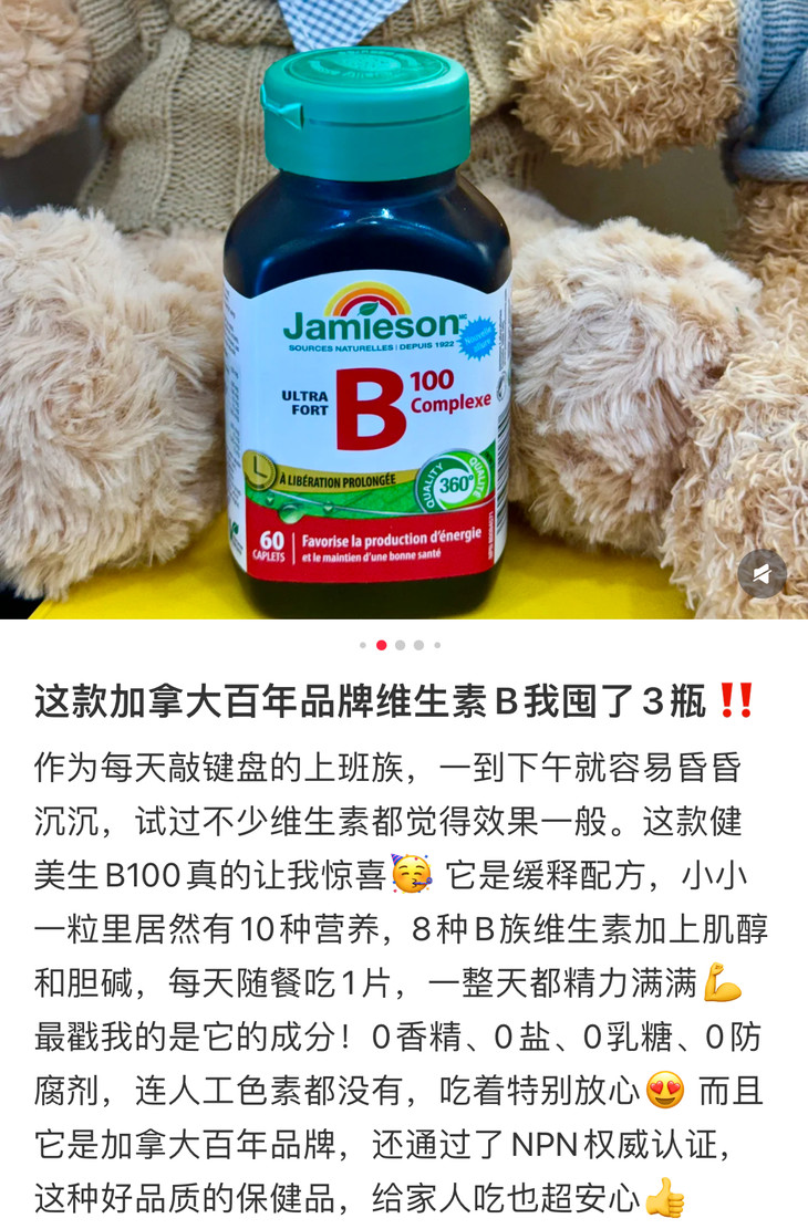 Jamieson健美生的维B缓释片,它里面可不是单一维B,而是足足10种复合营养,从天然酵母里提取的B1、B2、B6、B12,还有叶酸、生物素,再加上专门添加的胆碱和肌醇,协同作用才能把维B的劲儿都发挥出来!最贴心的是它的缓释技术,一天吃1片就能在身体里持续释放6-8小时,早上随餐吃,从上班到下班都能保持元气。而且用的是干粉直压工艺,能避开光、水、热对维B的破坏,保留更多营养。成分也干净,0乳糖、0防腐剂、0香精、0麸质,连淀粉都没有,非转基因原料,对敏感人群也友好,从原料到成品要过360道检测,还拿到了加拿大卫生部认证,放心吃!