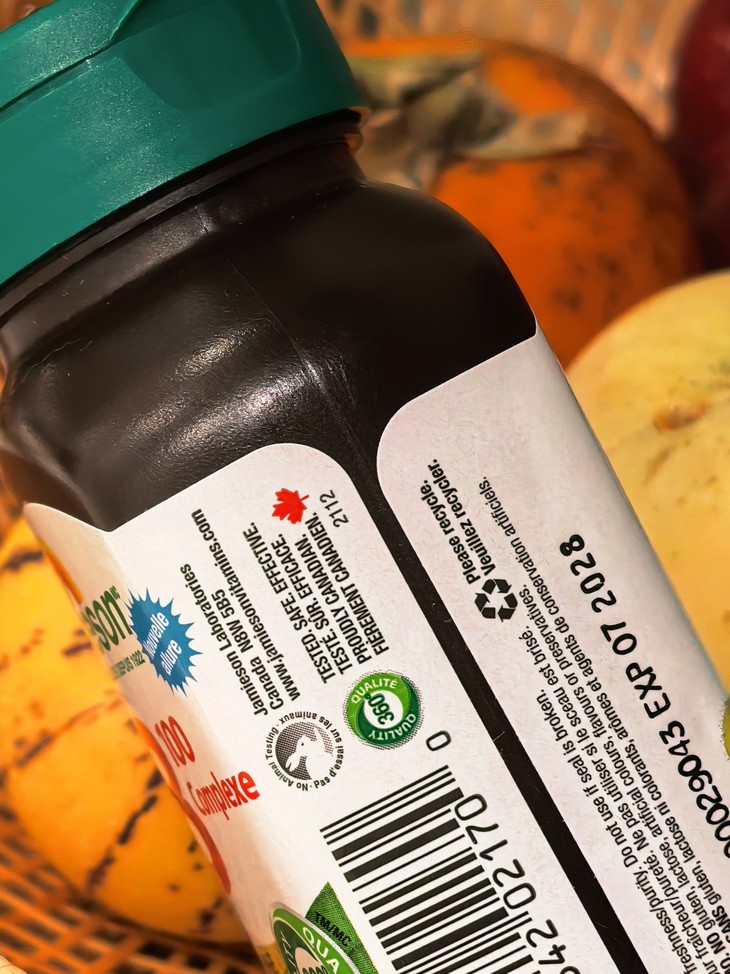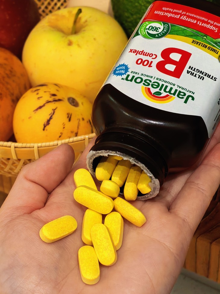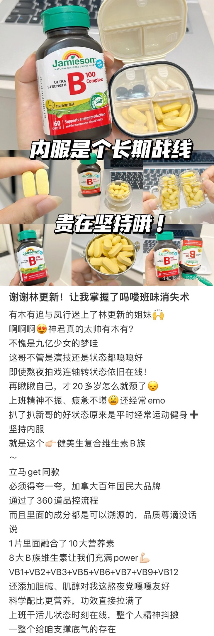 我这几年是都有补维B复合的,为了皮肤,不过都是吃医院配的小黄片儿。最近学完营养学后,也有仔细研究研究,又优化了下,换成了Jamieson健美生的缓释维B片,比较好的一点是,量真的足,还有多一个维B12,一天1片就能搞定每日必须!