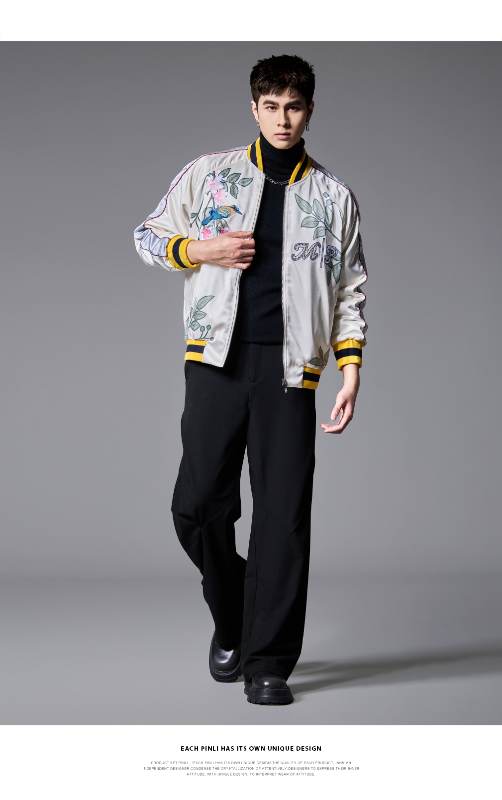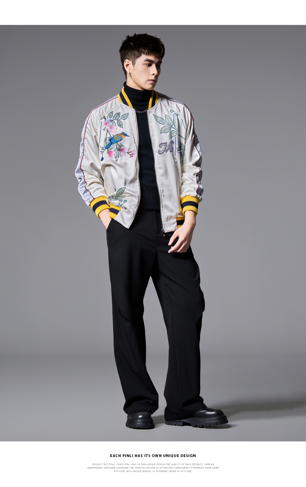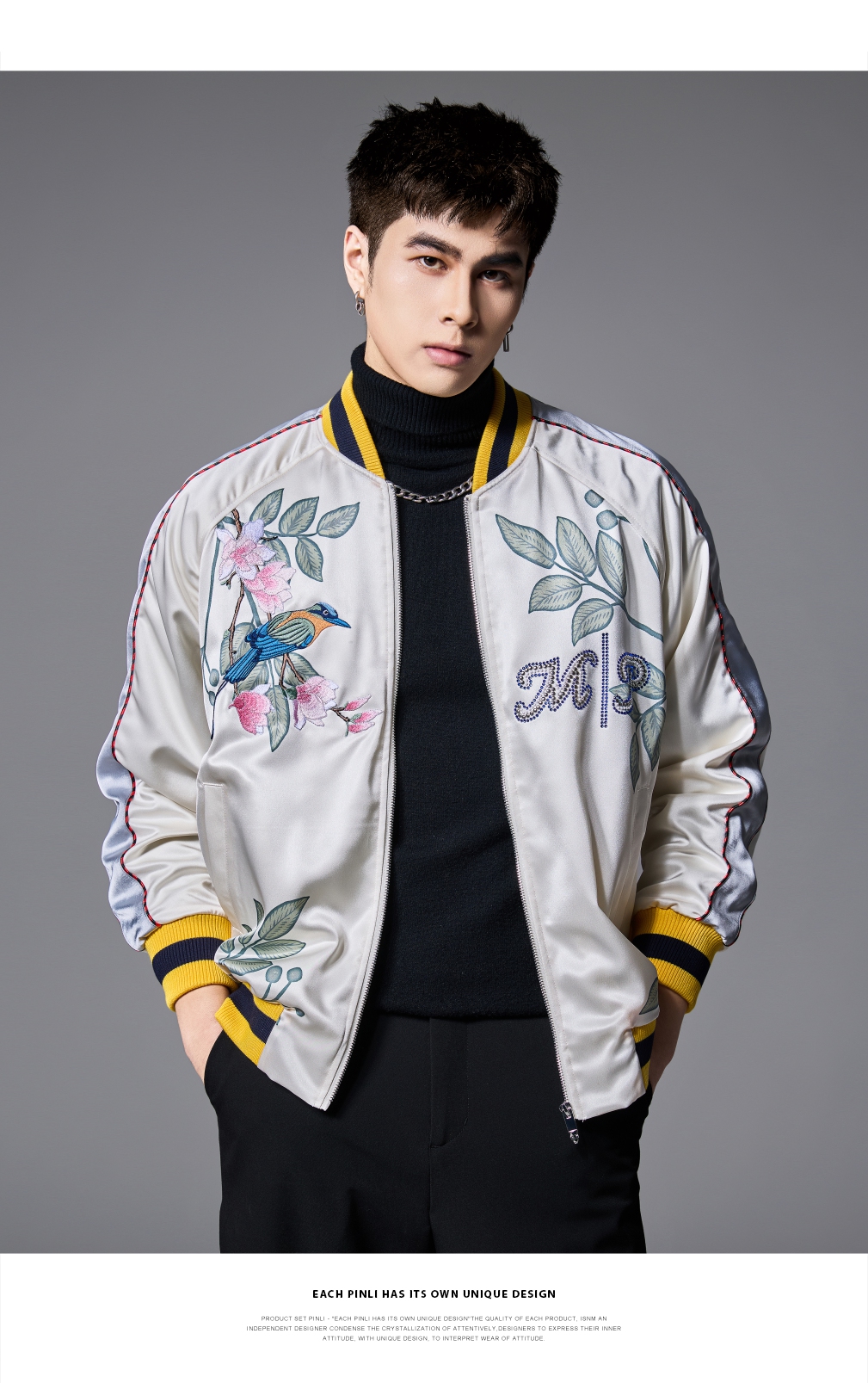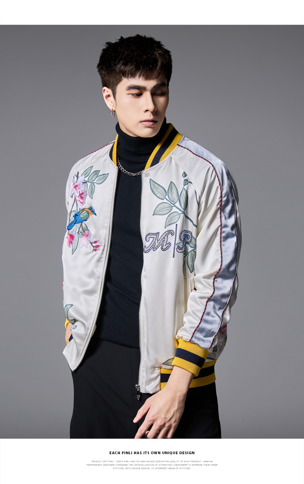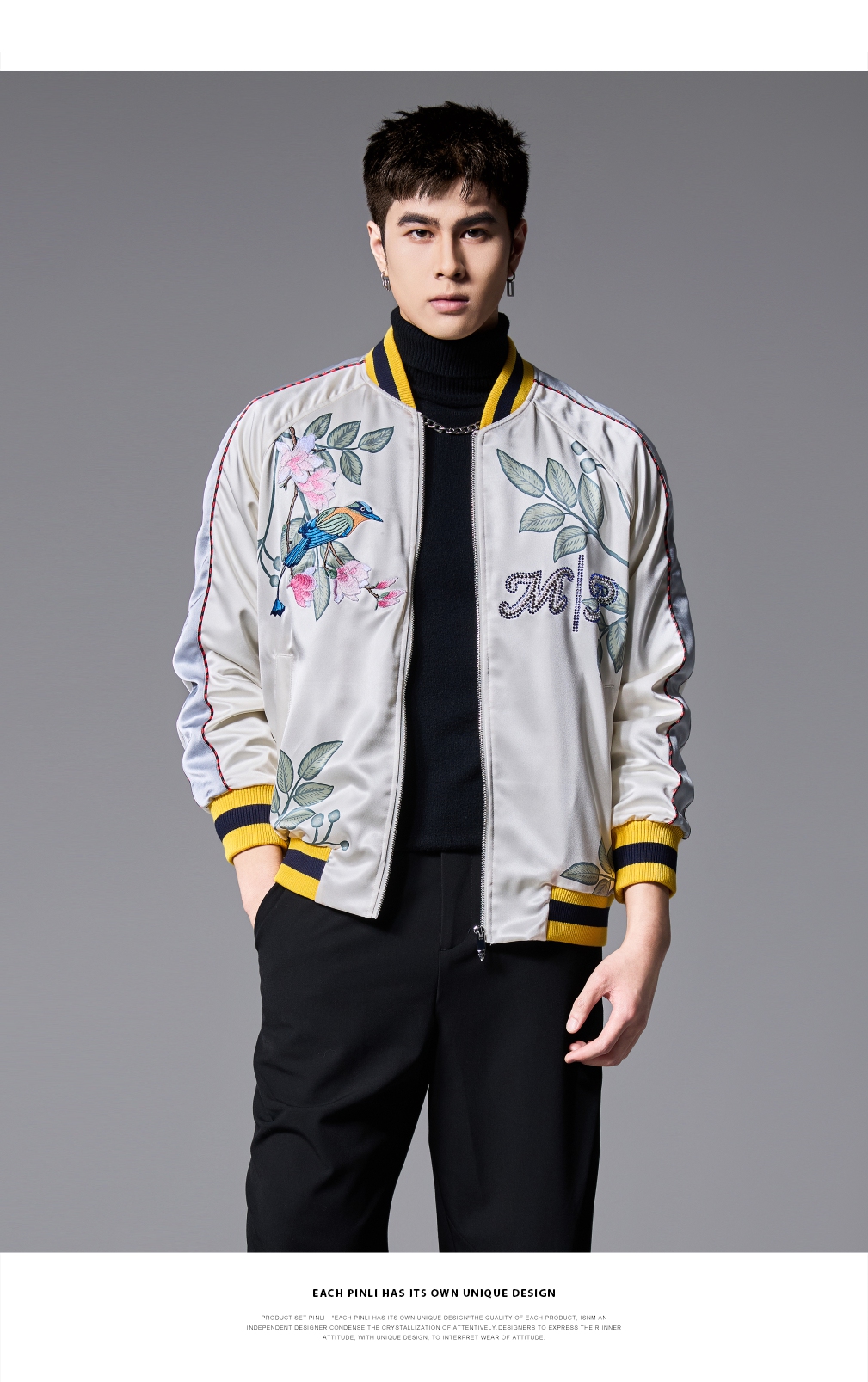 PINLI品立春季新品重工刺绣烫钻棒球服男士潮牌宽松夹克外套B252104055