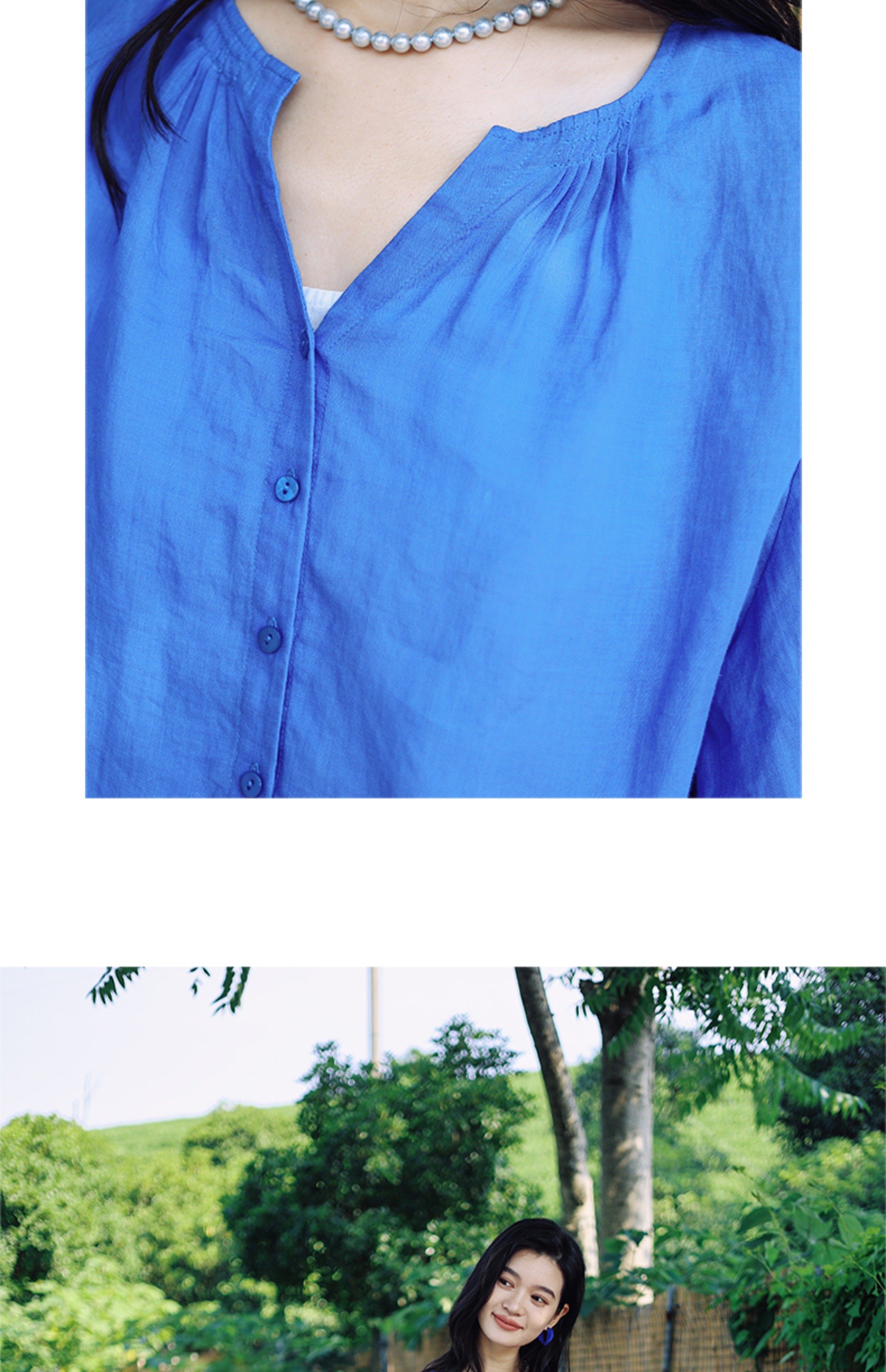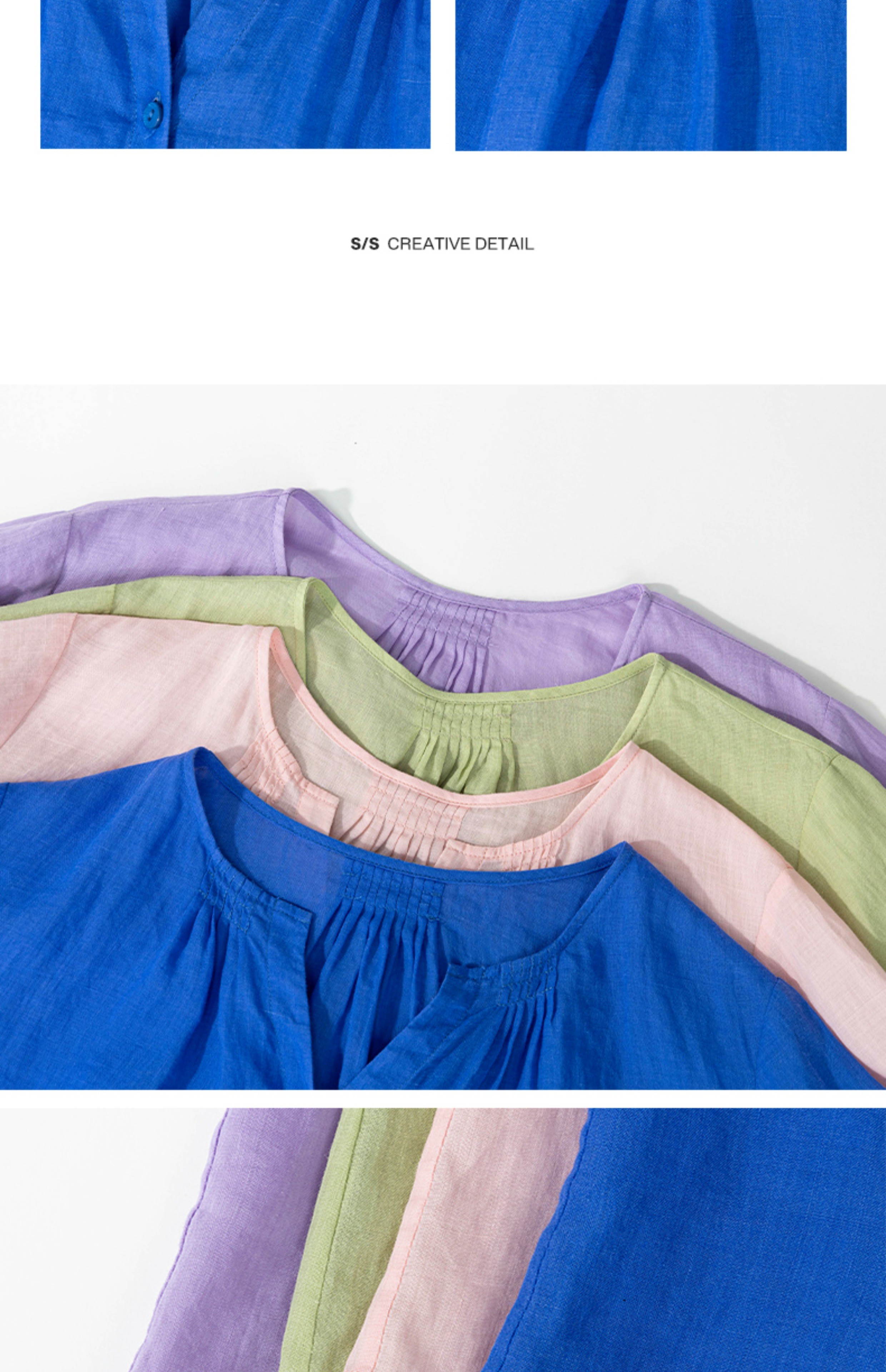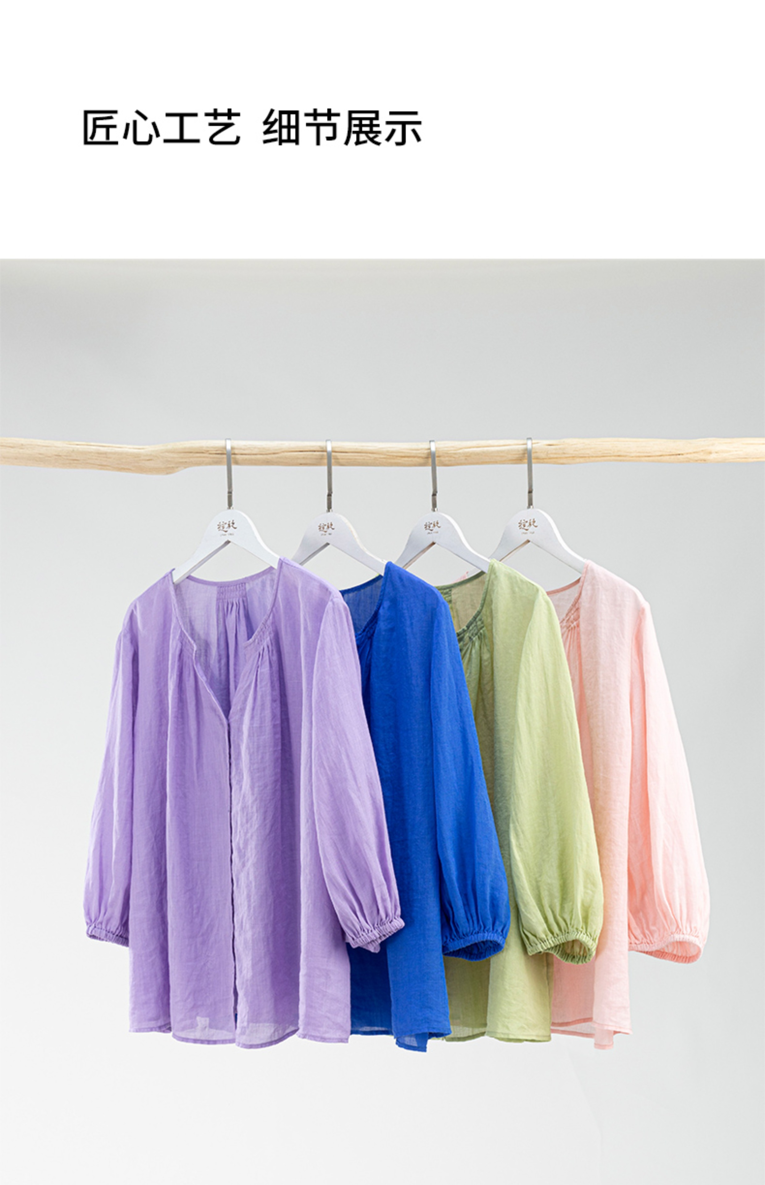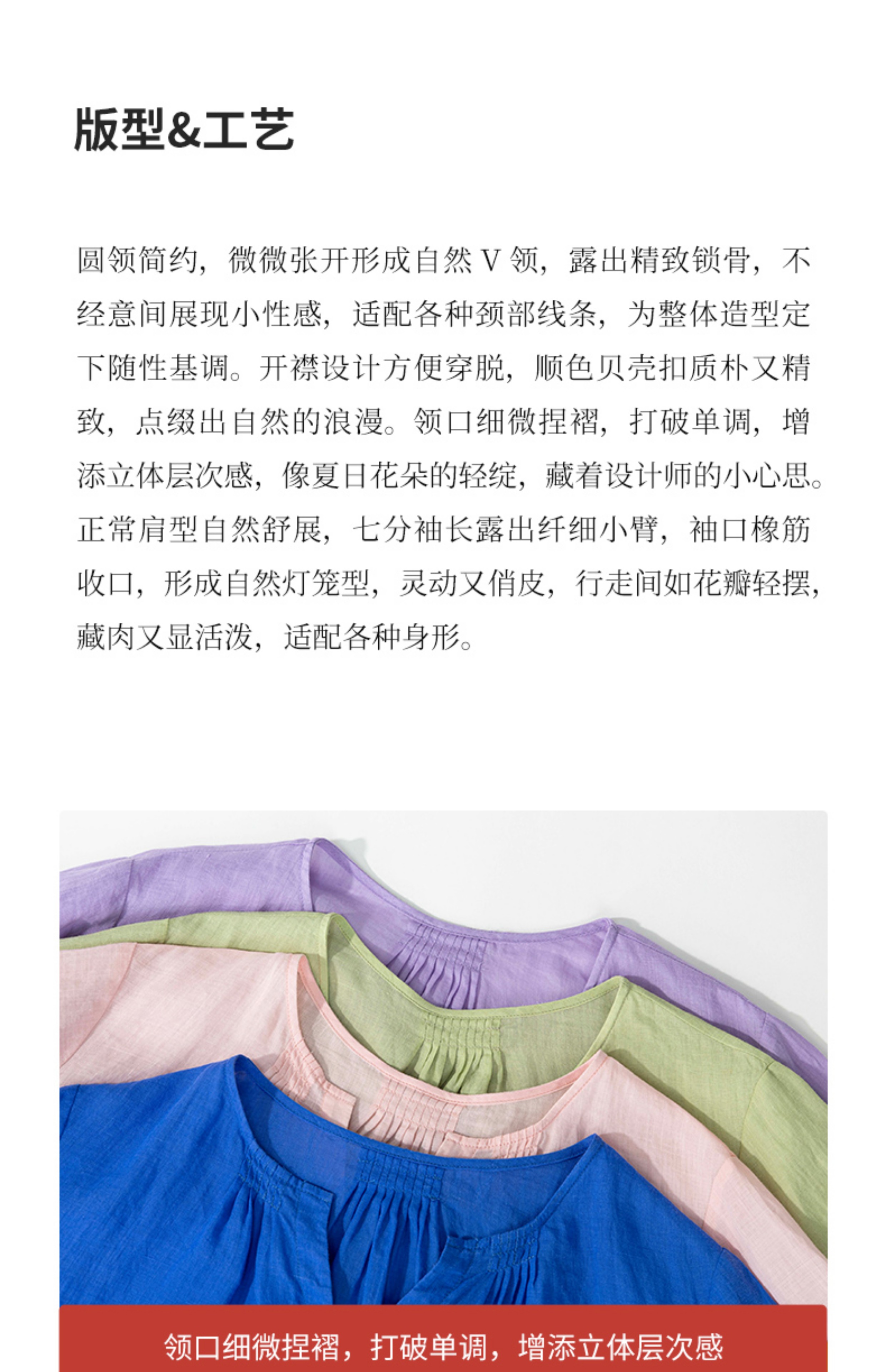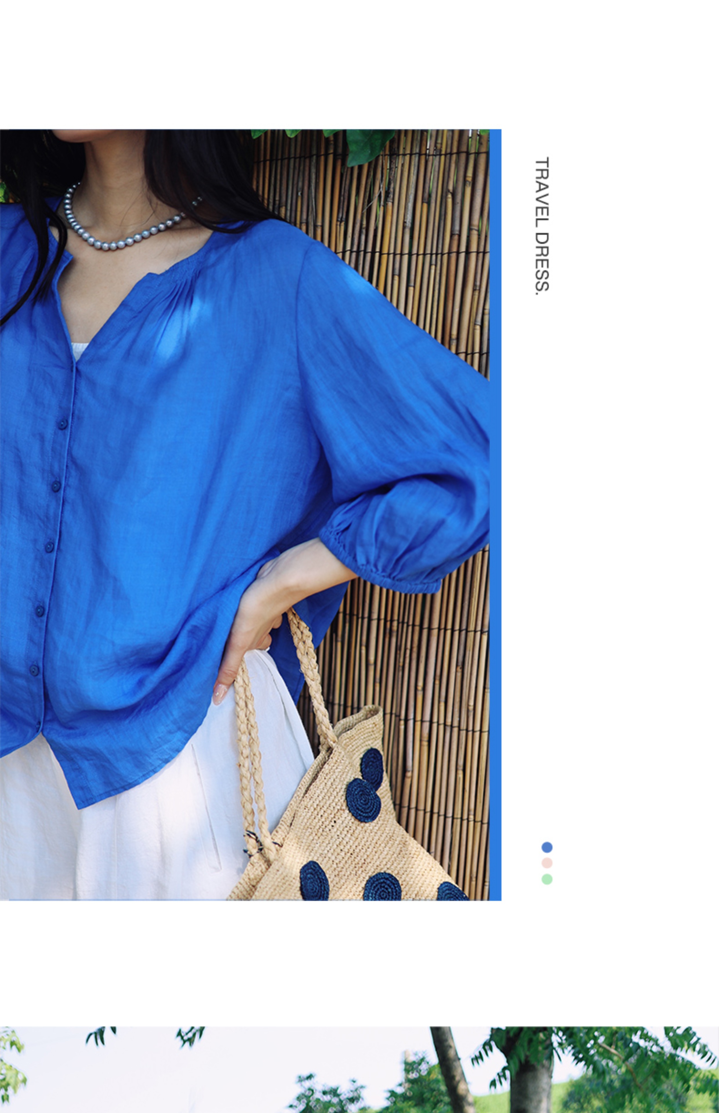 绽放388朵/【多巴胺】高支苎麻v领防晒小衫开门襟塔克七分袖衬衫