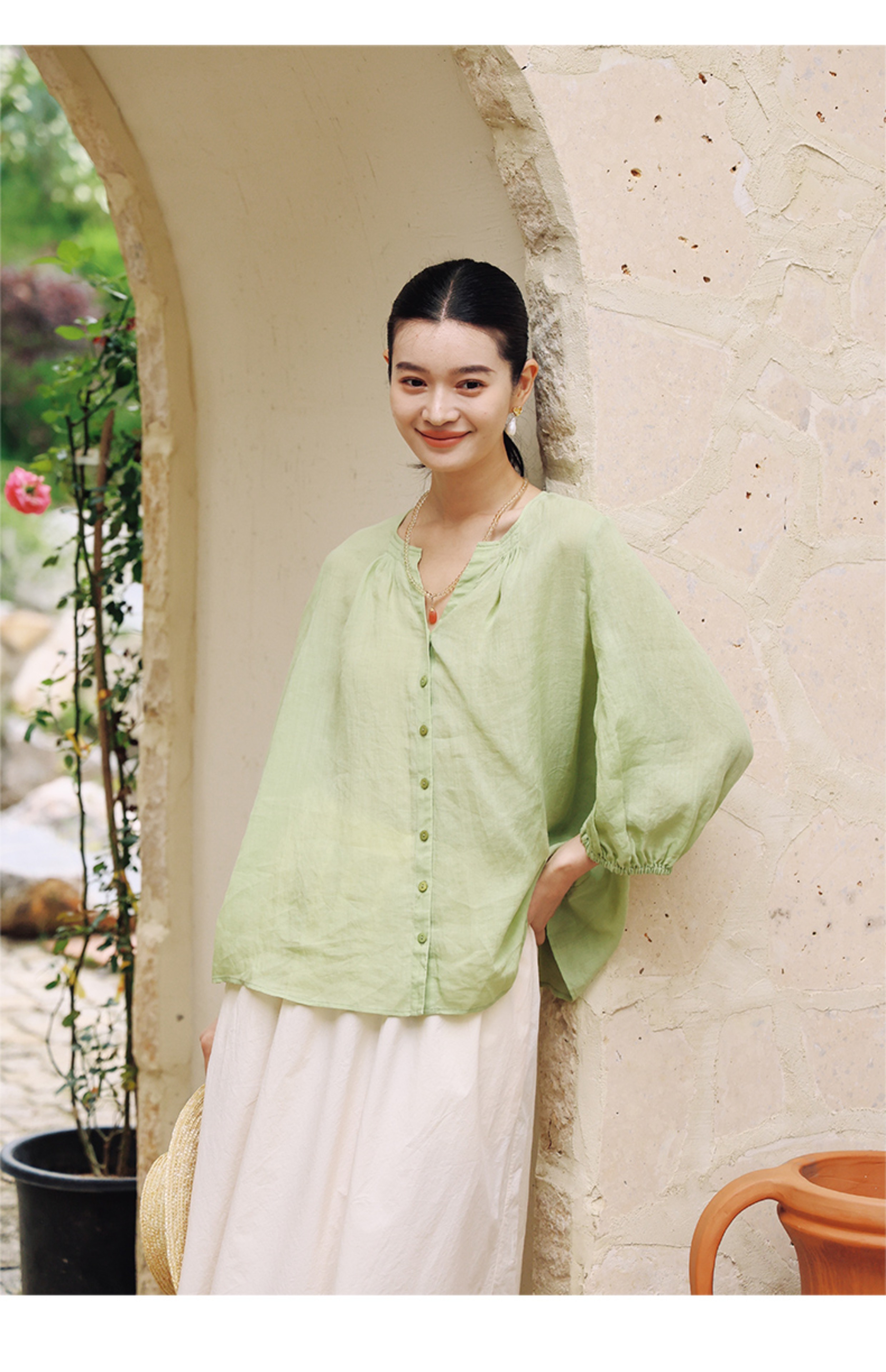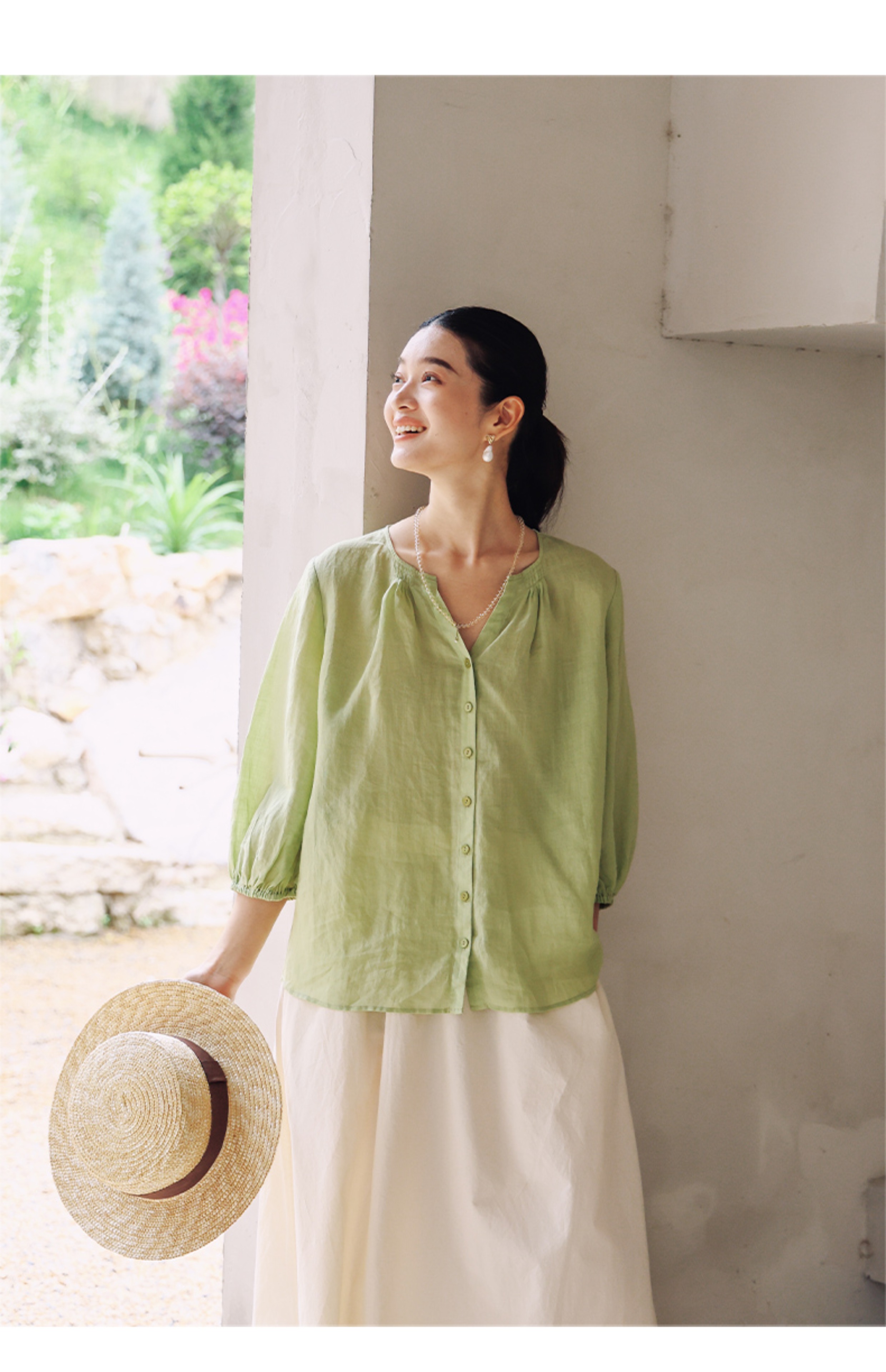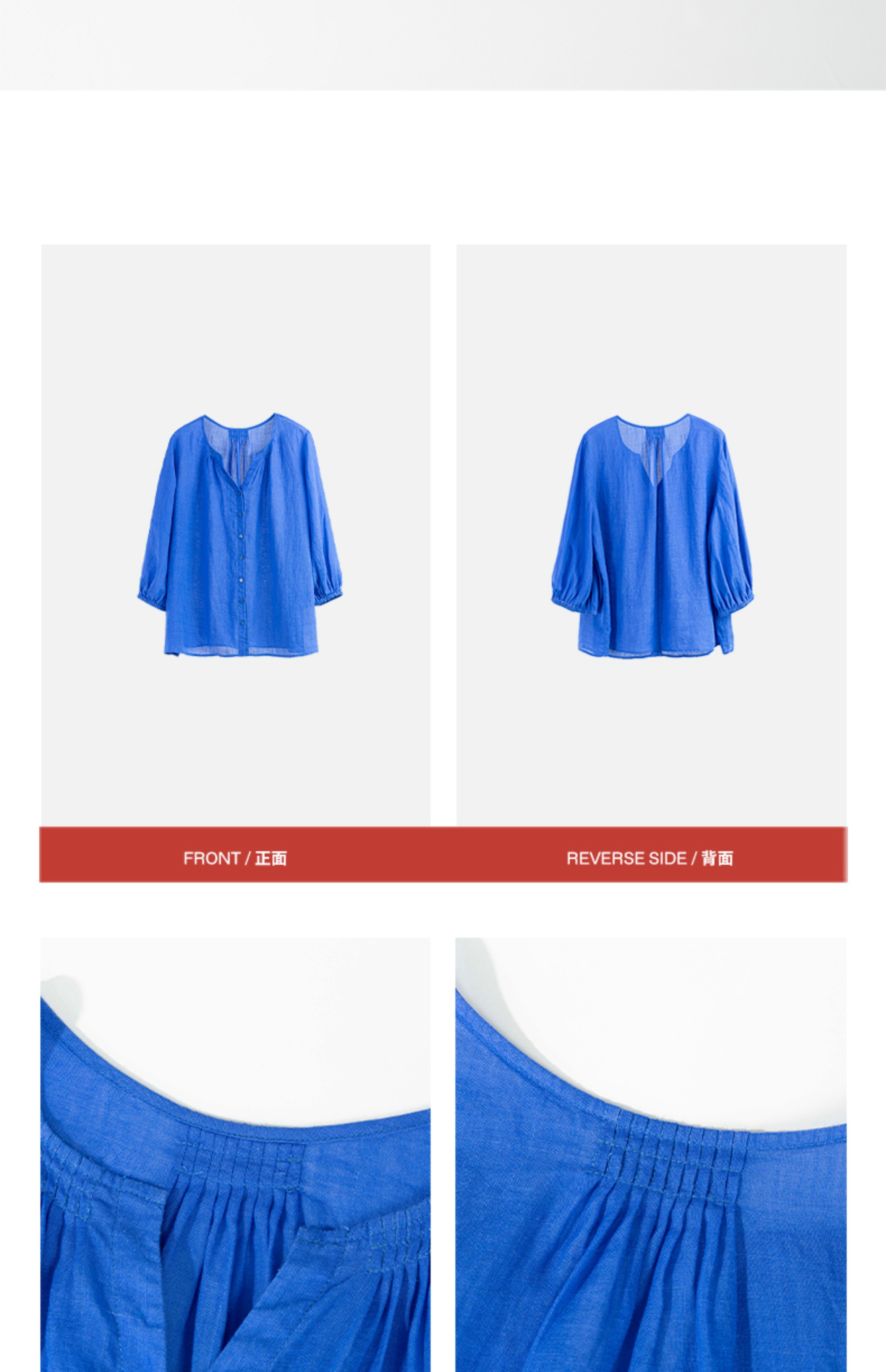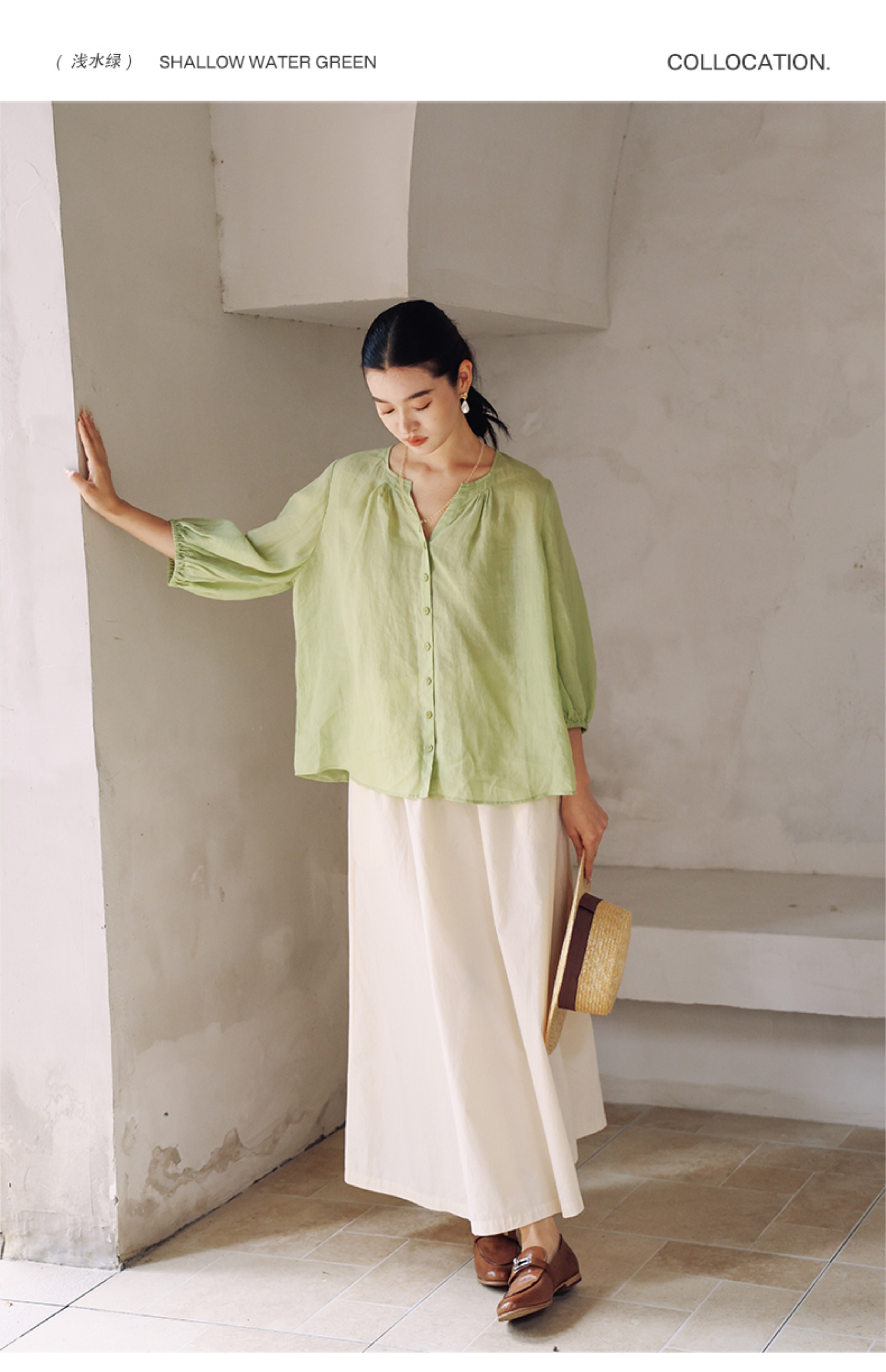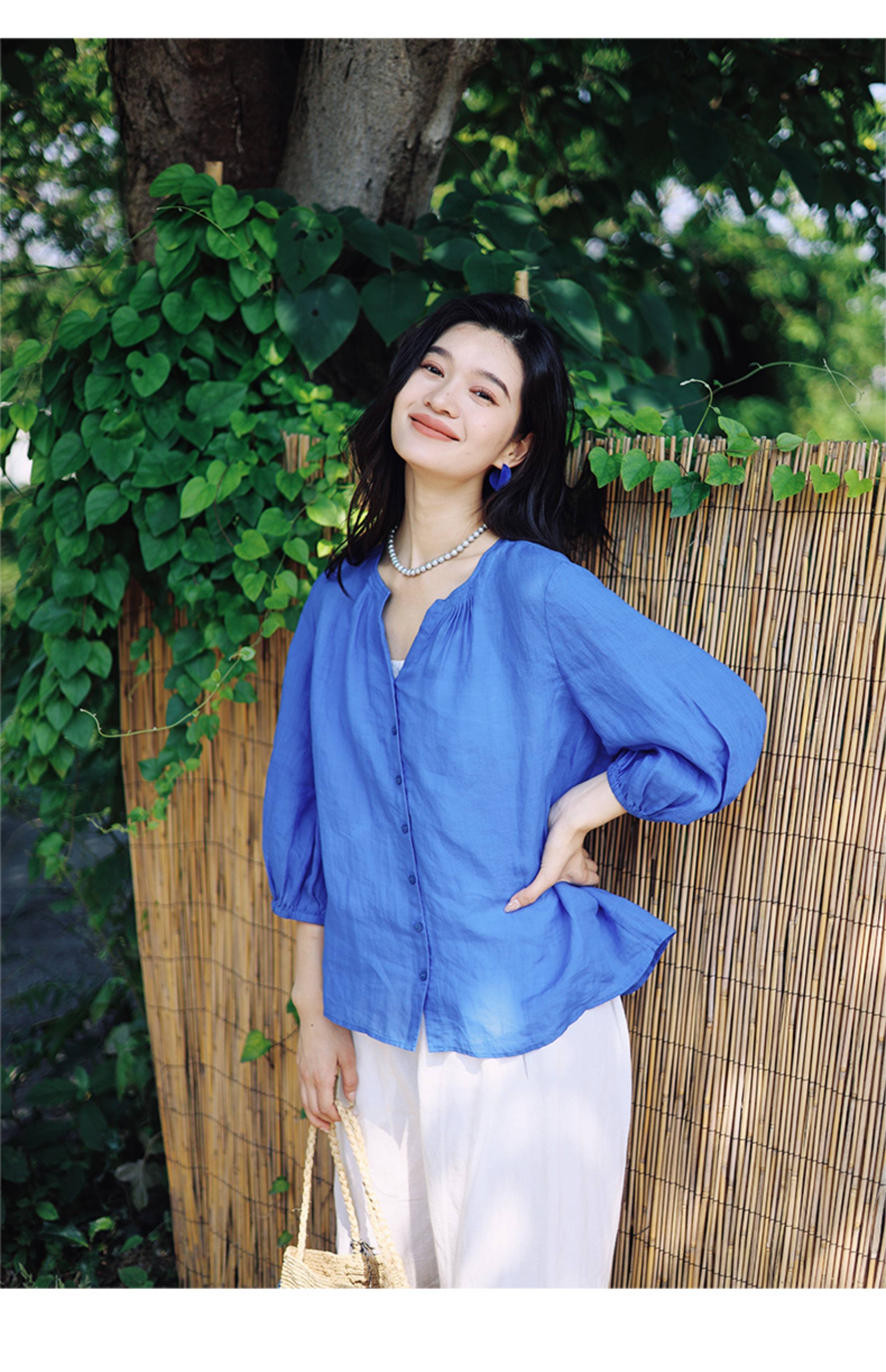 绽放388朵/【多巴胺】高支苎麻v领防晒小衫开门襟塔克七分袖衬衫