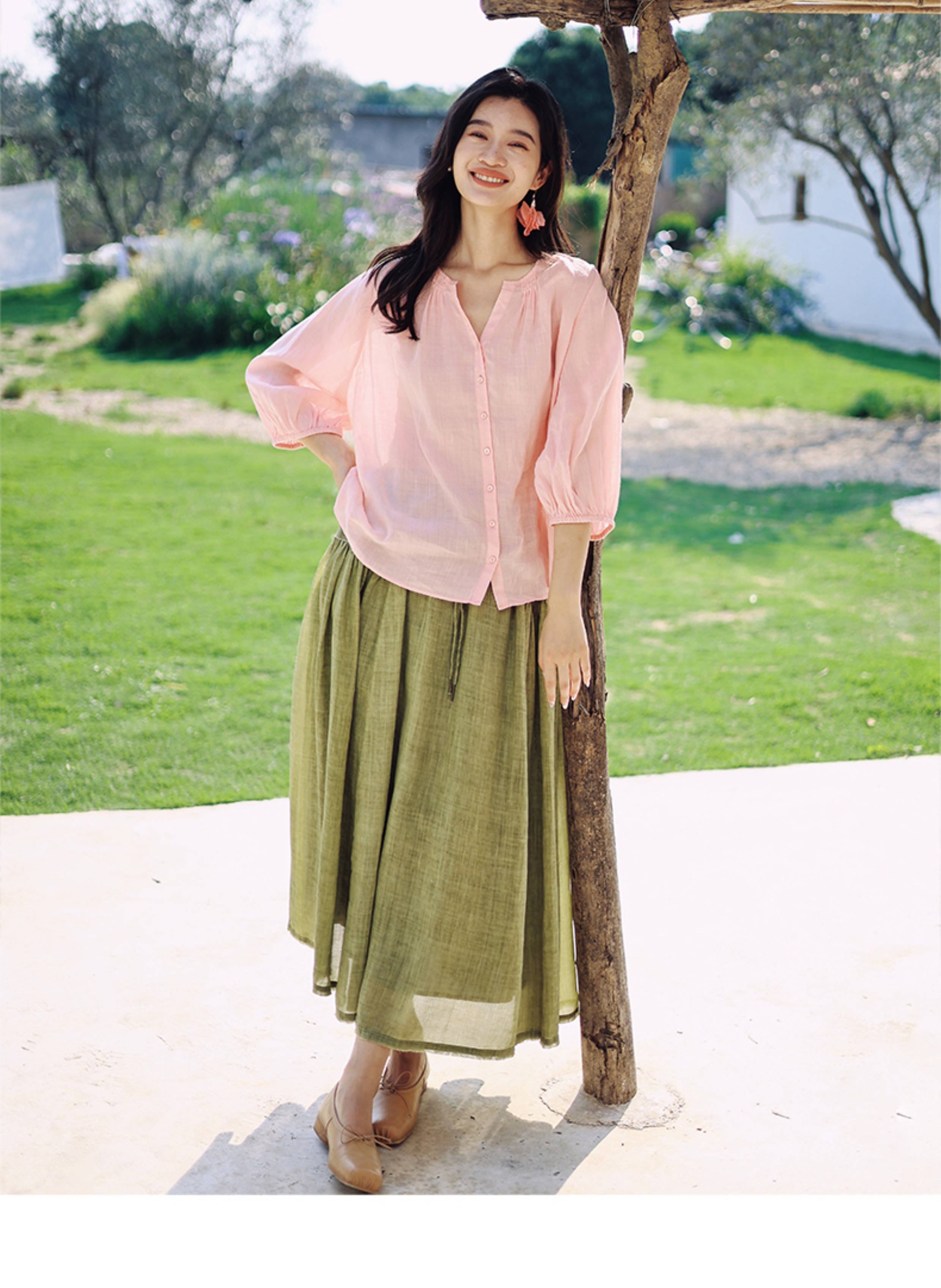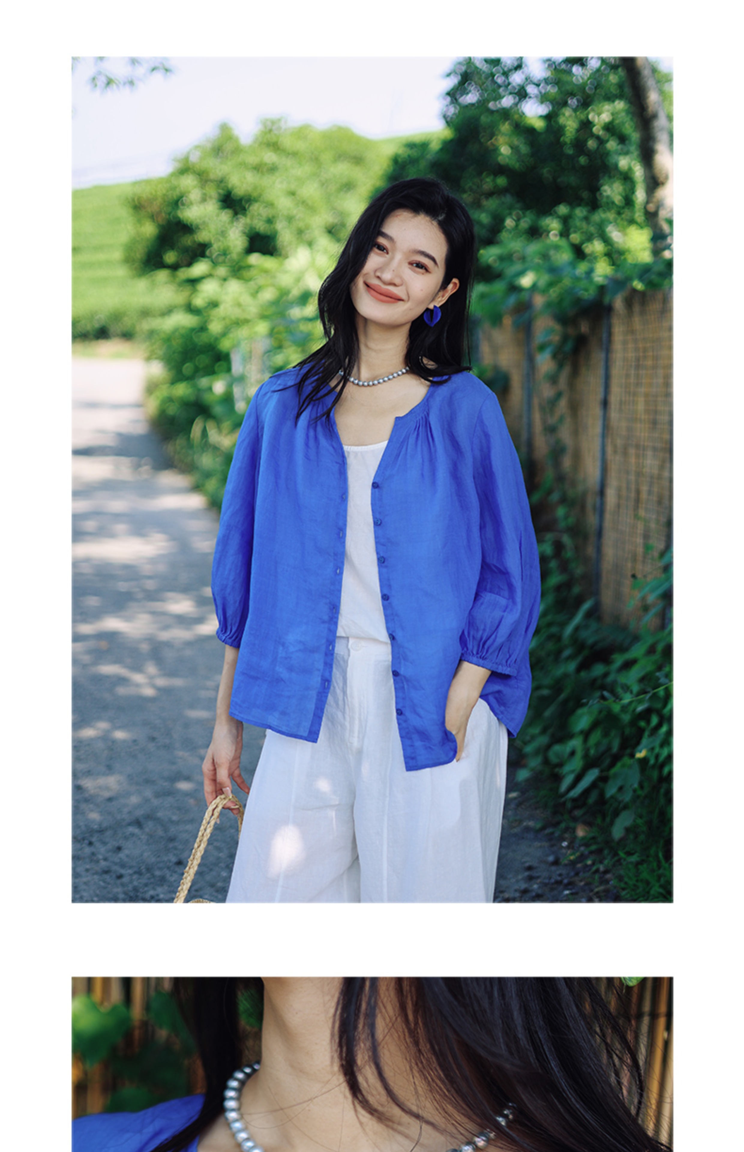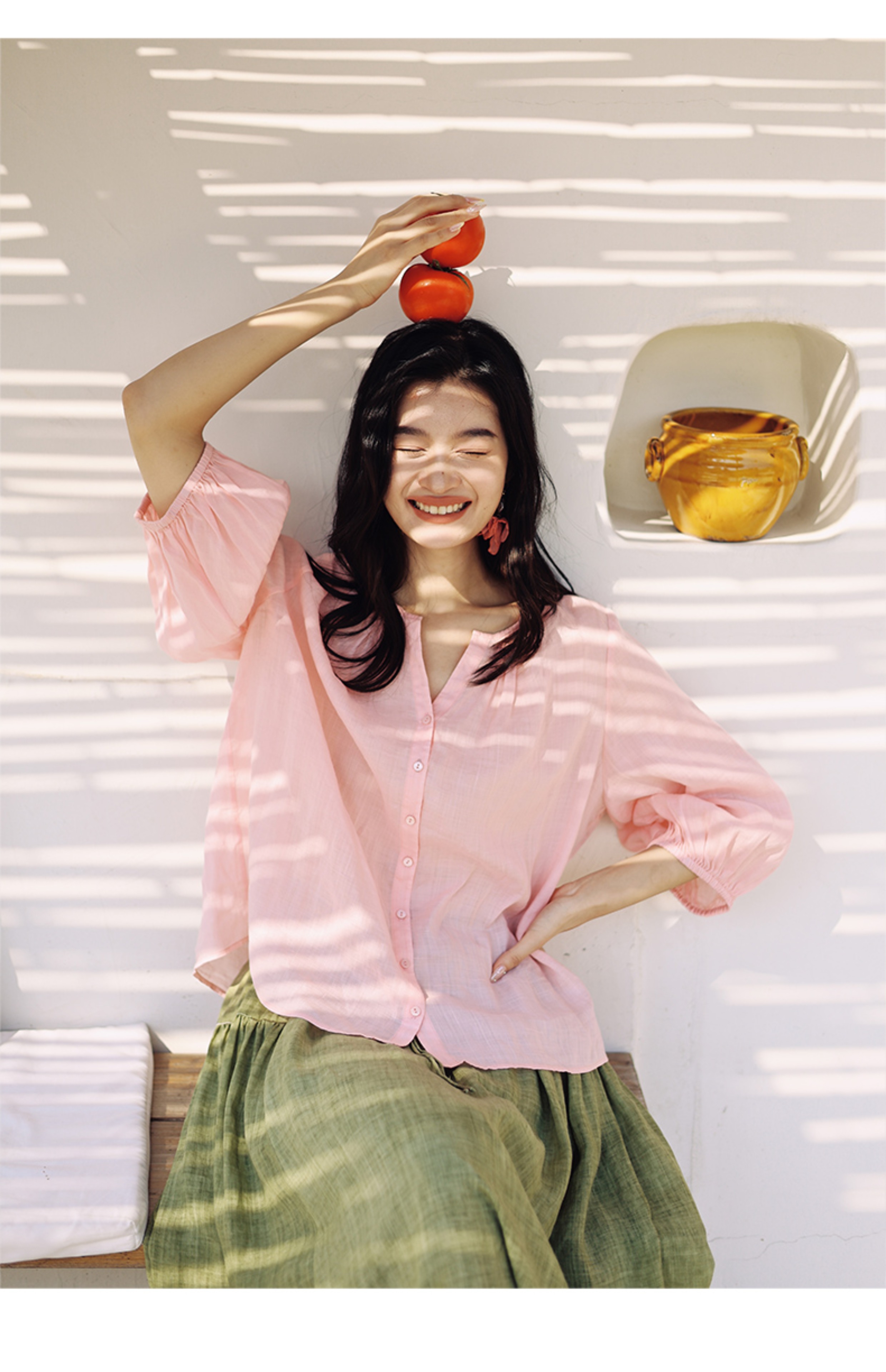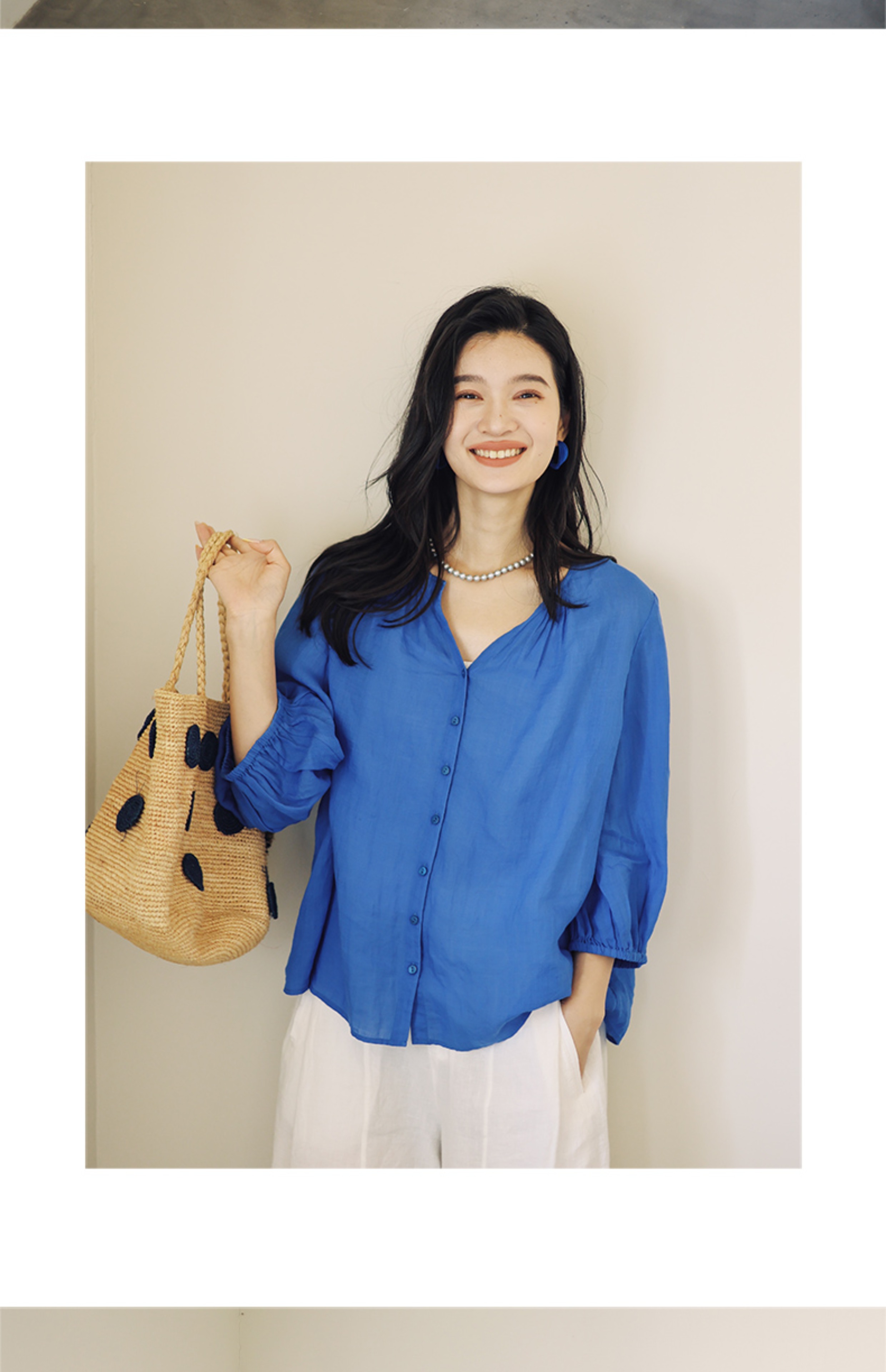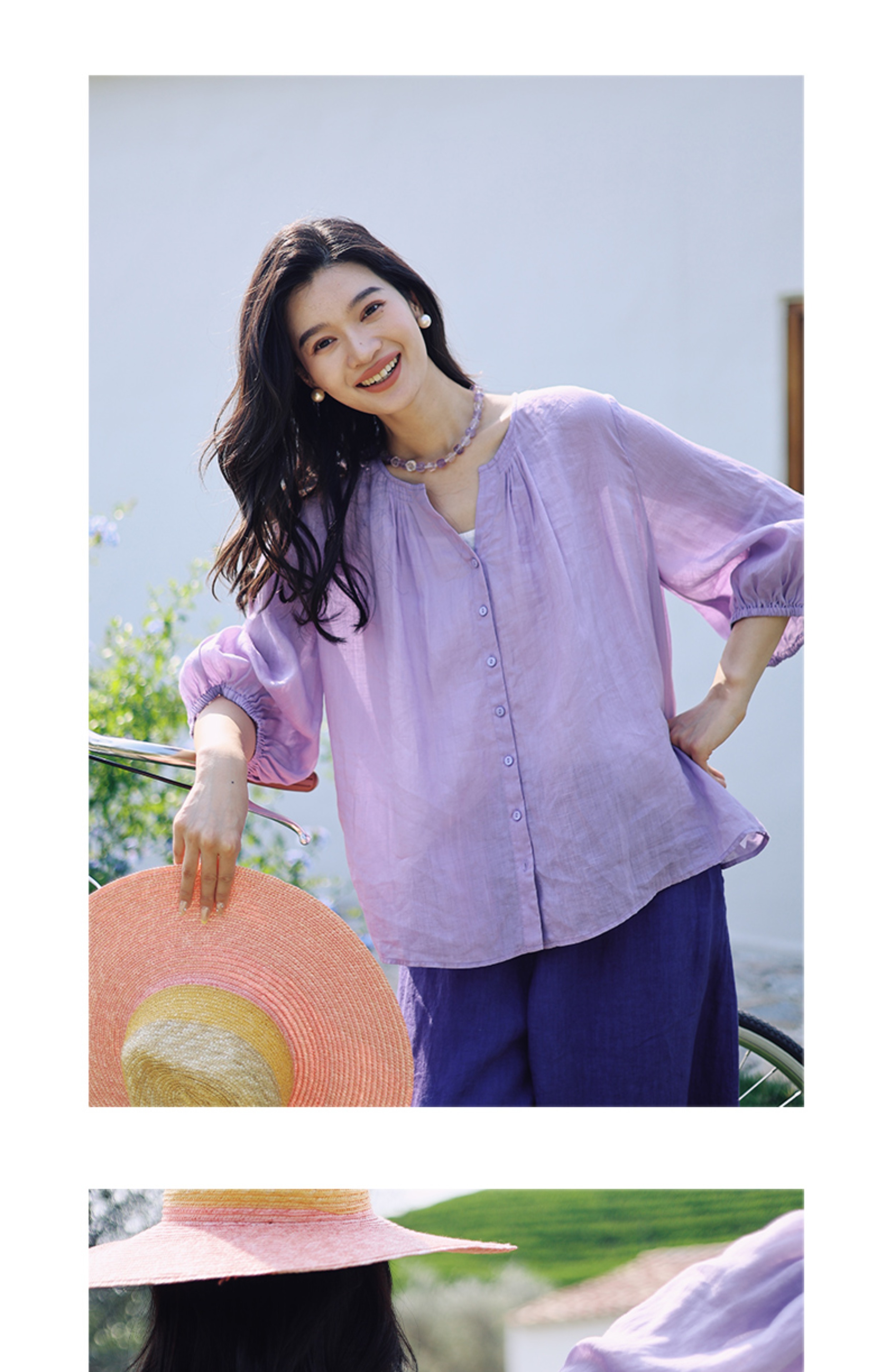 绽放388朵/【多巴胺】高支苎麻v领防晒小衫开门襟塔克七分袖衬衫