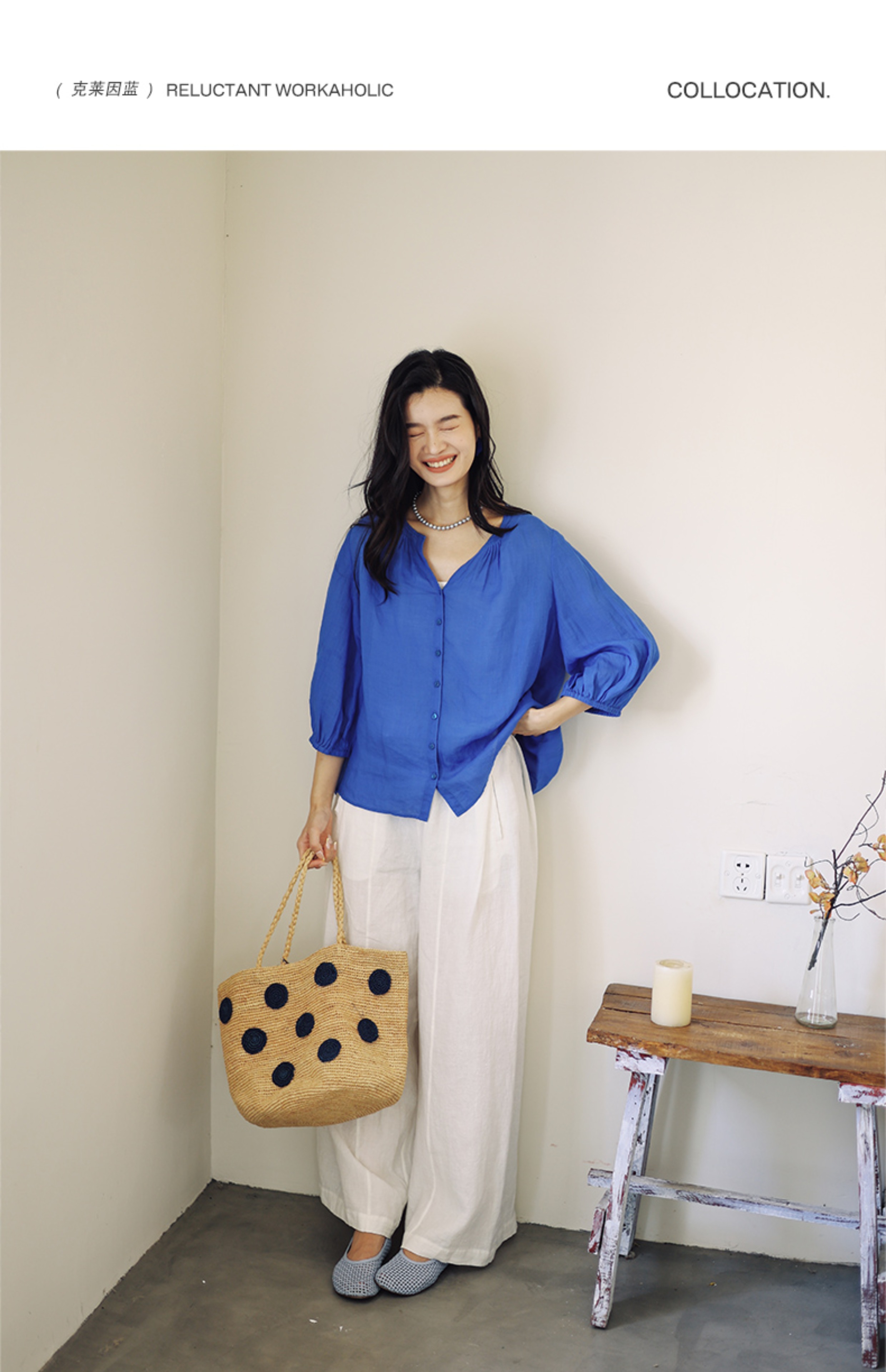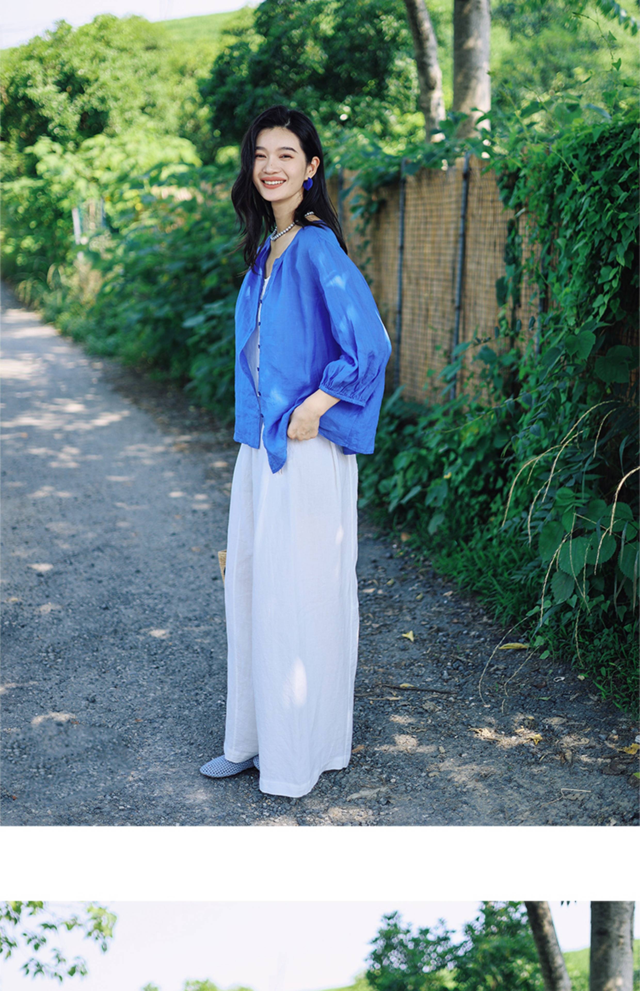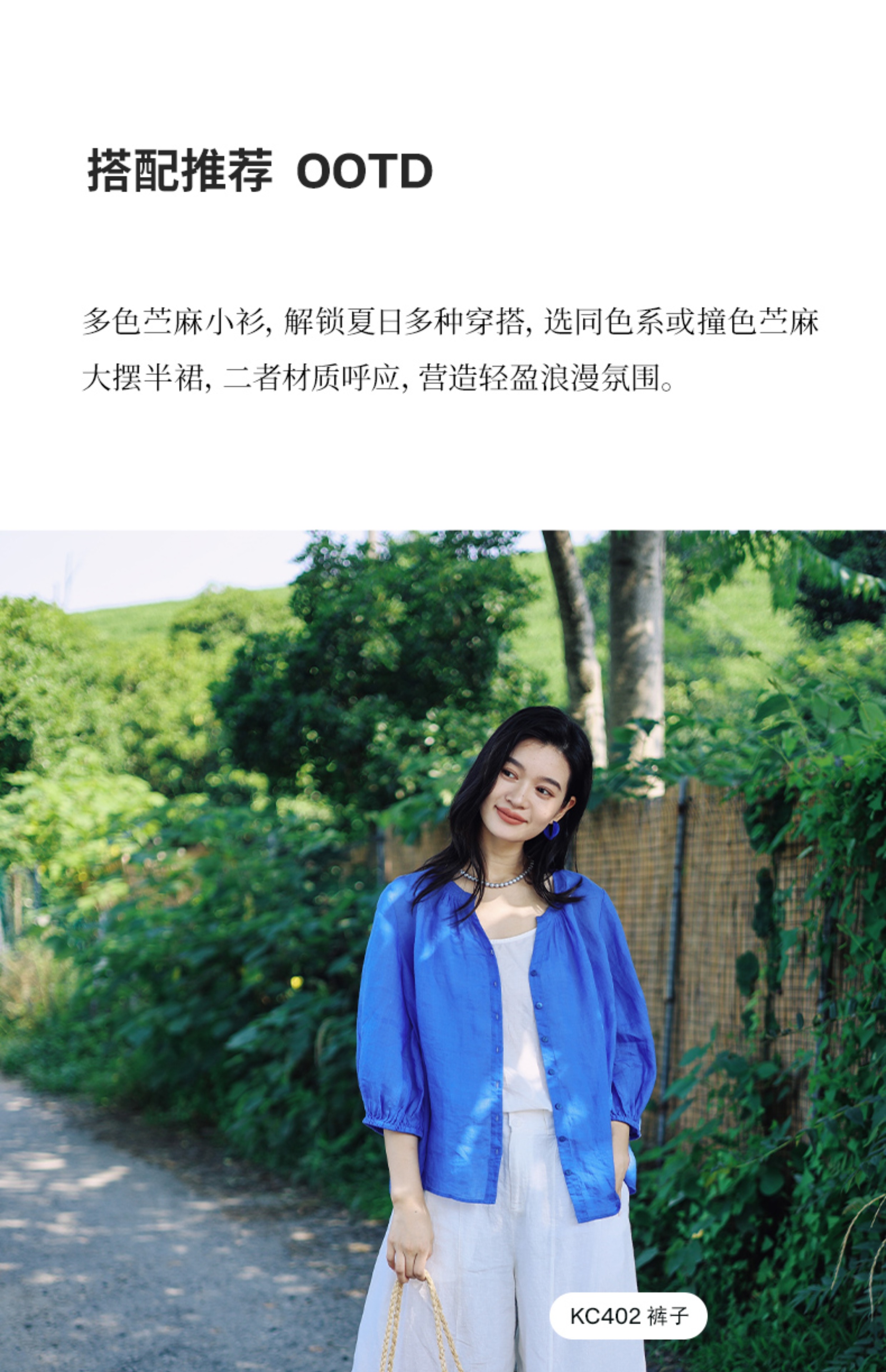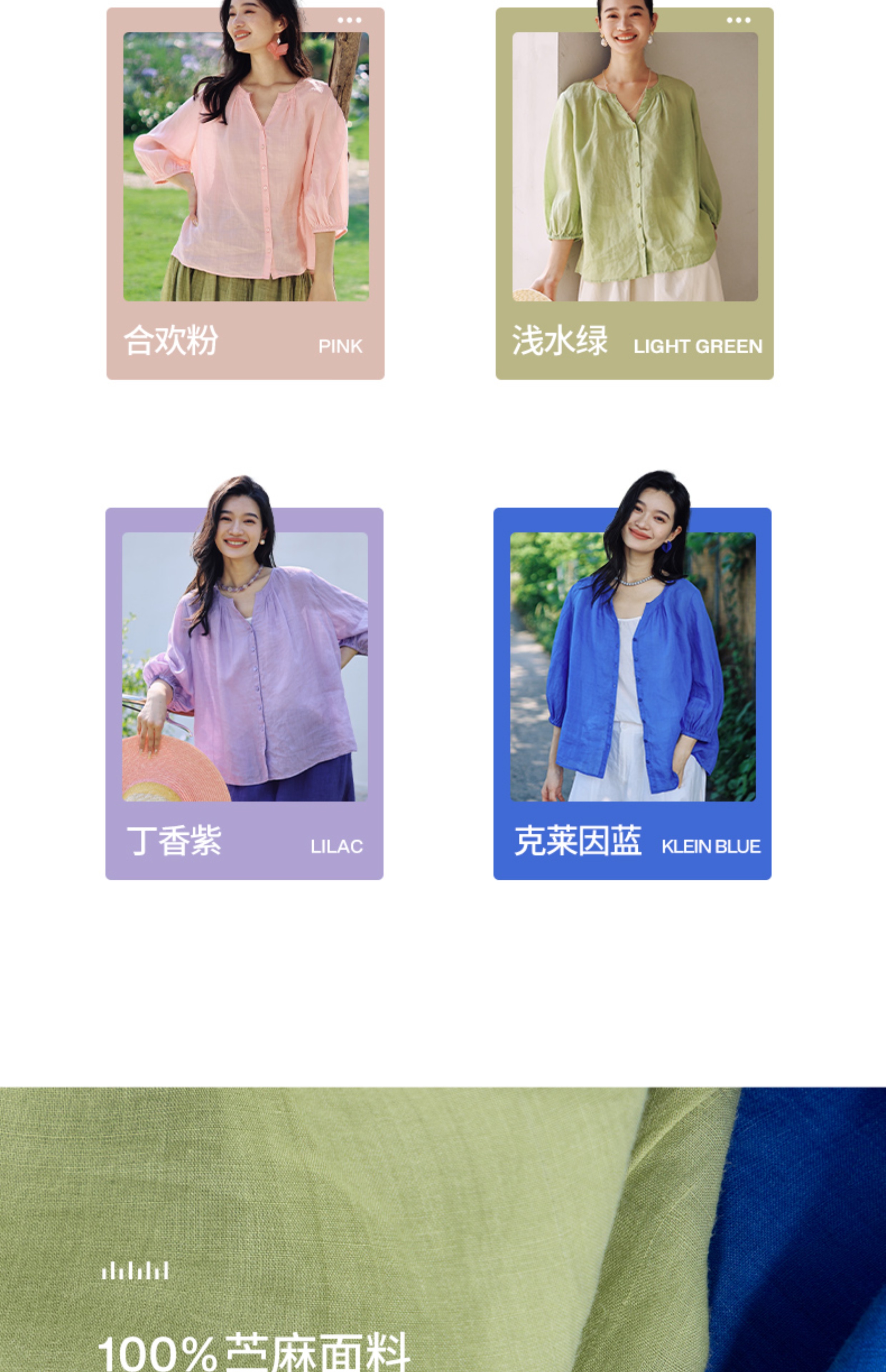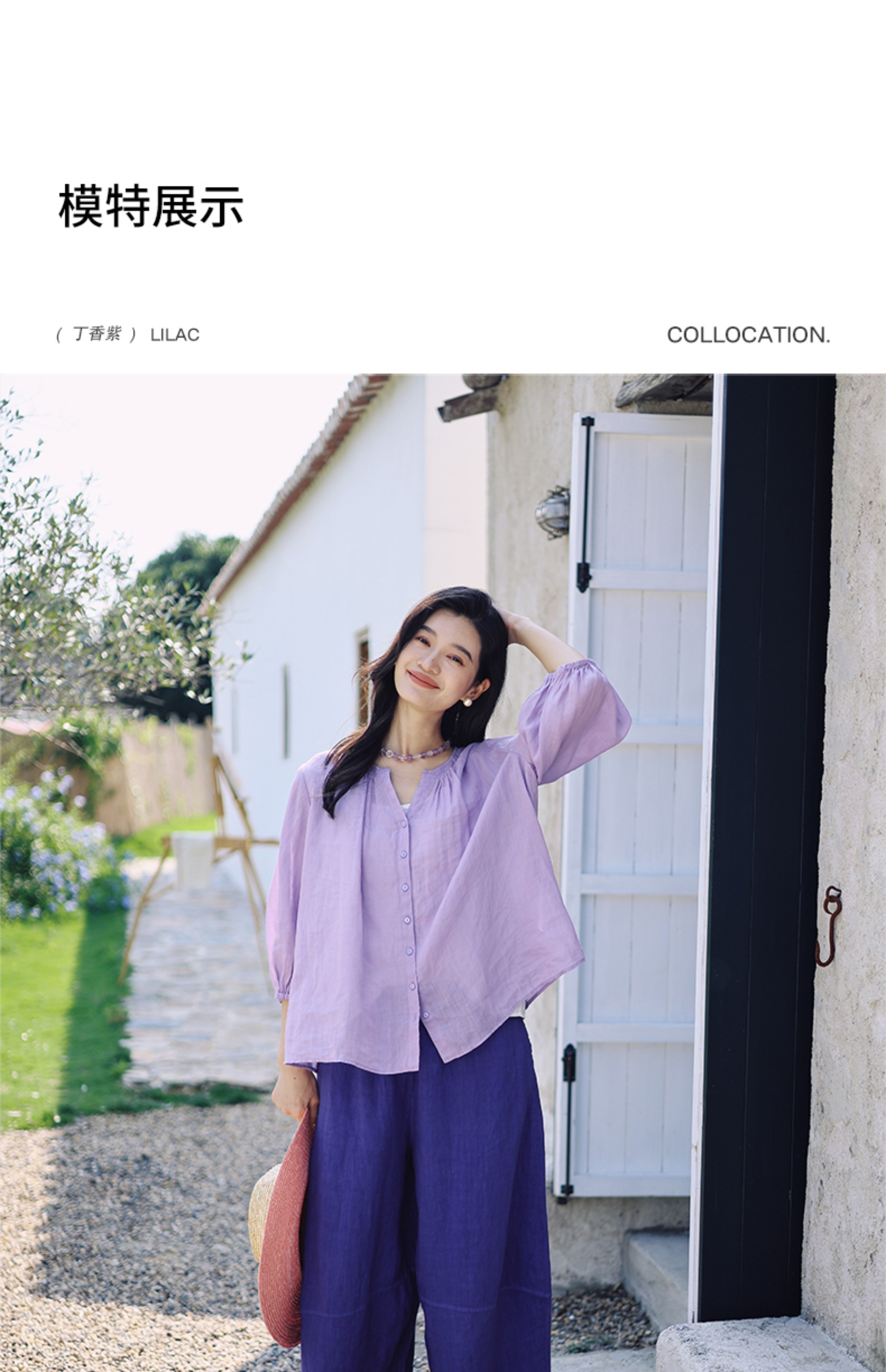 绽放388朵/【多巴胺】高支苎麻v领防晒小衫开门襟塔克七分袖衬衫