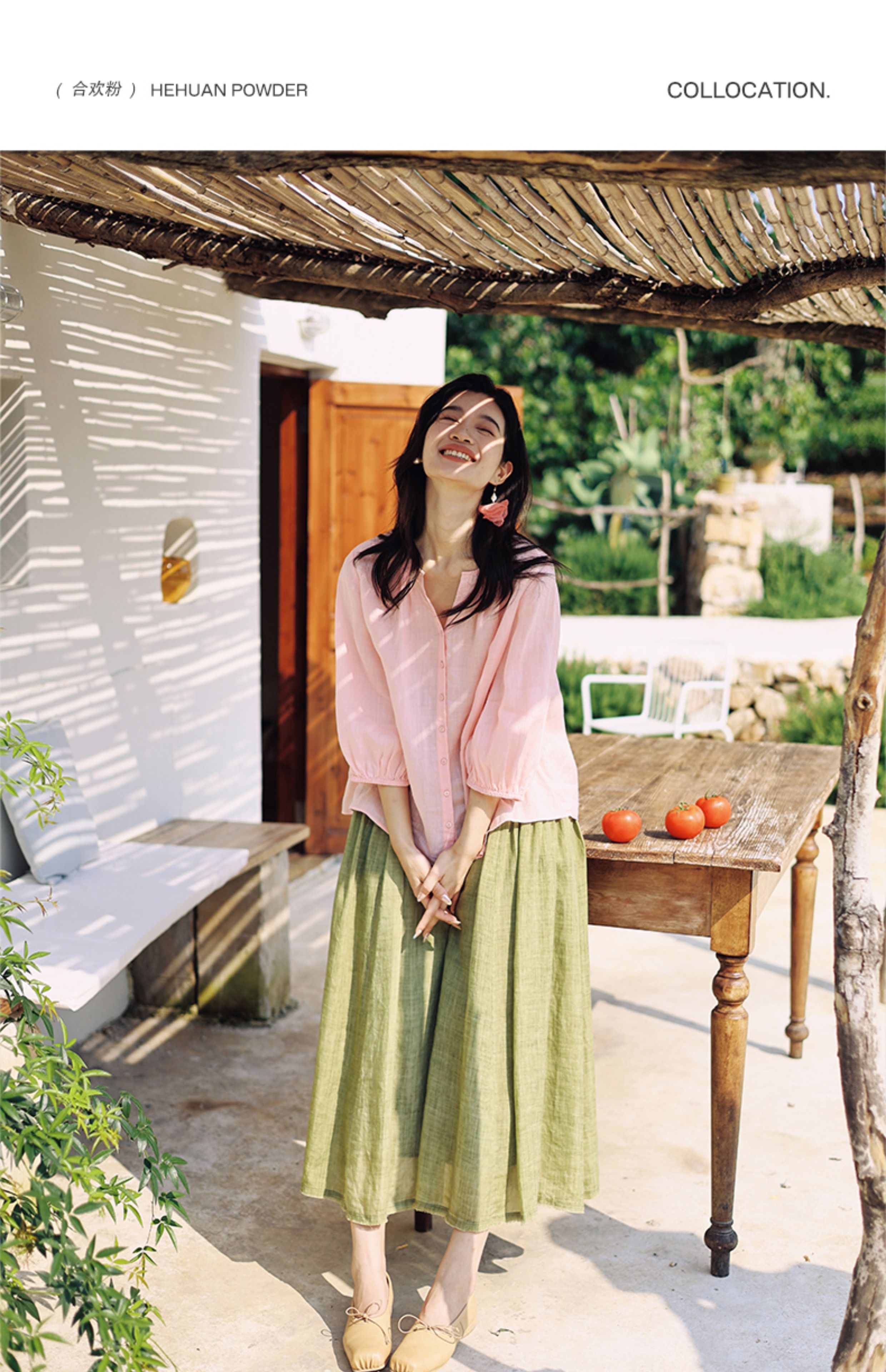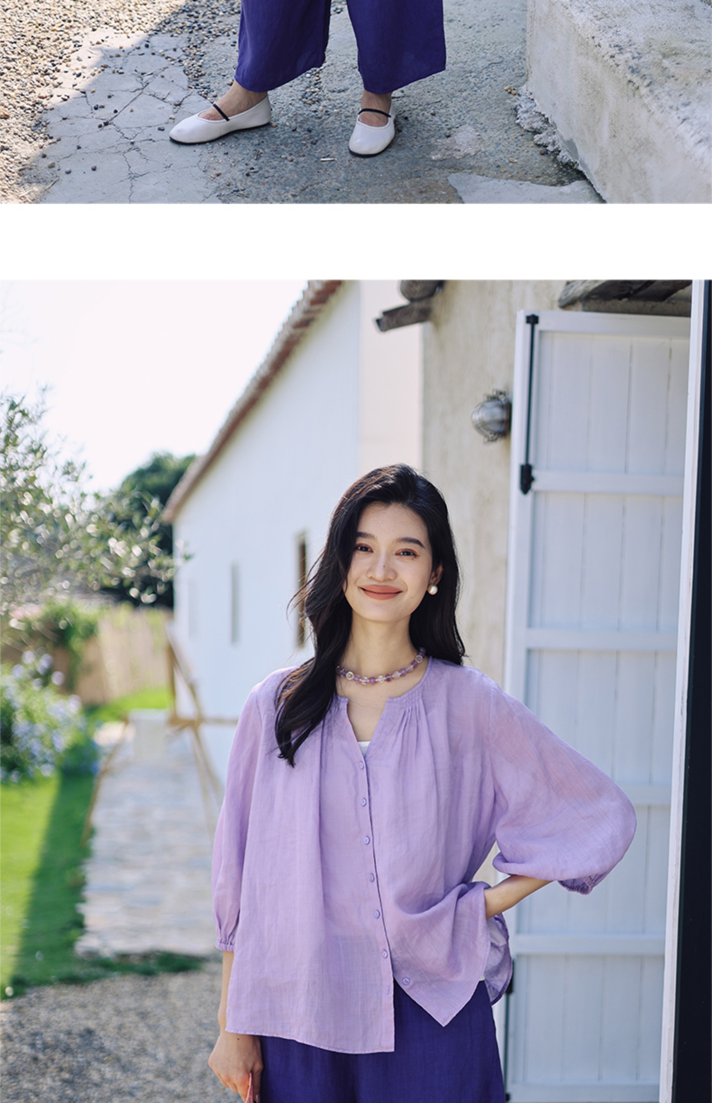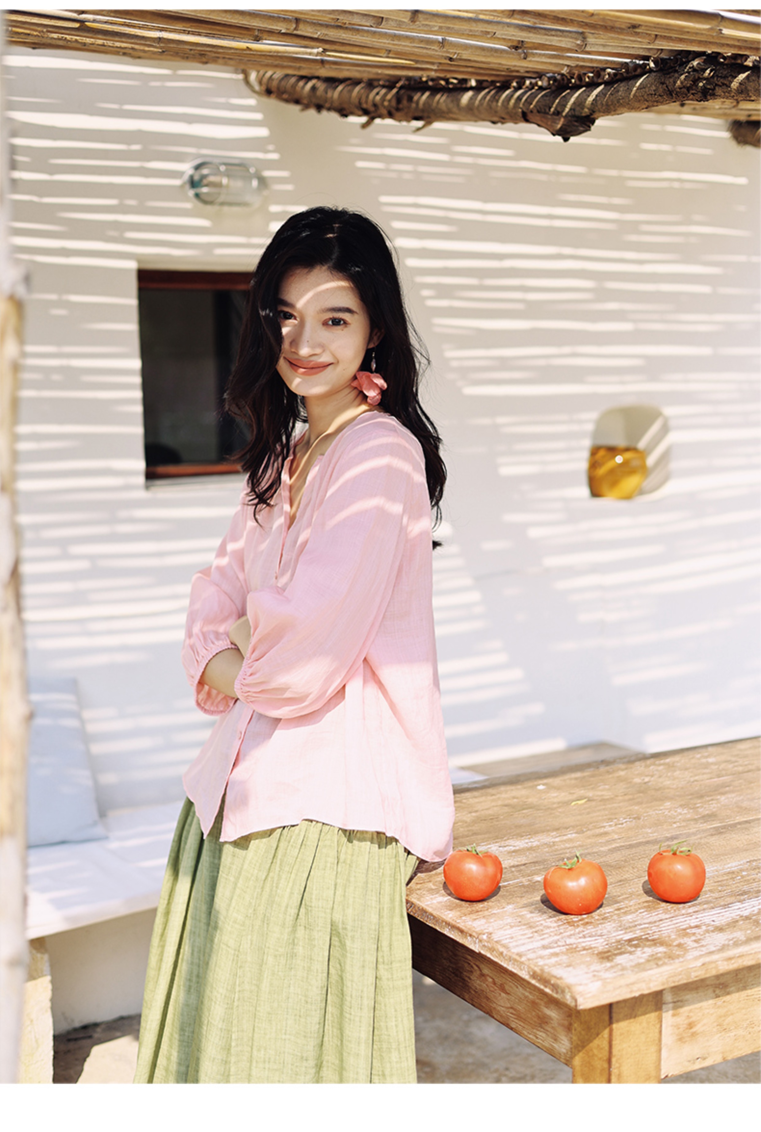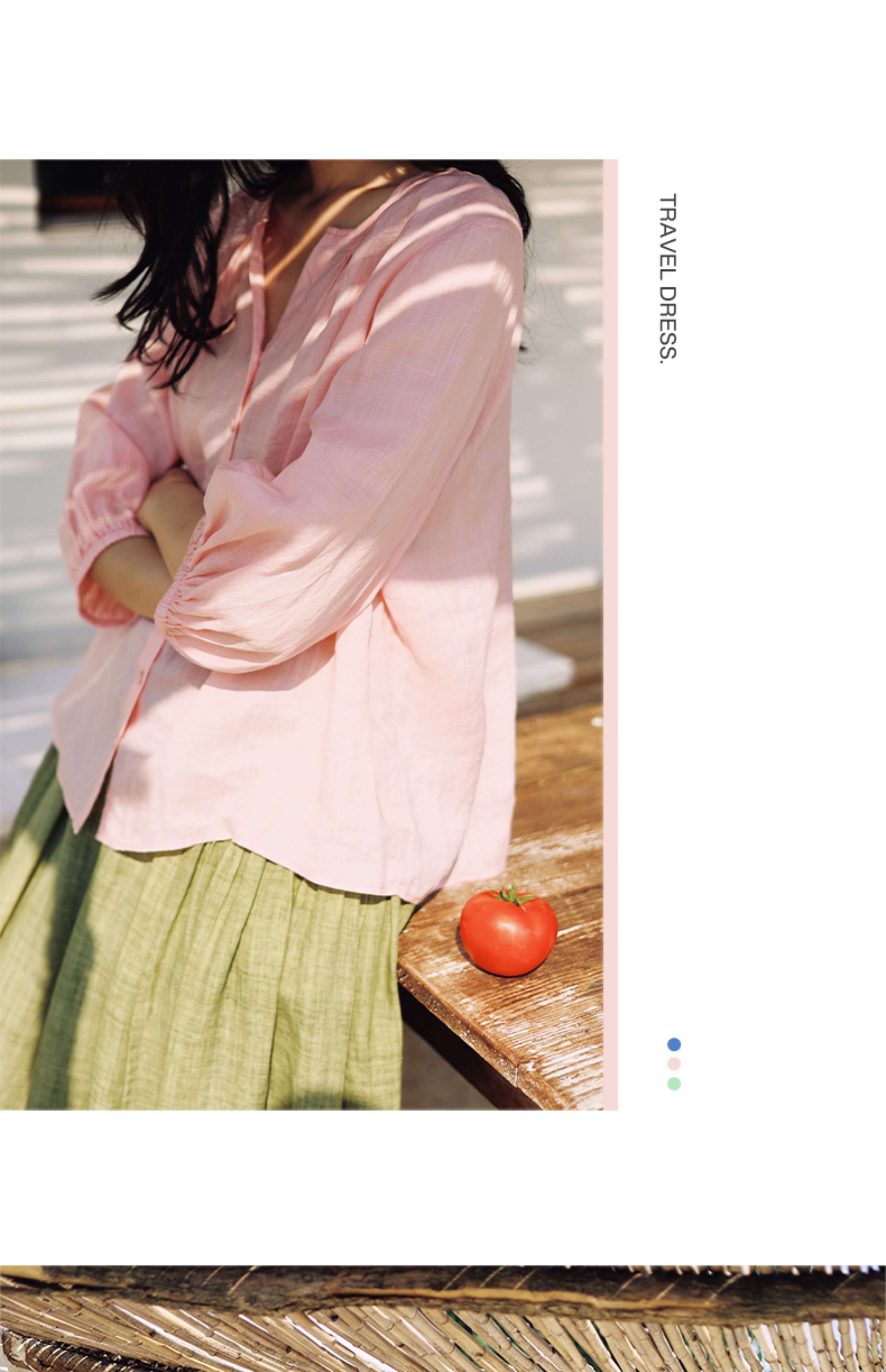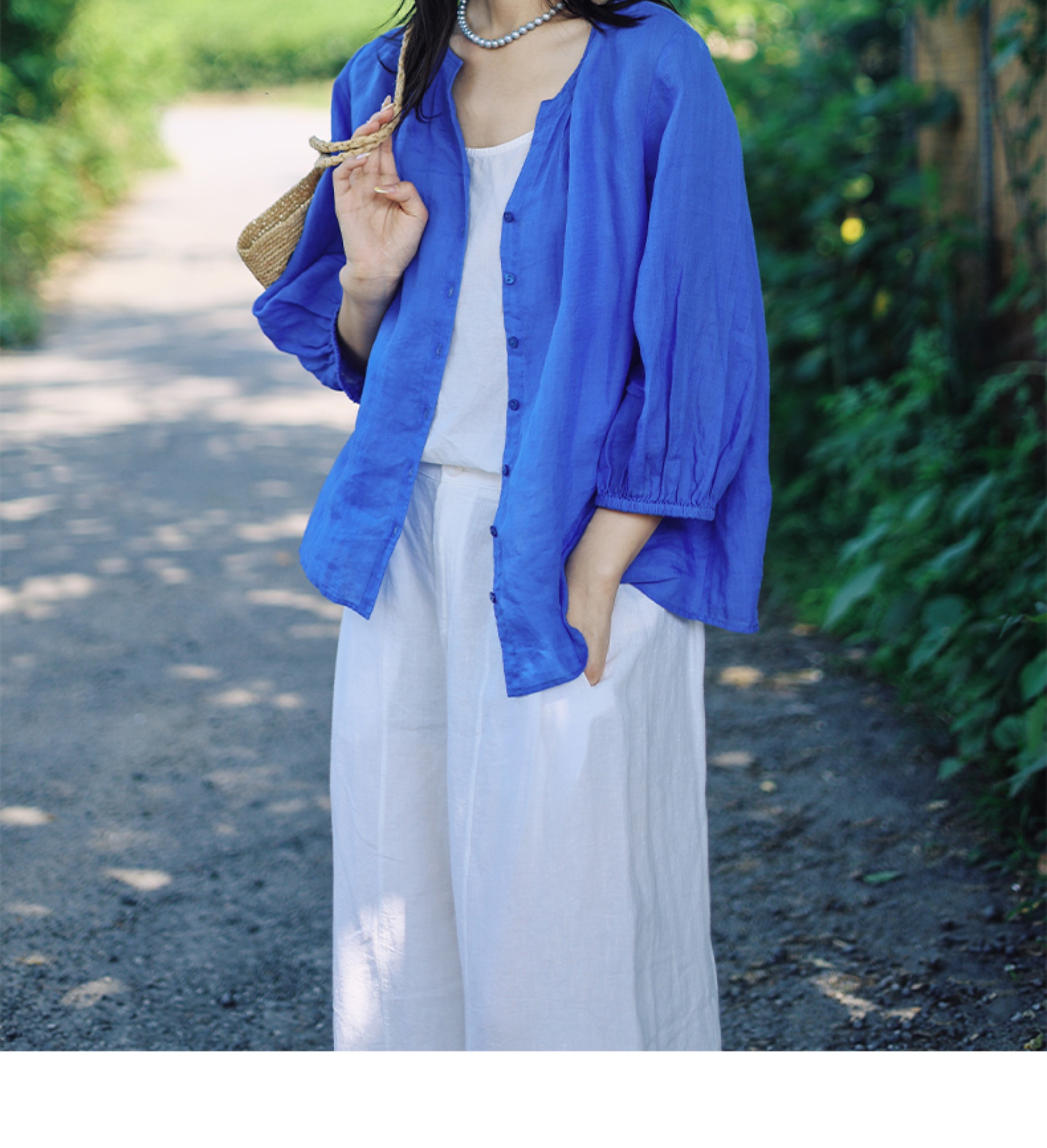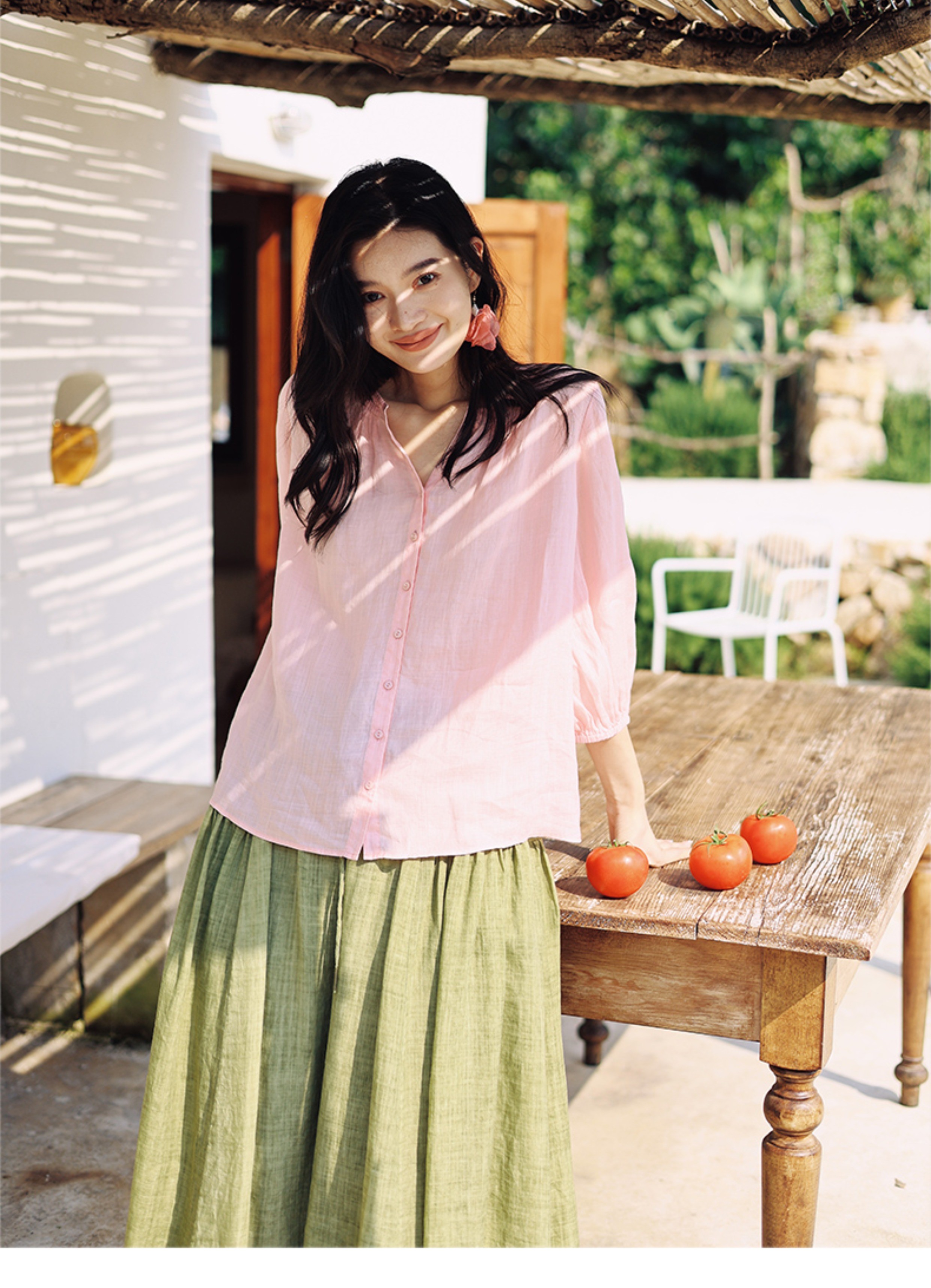 绽放388朵/【多巴胺】高支苎麻v领防晒小衫开门襟塔克七分袖衬衫