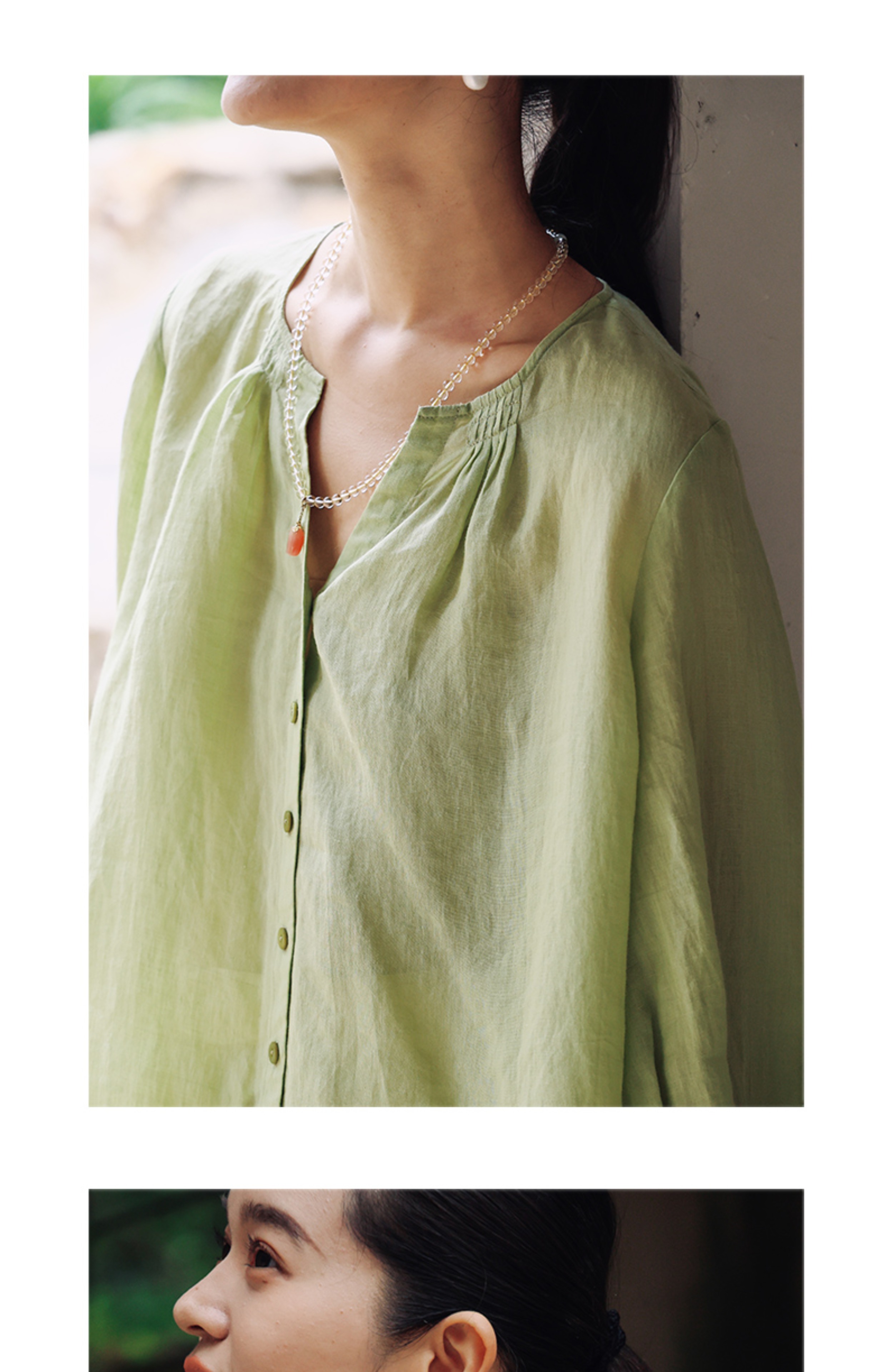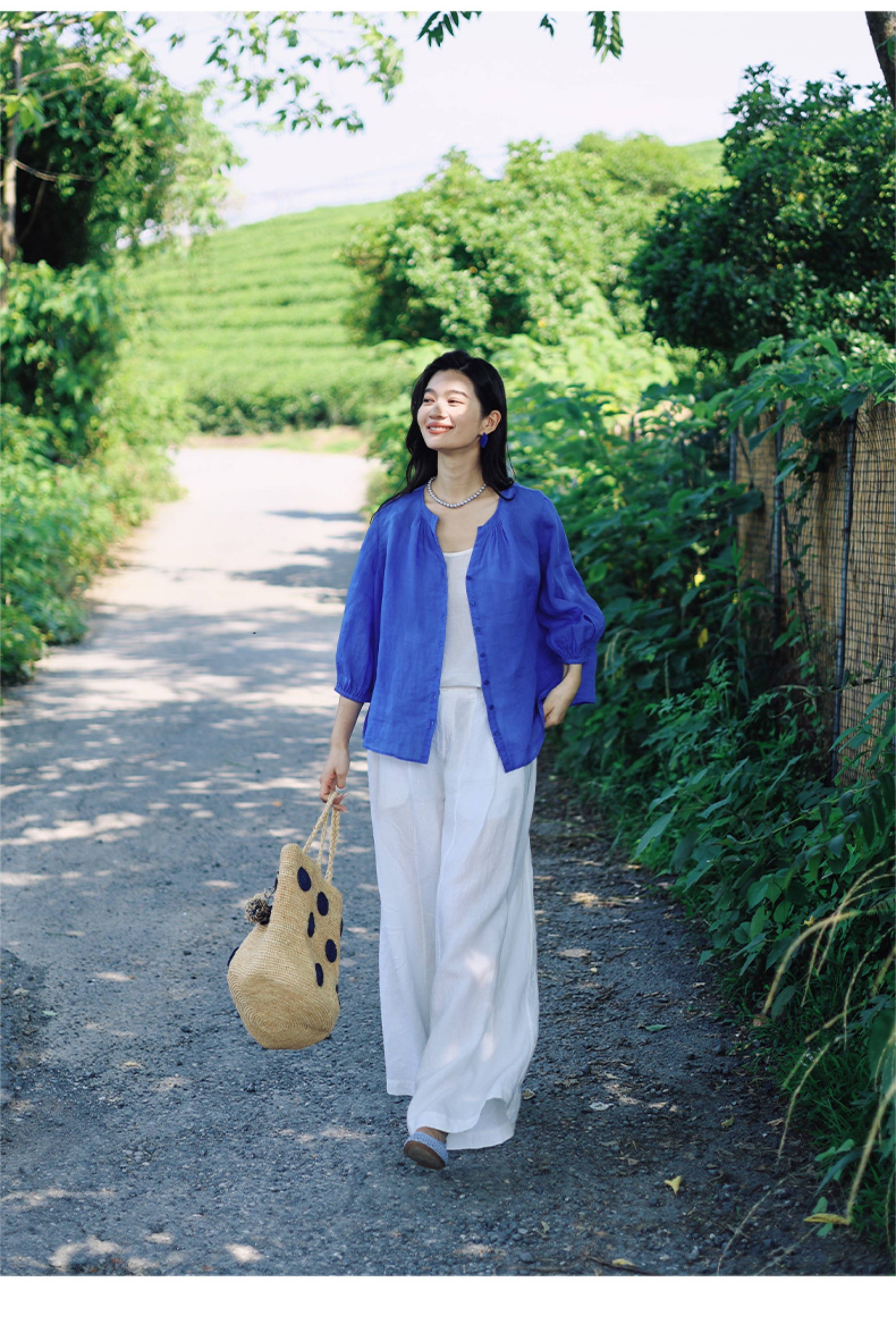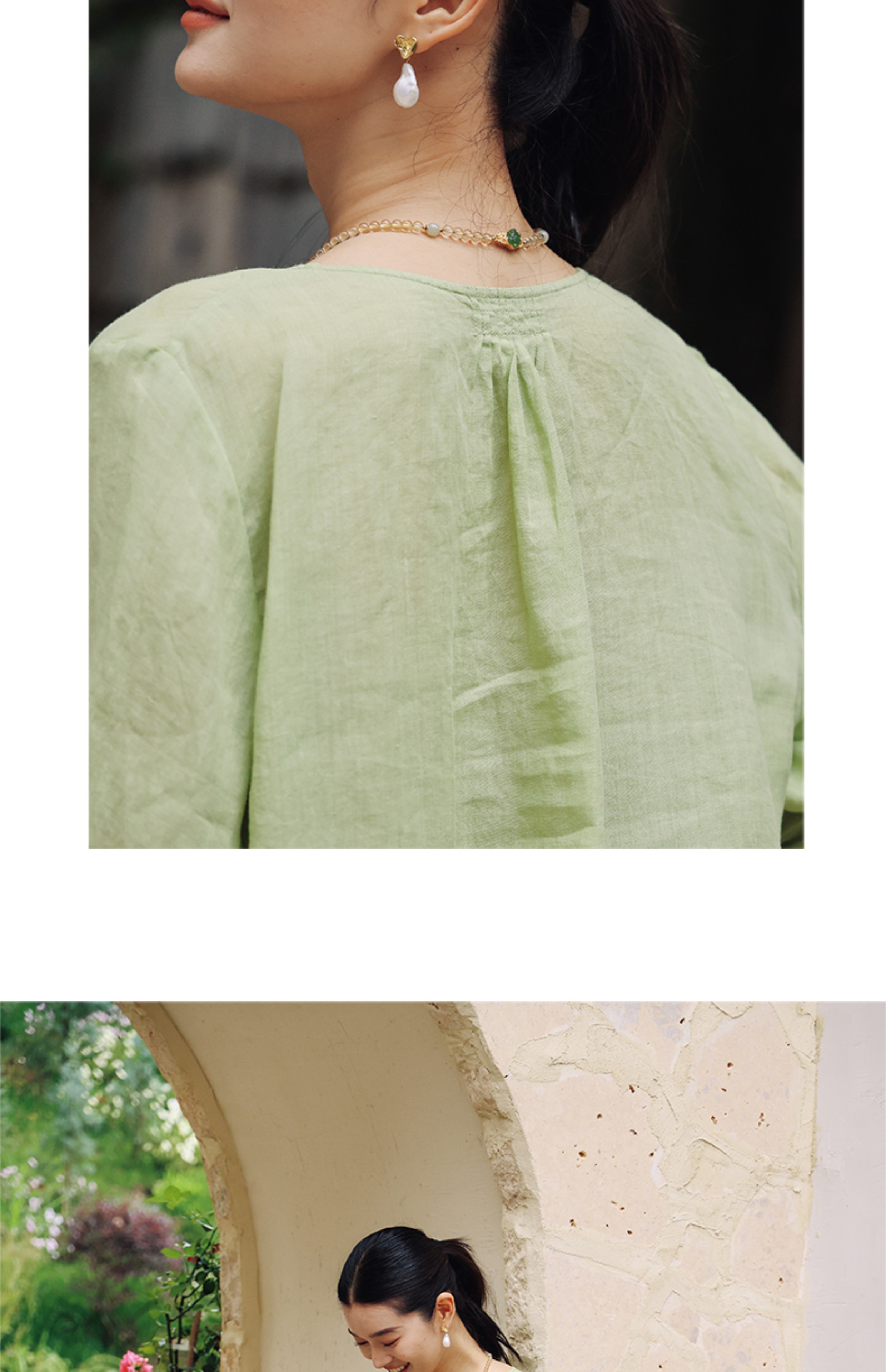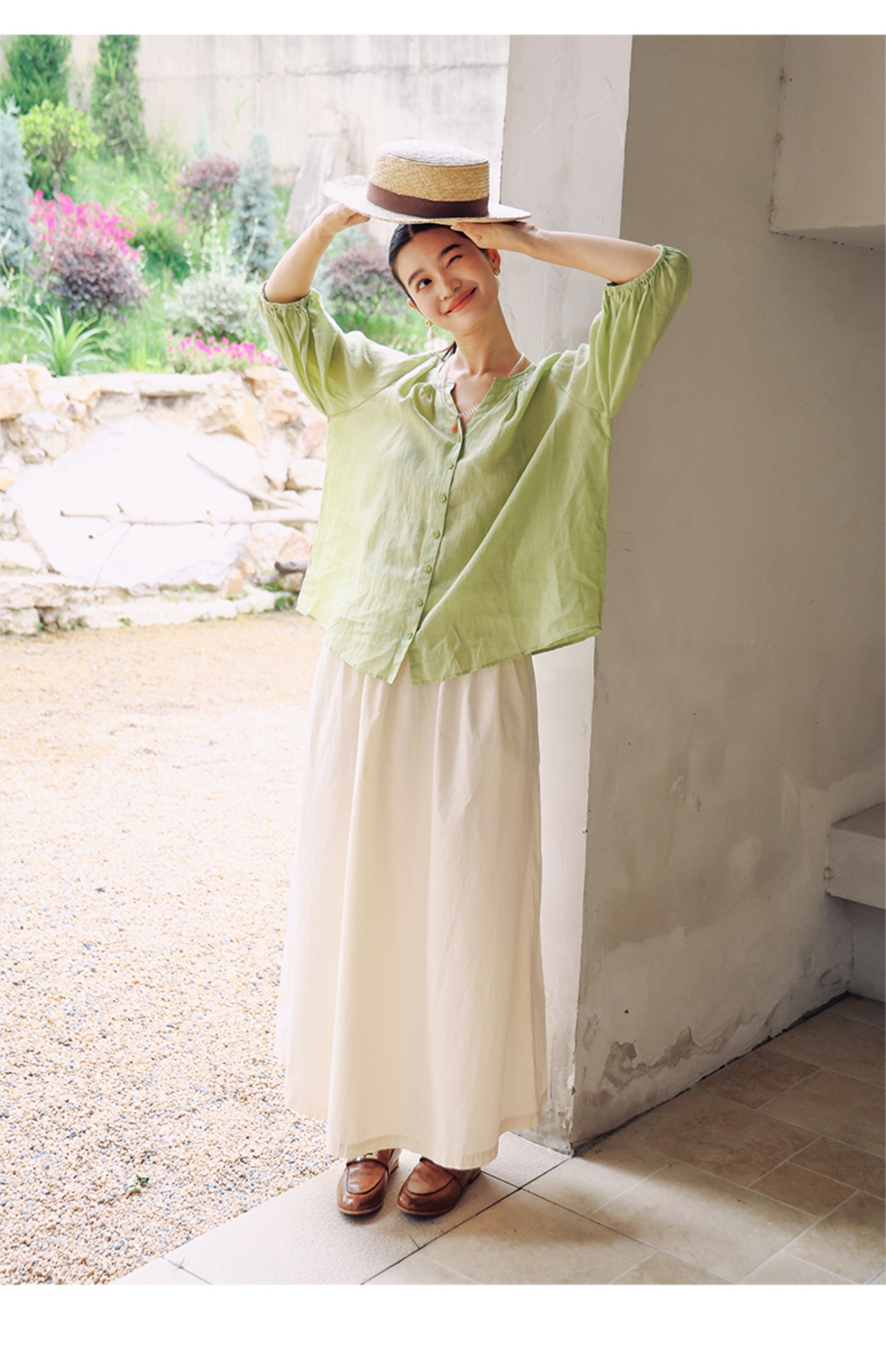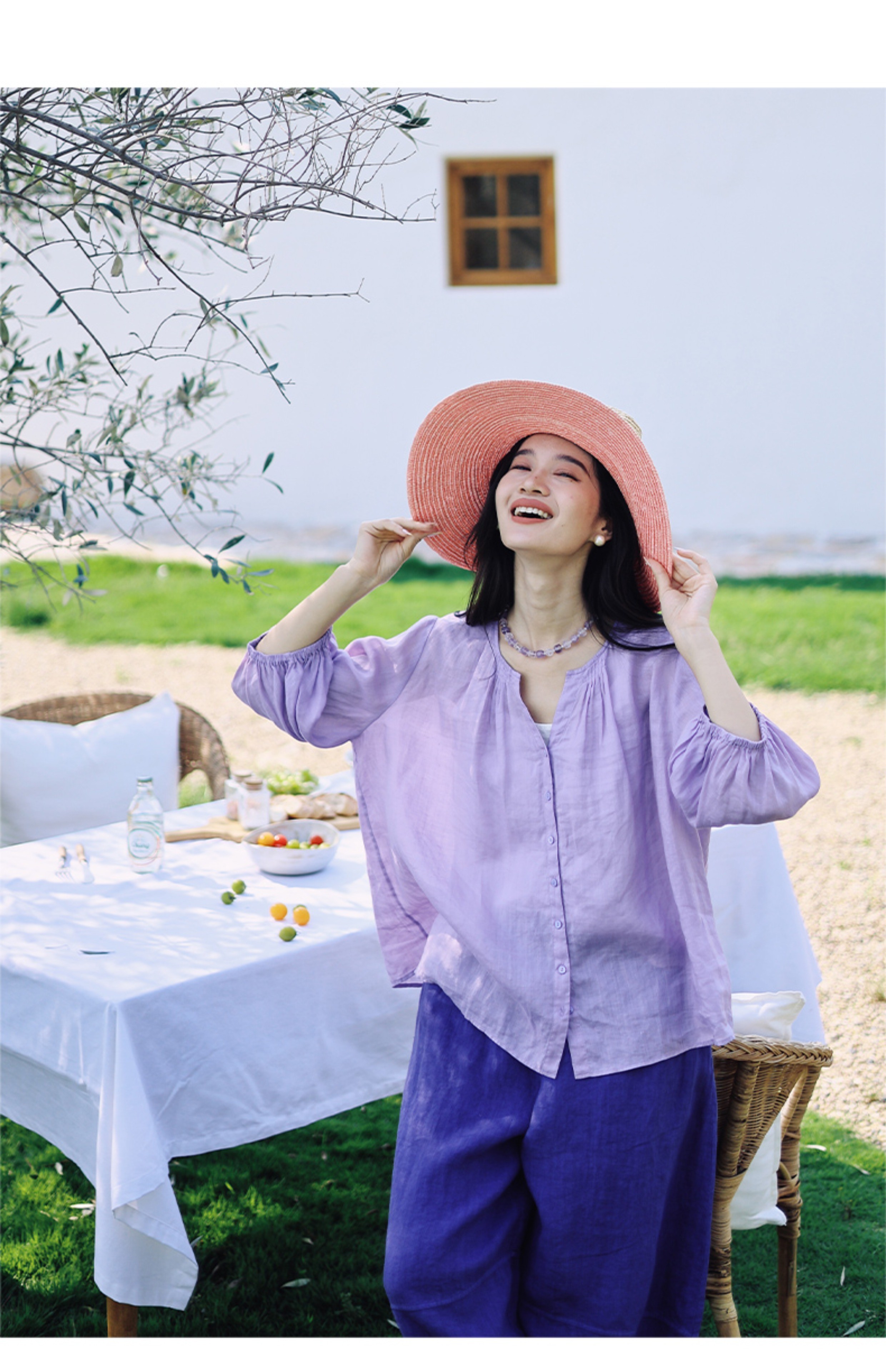 绽放388朵/【多巴胺】高支苎麻v领防晒小衫开门襟塔克七分袖衬衫