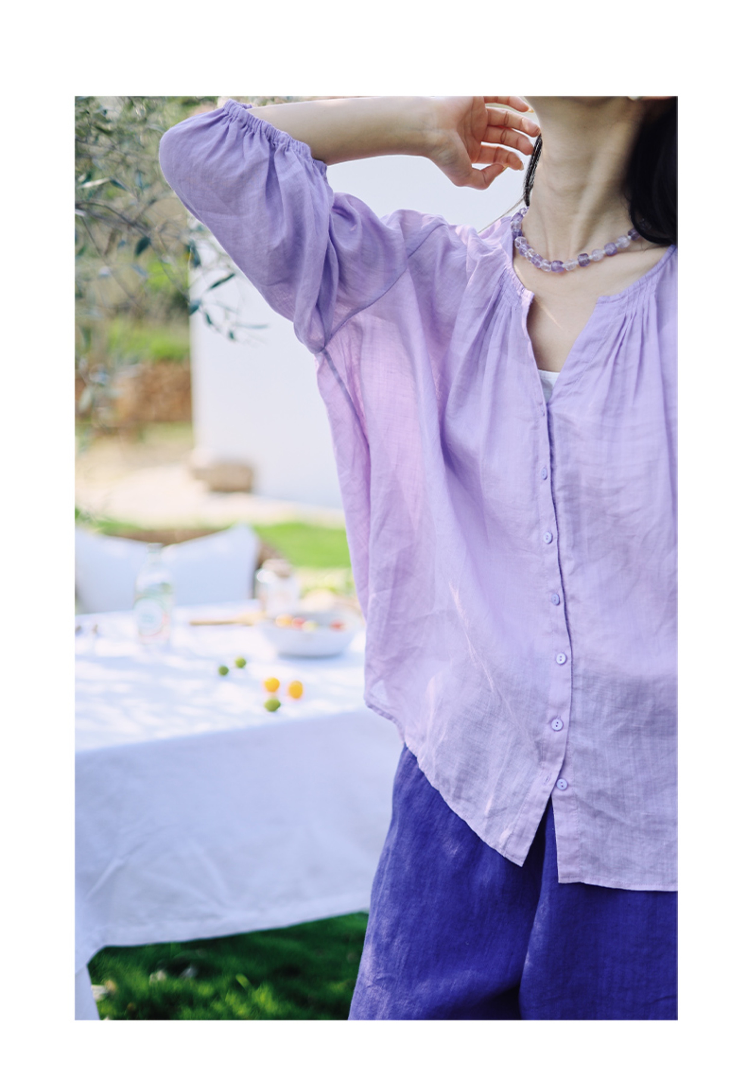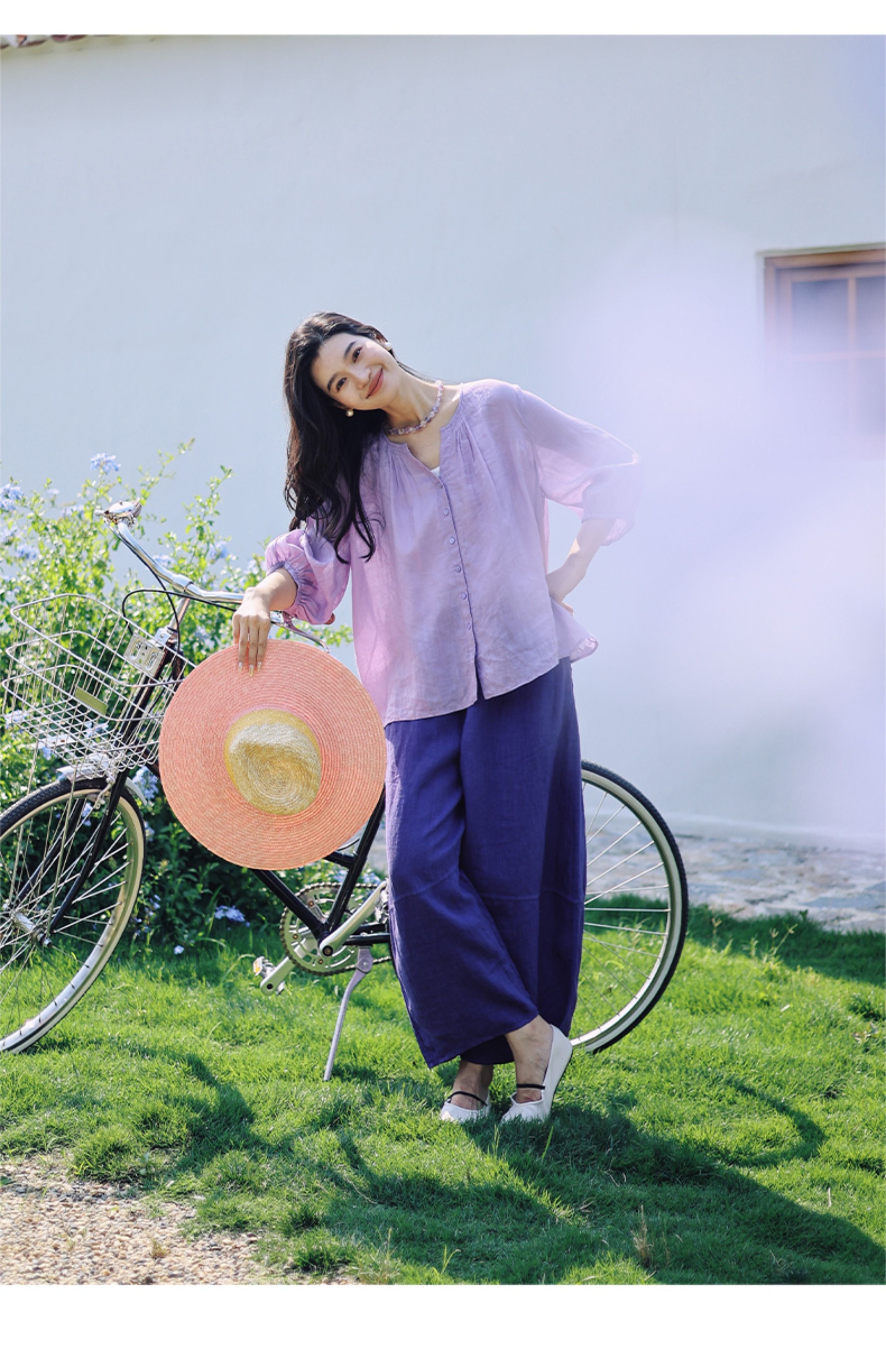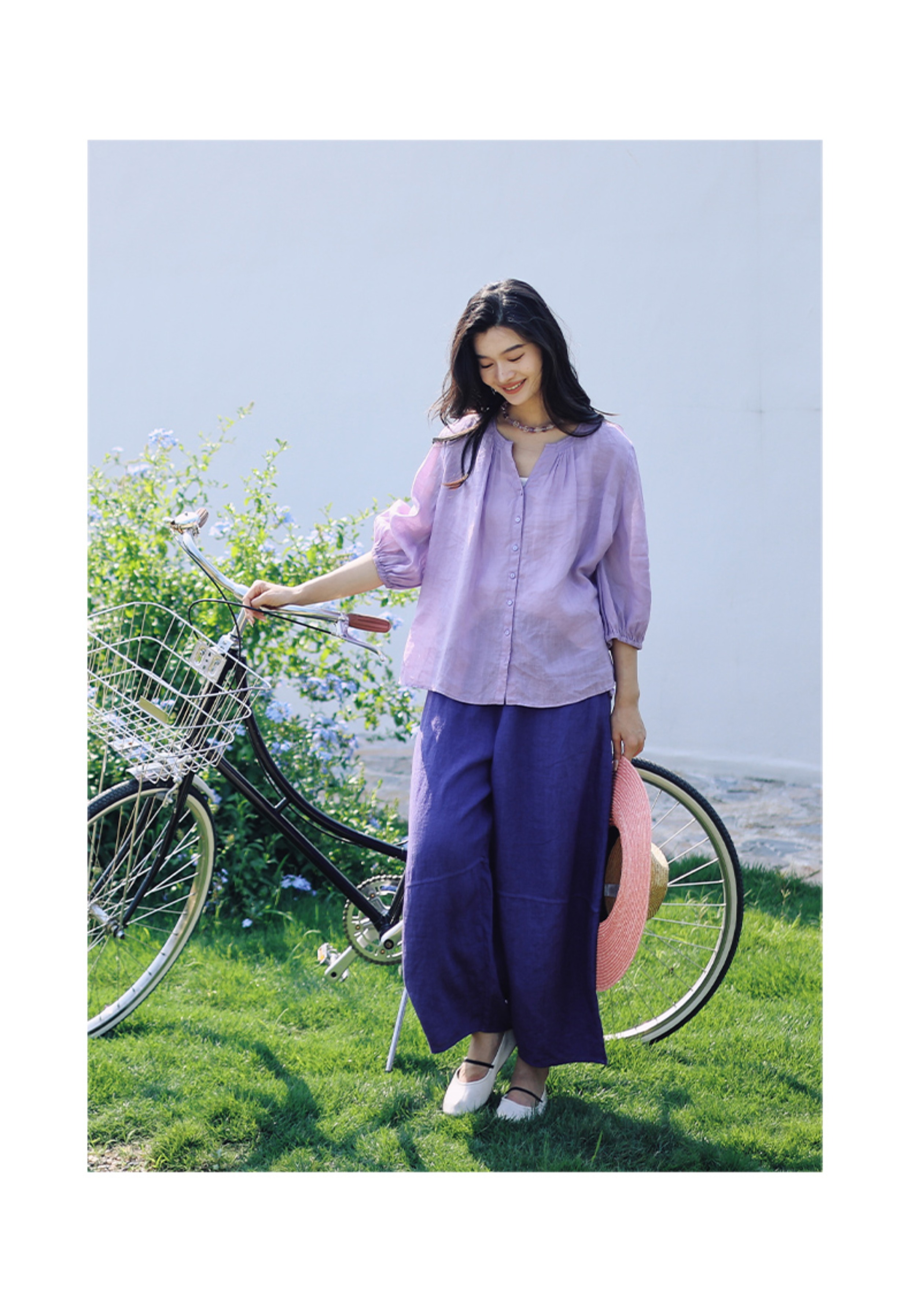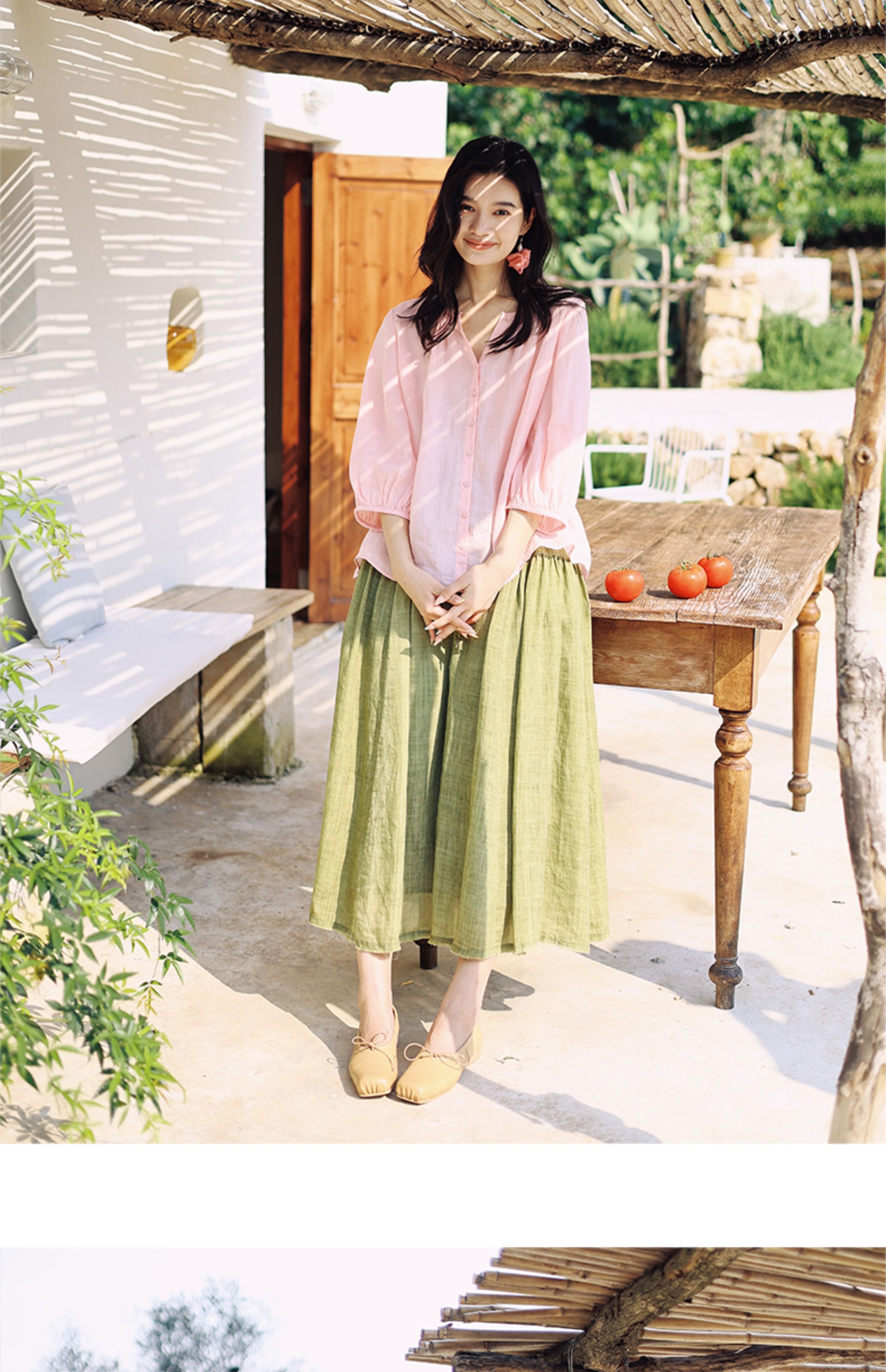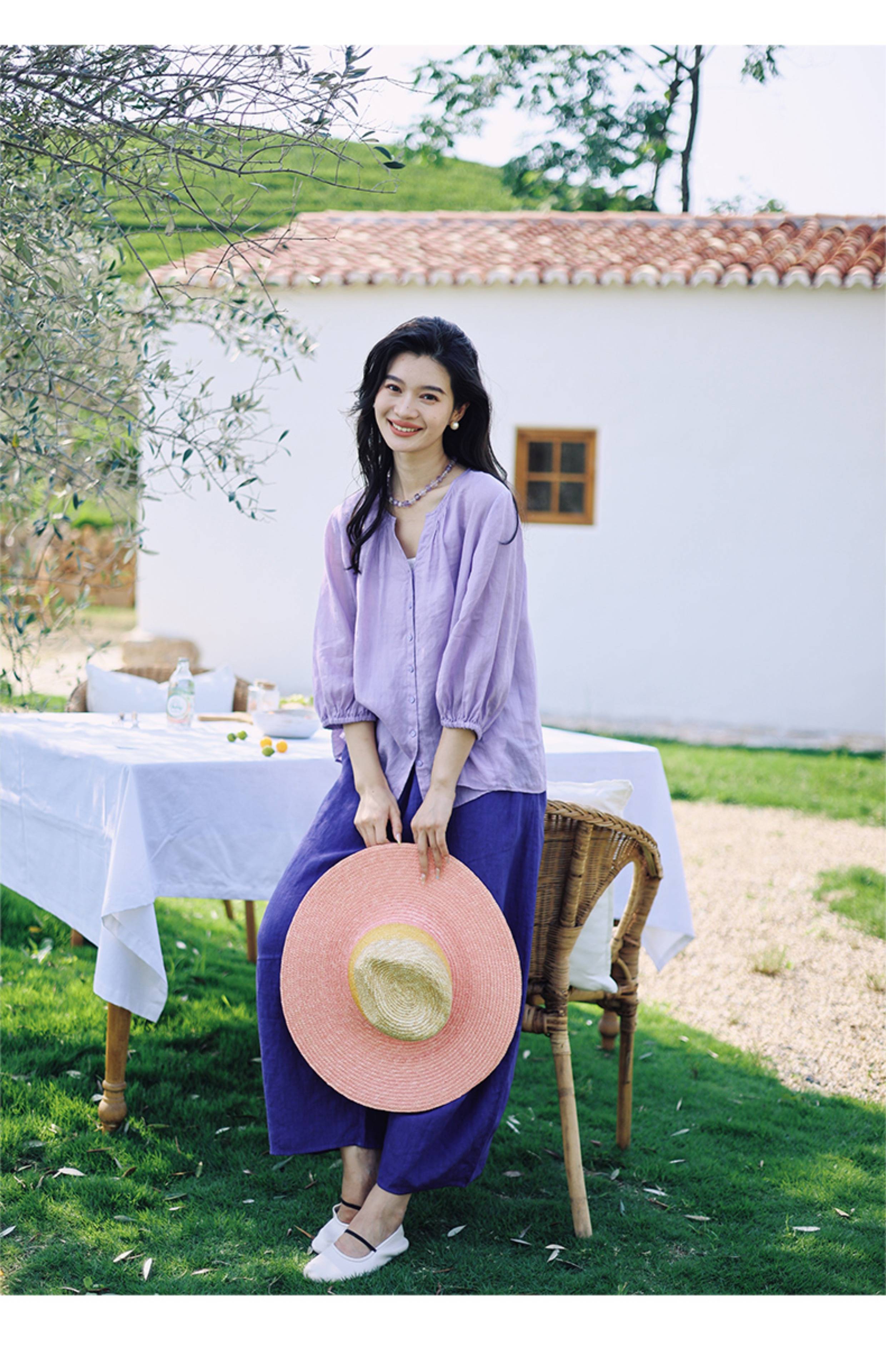 绽放388朵/【多巴胺】高支苎麻v领防晒小衫开门襟塔克七分袖衬衫