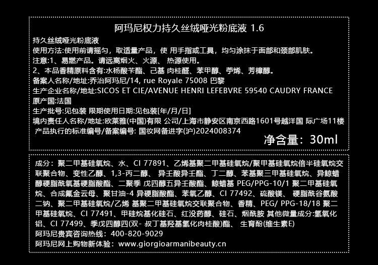 阿玛尼权力持久丝绒哑光粉底液30ml