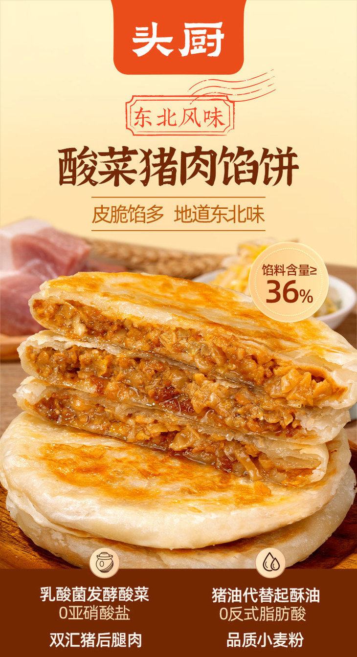 好吃的馅饼,核心在馅。头厨东北风味酸菜猪肉馅饼光是馅料含量就≥36%,每一口都能咬到肉和酸菜的扎实搭配,像极了家里老人亲手和的馅。肉选得特别讲究,用的是双汇猪后腿肉,紧实不柴,咬下去能尝到肉的鲜香味,不是那种碎渣感的合成肉,口感十足;酸菜更是灵魂,特意选东北白菜内芯,用555工艺精心处理(5次严密甄选挑出好白菜,5次全面清洗去杂质,再经过5段乳酸分段式发酵),还加了亚硝酸盐降解技术,足足低温发酵60天,这样做出来的酸菜,酸得绵柔不刺鼻,脆嫩又爽口,关键是0亚硝酸盐,吃着放心。除了馅足,饼皮也是点睛之笔。头厨用了真空和面+淋油工艺,再加上猪油起酥,纯手工包制,皮薄馅足!馅饼在健康上也不将就,没加防腐剂、增稠剂、黄原胶,连起酥都用猪油代替,实现0反式脂肪酸,老人孩子吃着也安心。