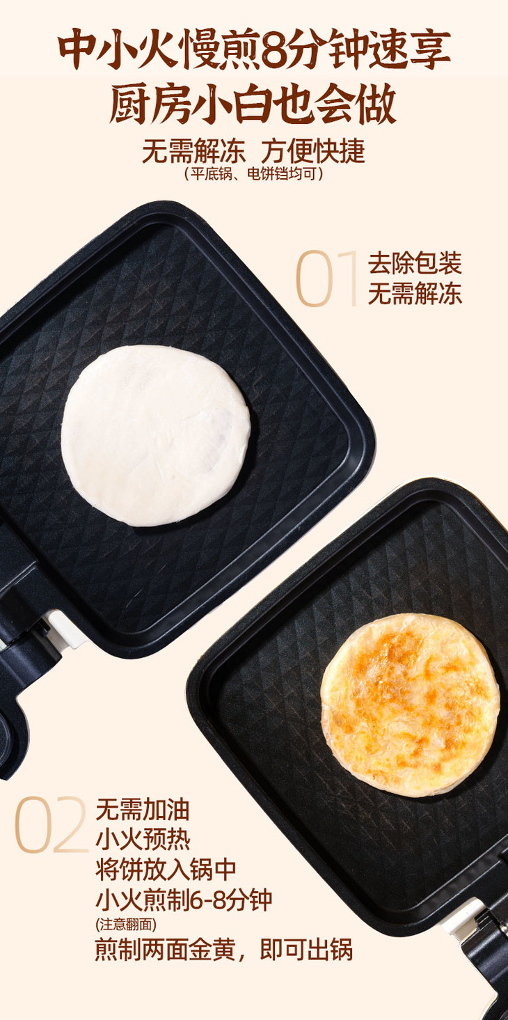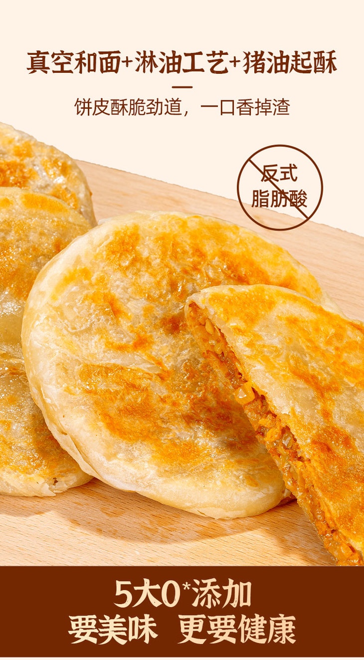 酸菜猪肉馅饼,每盒550g,里面有5个馅饼,收到直接冷冻就可以啦!想吃的时候直接拿出来,把馅饼放进平底锅、电饼铛、烤箱或者空气炸锅,不用额外加油,中间翻个面,8分钟左右就可以出锅吃起来啦!烤好的饼皮外层金黄酥脆,掉下来的碎渣都带着麦香,内里却劲道有嚼劲,不会一咬就烂,刚好能裹住满满的馅料,酸香的酸菜汁和鲜嫩的猪肉混合得刚刚好,超级美味!早上赶时间的话,煎两个配碗粥、加个鸡蛋,10分钟就能吃完营养早餐;晚上不想做饭,配上炖菜或汤,就是一顿暖乎乎的晚餐;深夜饿了,煎一个配杯热牛奶和水果,夜宵也不将就!