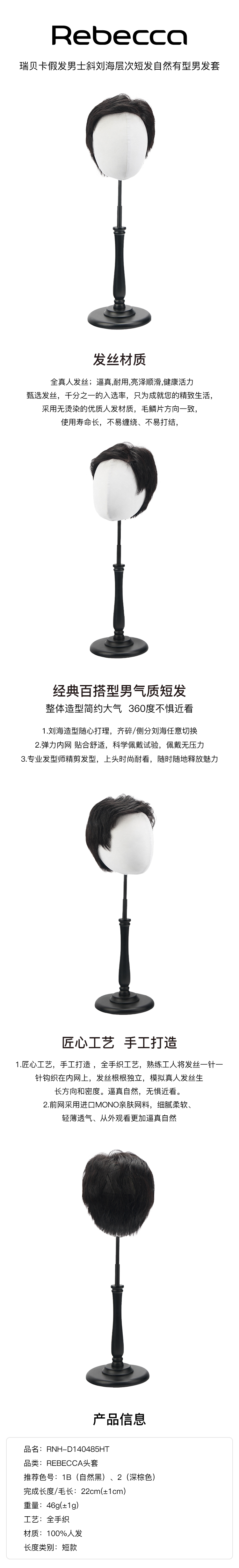 Rebecca瑞贝卡假发男士斜刘海层次短发全真人发全手织自然有型男发套