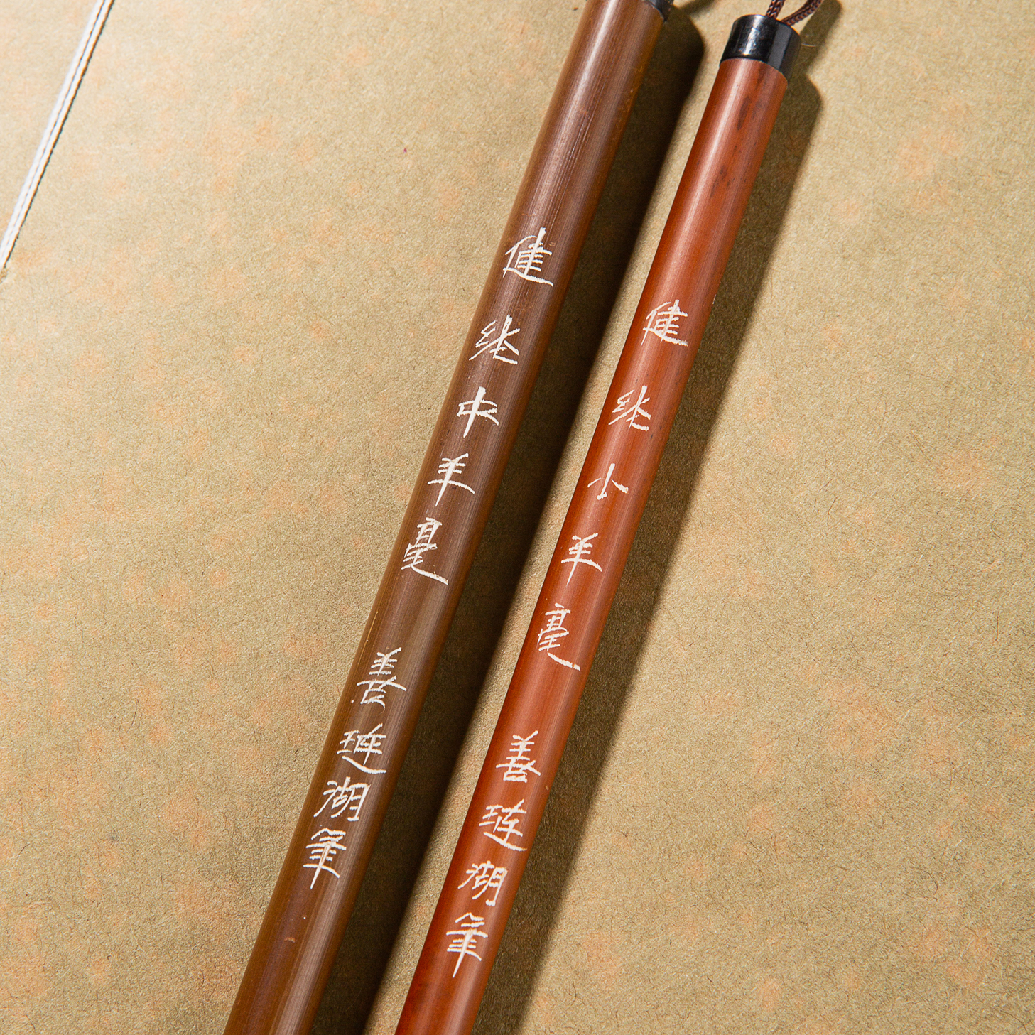 90年代健纯羊毫善琏湖笔,选料为细光锋纯羊毫,老方法制作,不添加尼龙等任何人造材料,弹性强,蓄墨量足,笔杆为纯手工刻字,书画皆宜。