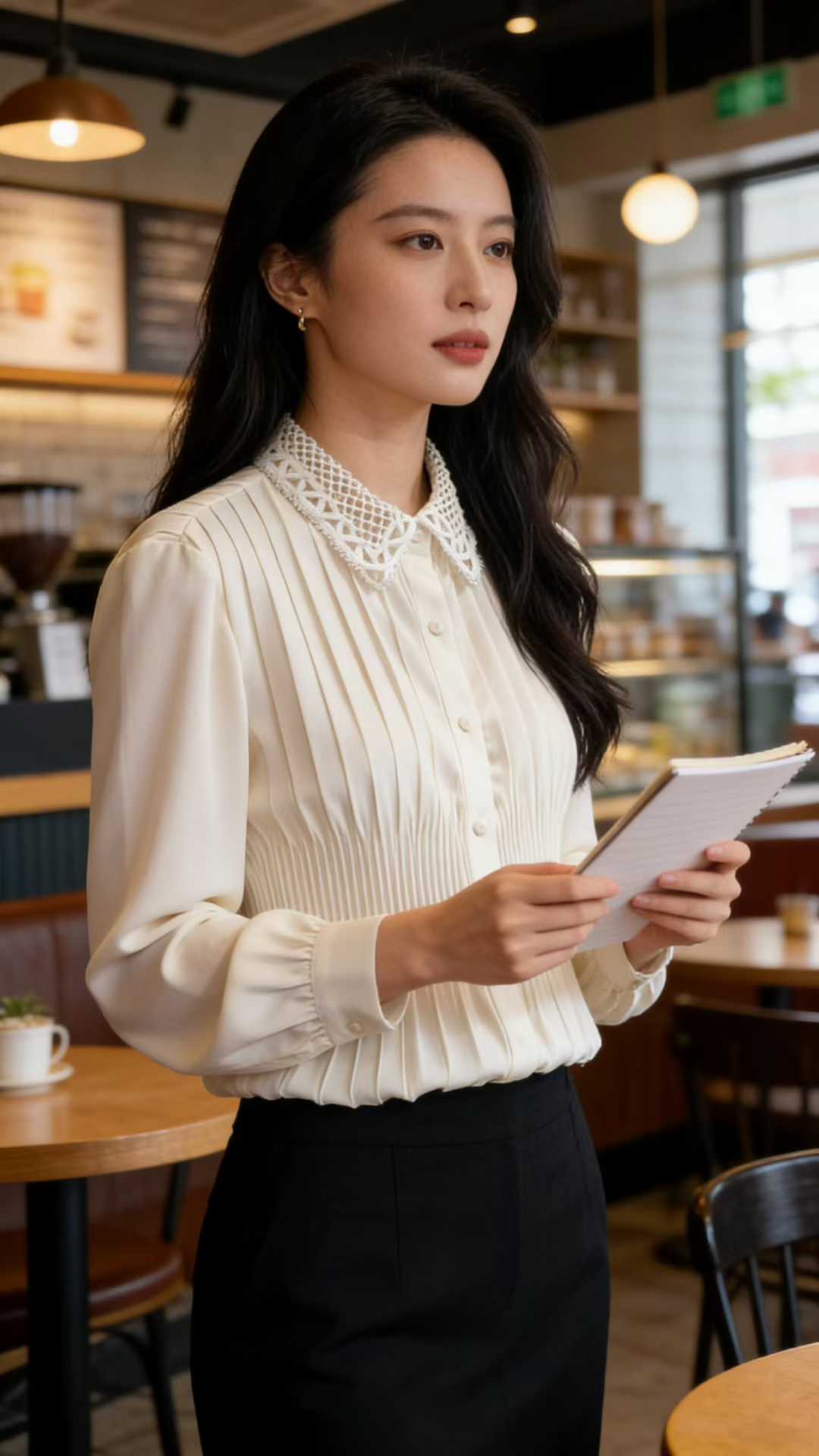 SC1F03 米白色衬衫 精致刺绣蕾丝领、全身压褶工艺、收腰显瘦版型,全身采用精密细褶压皱工艺,久穿不易变形,端庄优雅中式气质。
