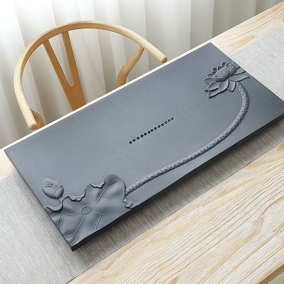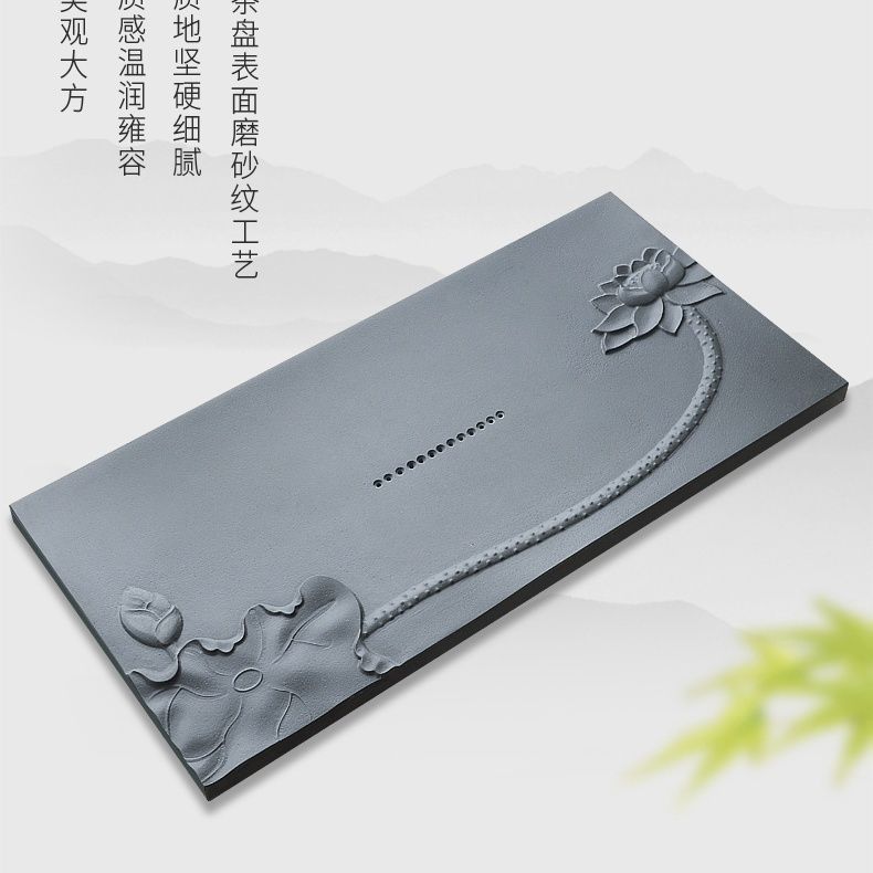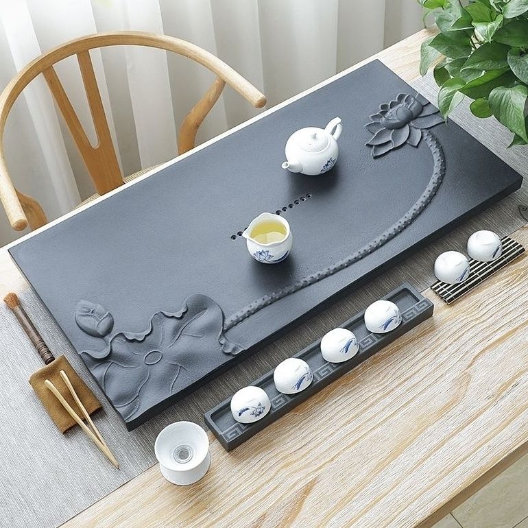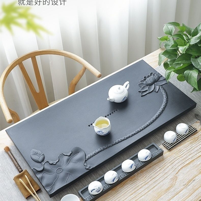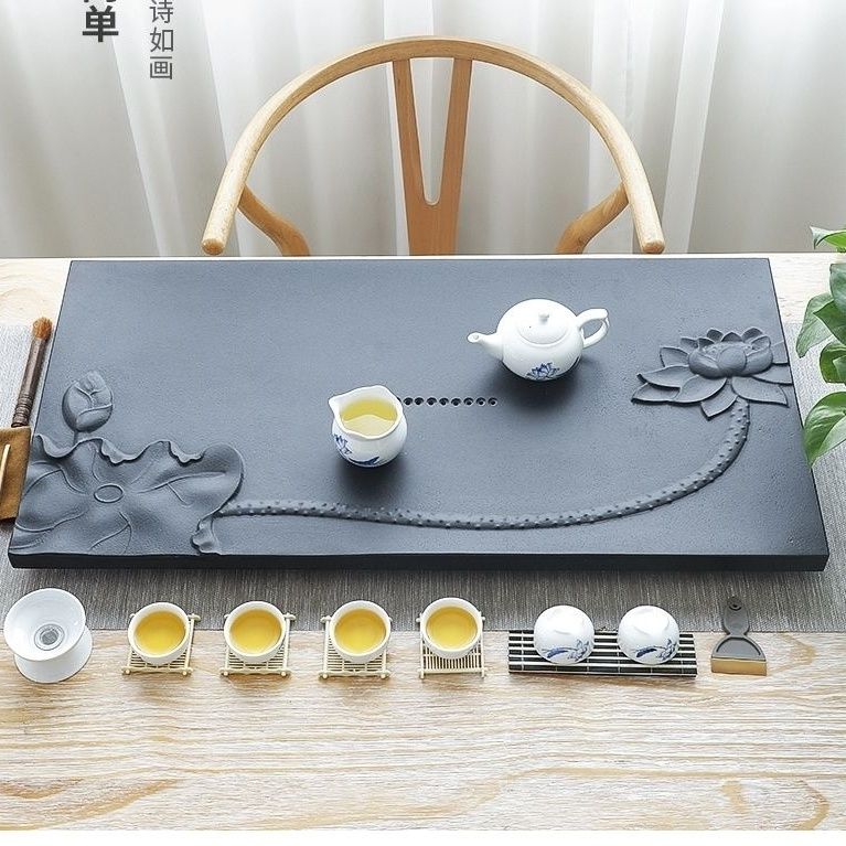天然石材乌金石茶盘荷花家用简约浮雕原石整块黑金石茶具全套