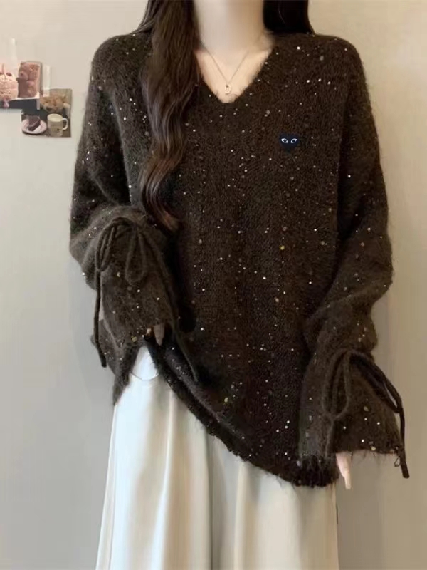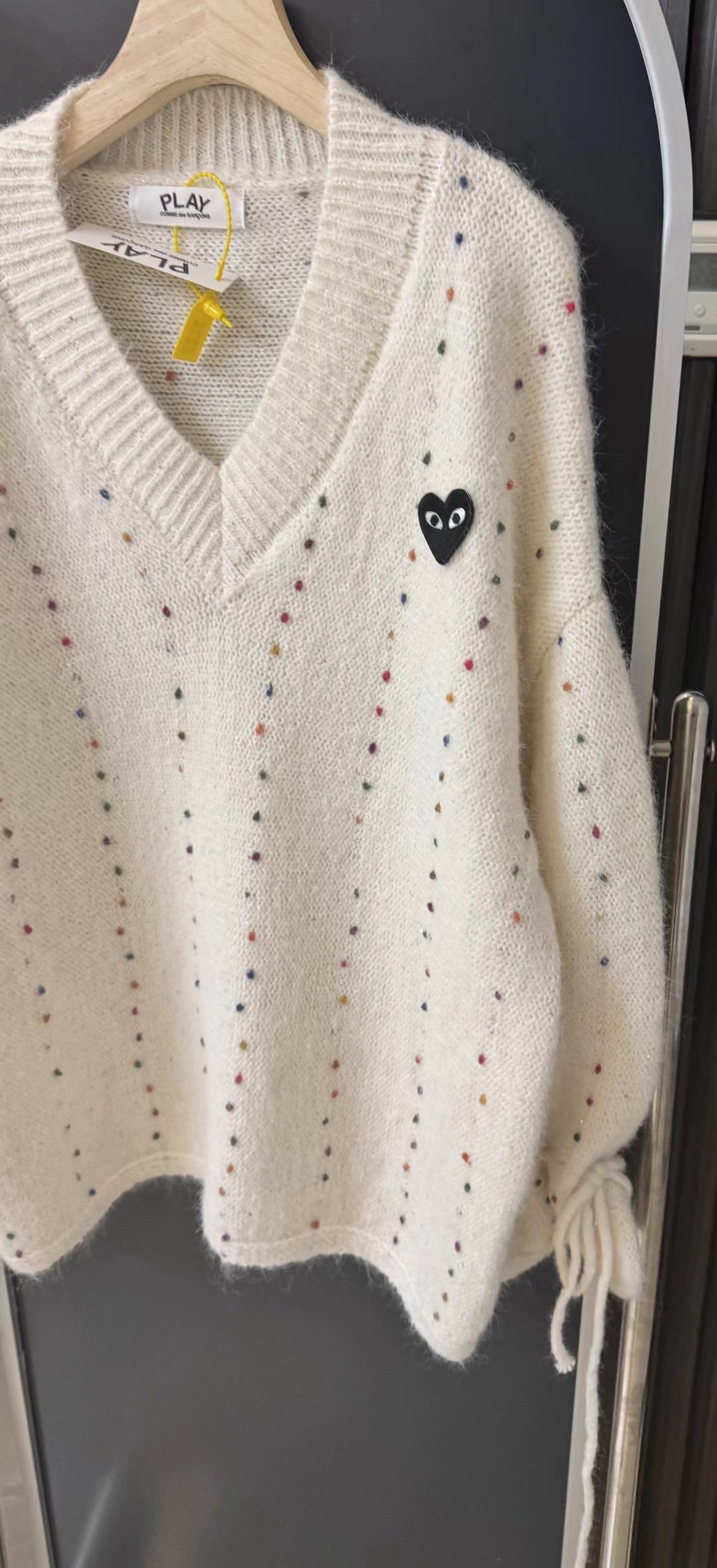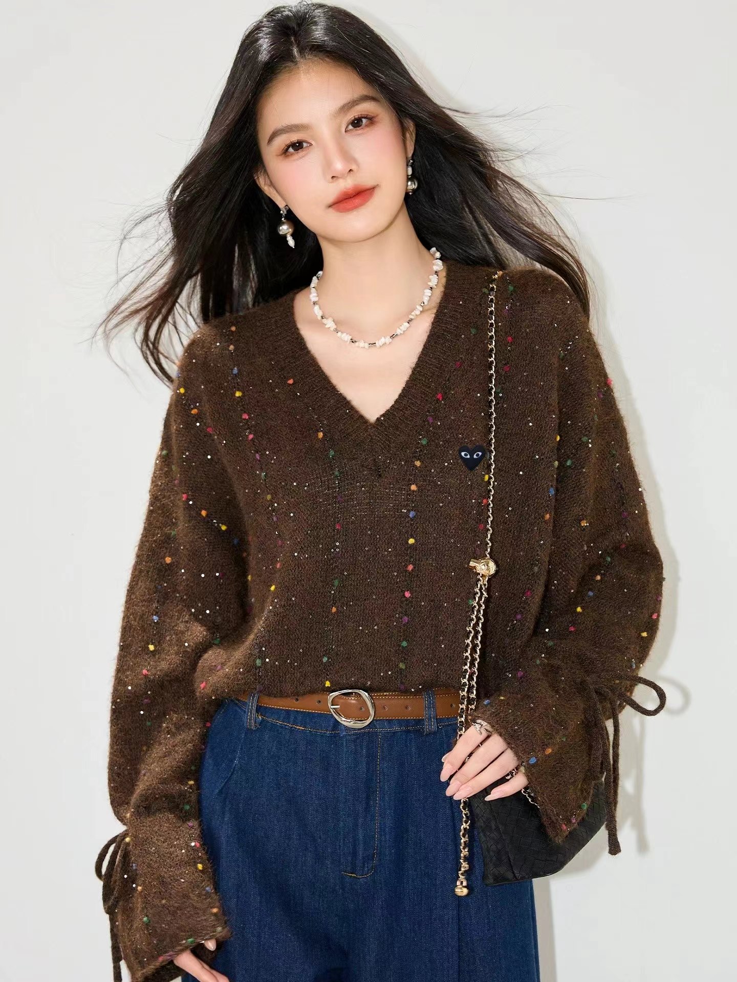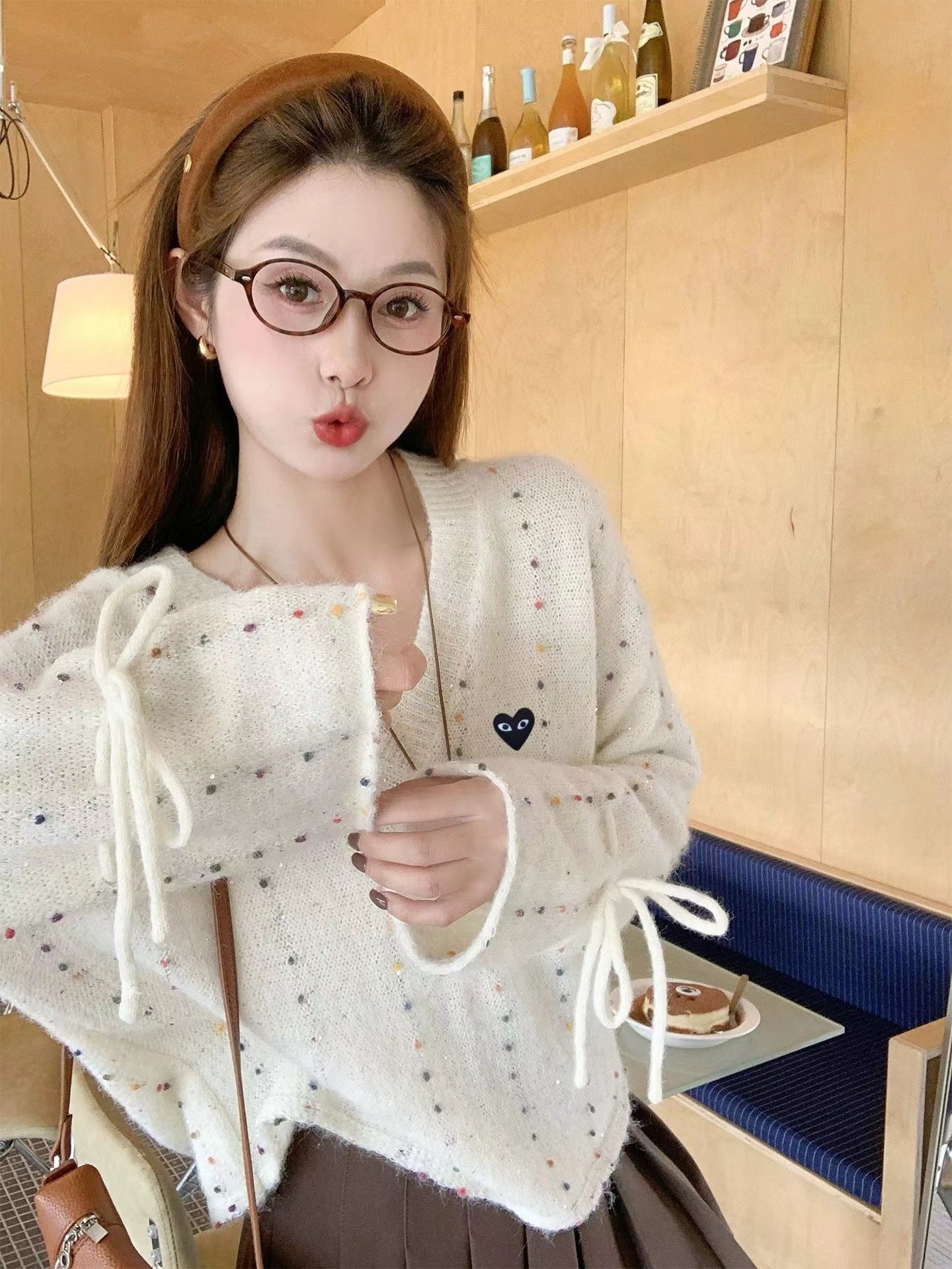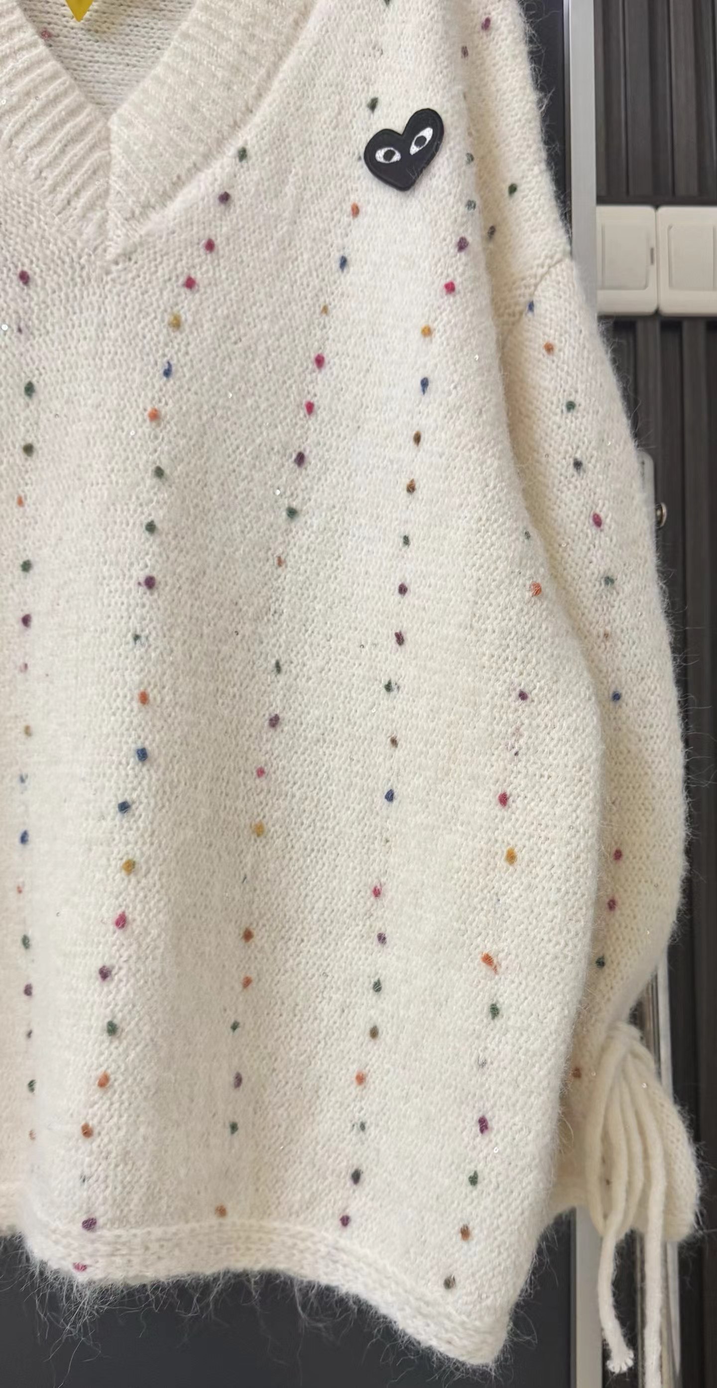 V领亮丝针织开衫这款毛衣是一件设计感十足的白色V领针织衫,充满甜美元素采用针织面料,质地轻柔且带有一定的透气性,衣身点缀着彩色波点,还融入了亮片元素,在光线照射下闪烁微光,工艺细腻jing致。- 款式细节:V领设计,能修饰颈部线条,增添优雅感;袖口为喇叭袖造型,且带有系带设计,可根据喜好调节,复古又俏皮;胸前有的黑色爱心图案(带眼睛设计),赋予了毛衣时尚辨识度。- 穿搭风格:整体风格偏向甜美可爱,可搭配白色裤子打造清新简约风,也可搭配裙装展现温柔气质,是一款兼具时尚感与少女感的单品。