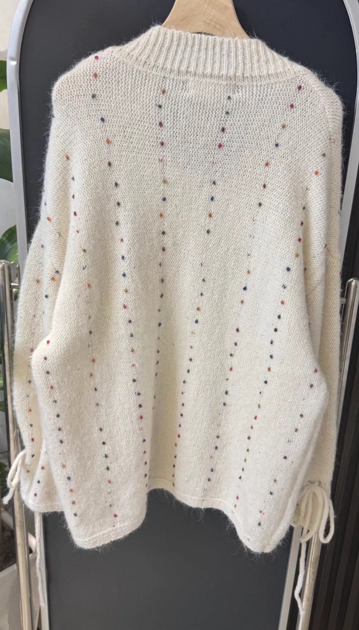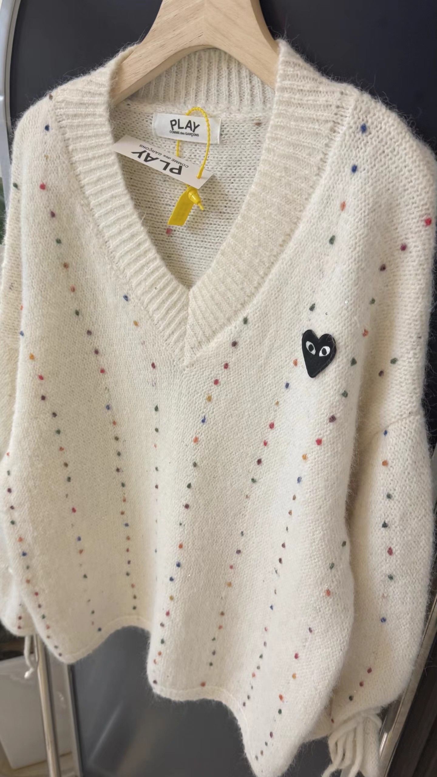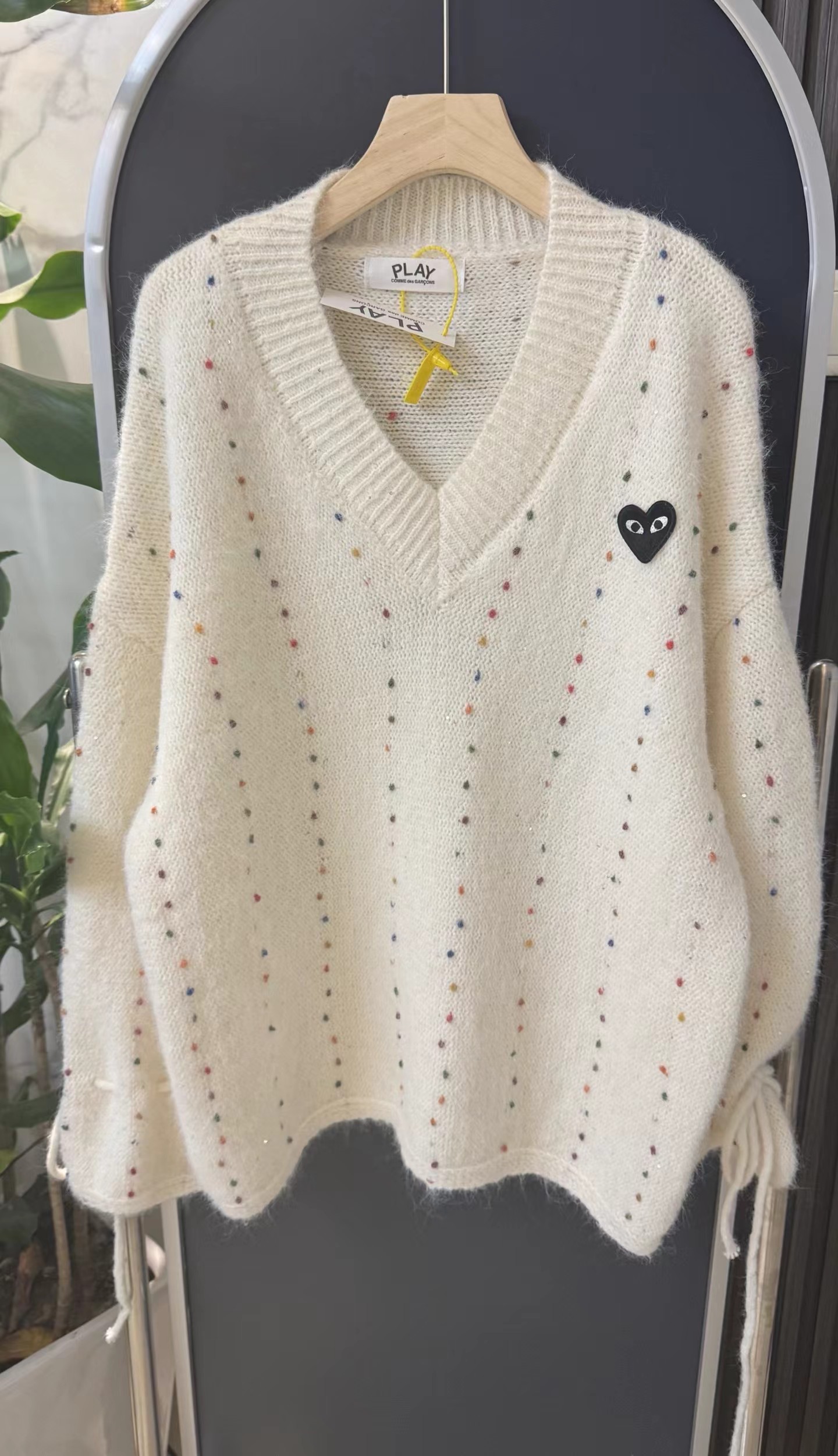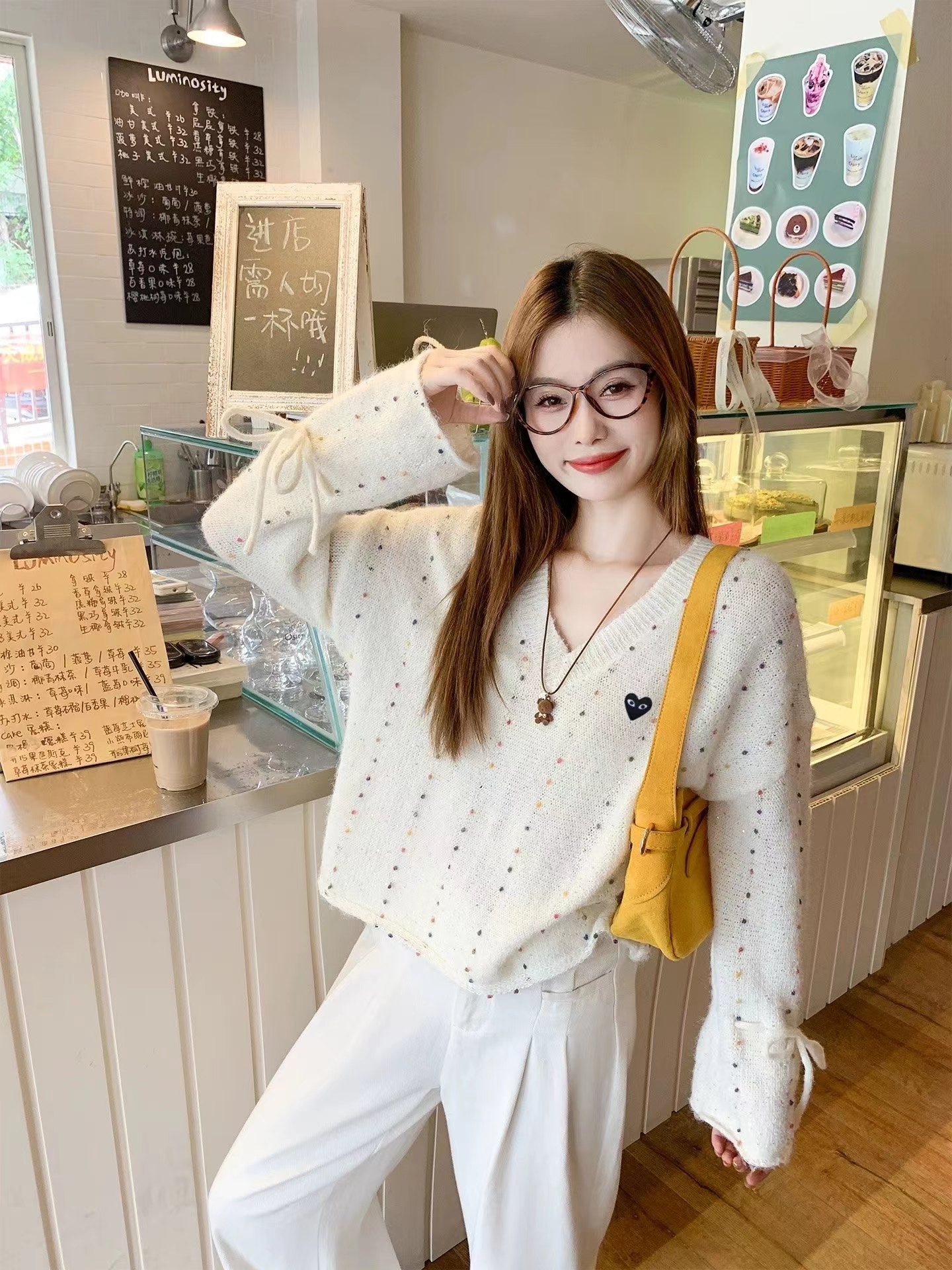 V领亮丝针织开衫这款毛衣是一件设计感十足的白色V领针织衫,充满甜美元素采用针织面料,质地轻柔且带有一定的透气性,衣身点缀着彩色波点,还融入了亮片元素,在光线照射下闪烁微光,工艺细腻jing致。- 款式细节:V领设计,能修饰颈部线条,增添优雅感;袖口为喇叭袖造型,且带有系带设计,可根据喜好调节,复古又俏皮;胸前有的黑色爱心图案(带眼睛设计),赋予了毛衣时尚辨识度。- 穿搭风格:整体风格偏向甜美可爱,可搭配白色裤子打造清新简约风,也可搭配裙装展现温柔气质,是一款兼具时尚感与少女感的单品。