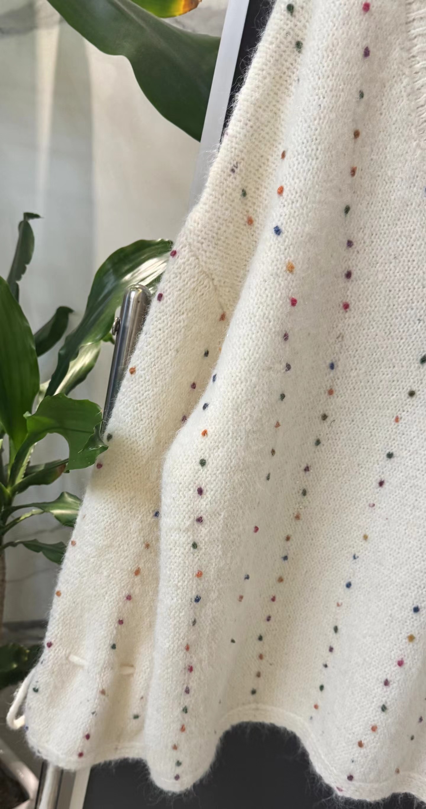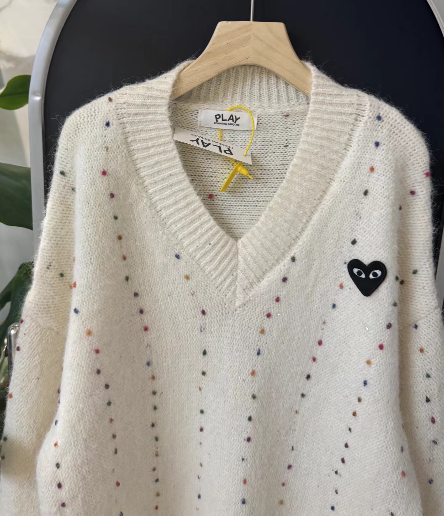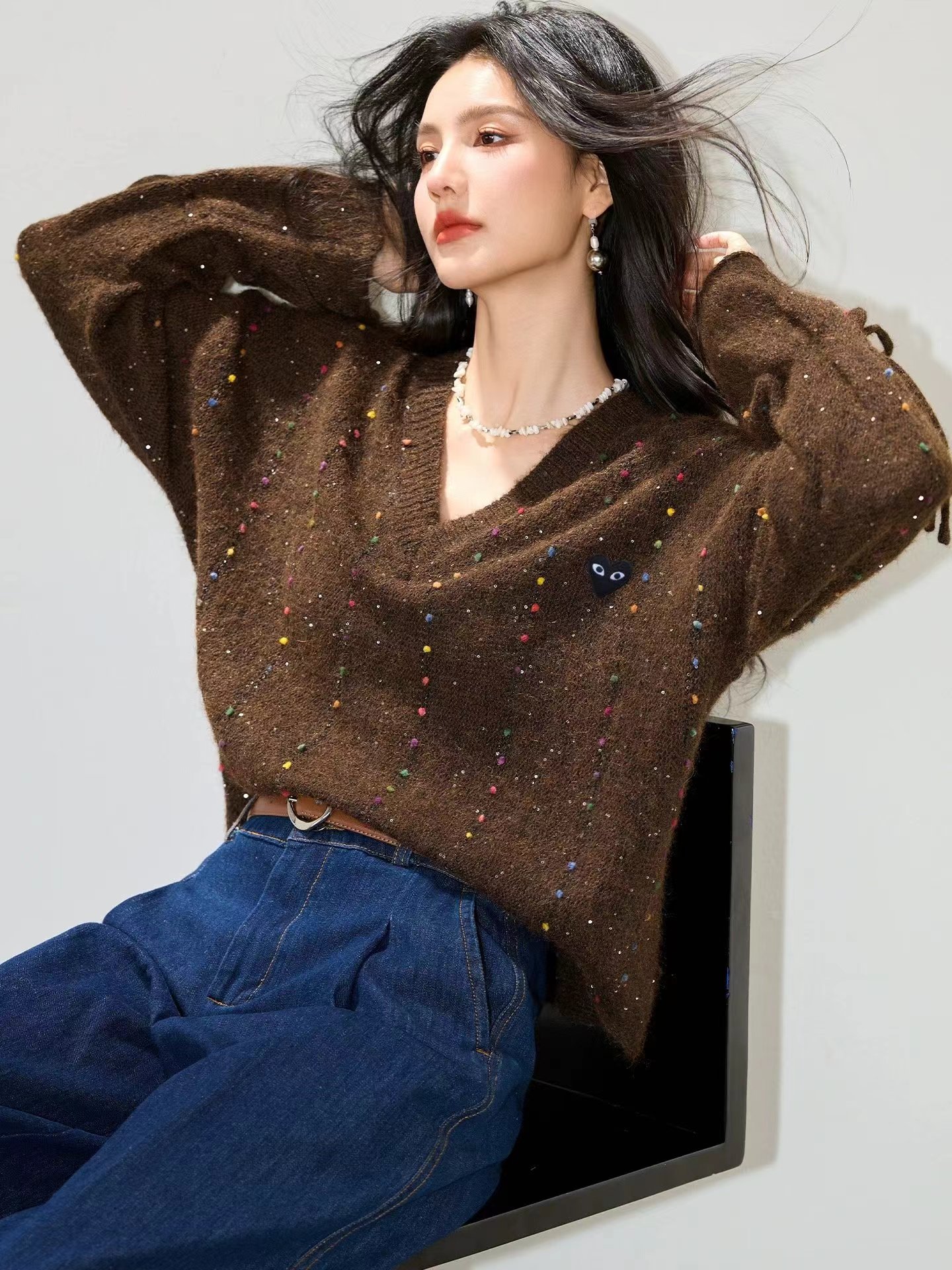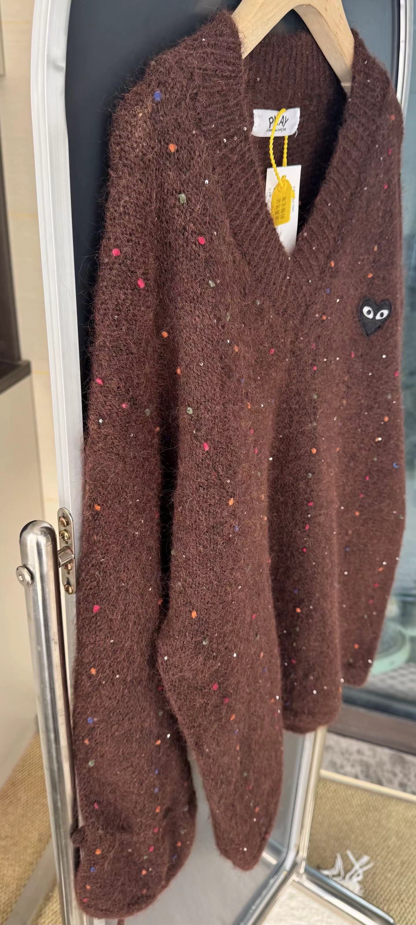 V领亮丝针织开衫这款毛衣是一件设计感十足的白色V领针织衫,充满甜美元素采用针织面料,质地轻柔且带有一定的透气性,衣身点缀着彩色波点,还融入了亮片元素,在光线照射下闪烁微光,工艺细腻jing致。- 款式细节:V领设计,能修饰颈部线条,增添优雅感;袖口为喇叭袖造型,且带有系带设计,可根据喜好调节,复古又俏皮;胸前有的黑色爱心图案(带眼睛设计),赋予了毛衣时尚辨识度。- 穿搭风格:整体风格偏向甜美可爱,可搭配白色裤子打造清新简约风,也可搭配裙装展现温柔气质,是一款兼具时尚感与少女感的单品。