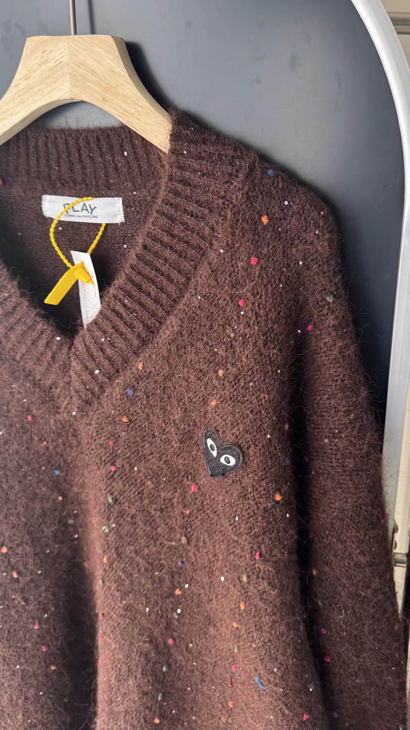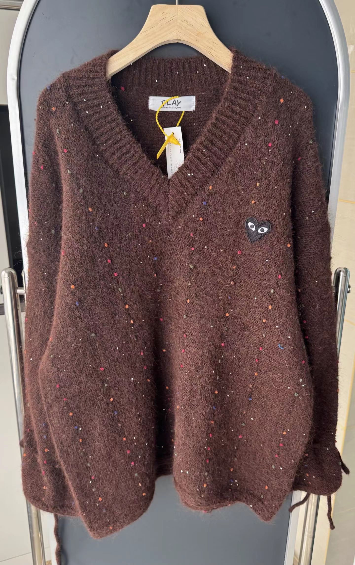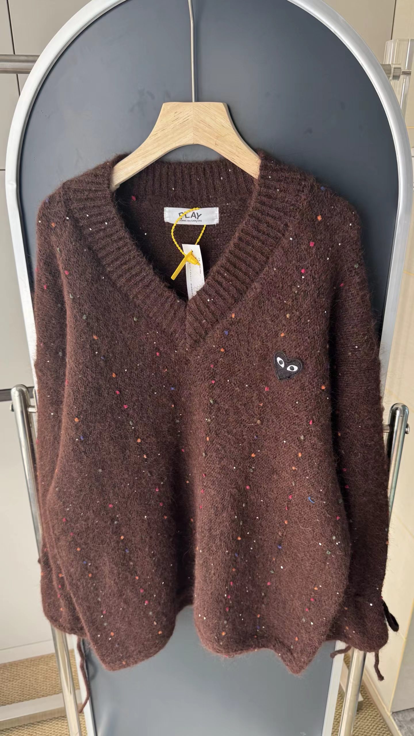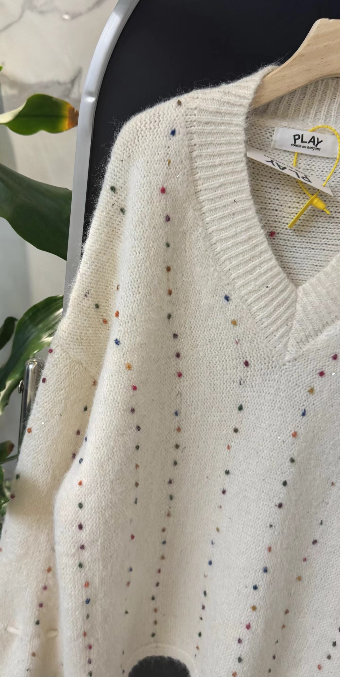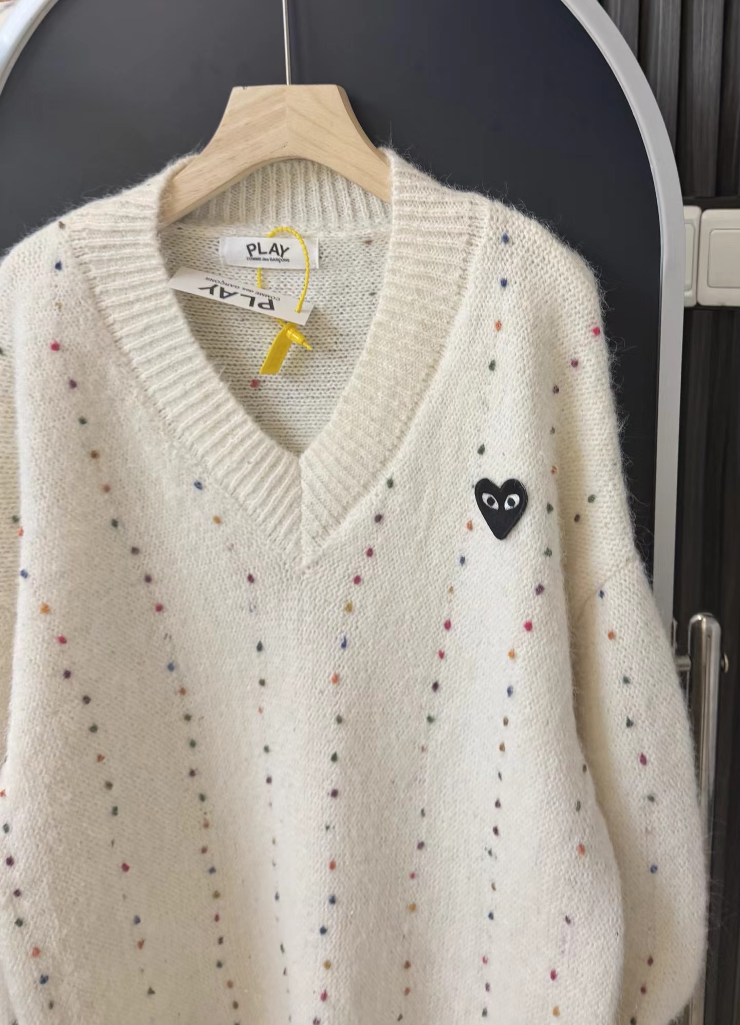 V领亮丝针织开衫这款毛衣是一件设计感十足的白色V领针织衫,充满甜美元素采用针织面料,质地轻柔且带有一定的透气性,衣身点缀着彩色波点,还融入了亮片元素,在光线照射下闪烁微光,工艺细腻jing致。- 款式细节:V领设计,能修饰颈部线条,增添优雅感;袖口为喇叭袖造型,且带有系带设计,可根据喜好调节,复古又俏皮;胸前有的黑色爱心图案(带眼睛设计),赋予了毛衣时尚辨识度。- 穿搭风格:整体风格偏向甜美可爱,可搭配白色裤子打造清新简约风,也可搭配裙装展现温柔气质,是一款兼具时尚感与少女感的单品。