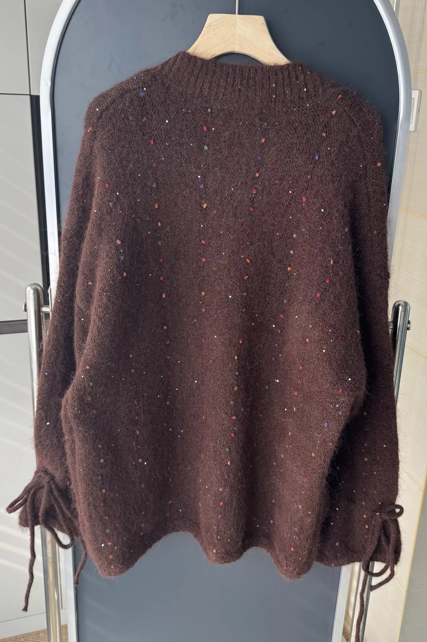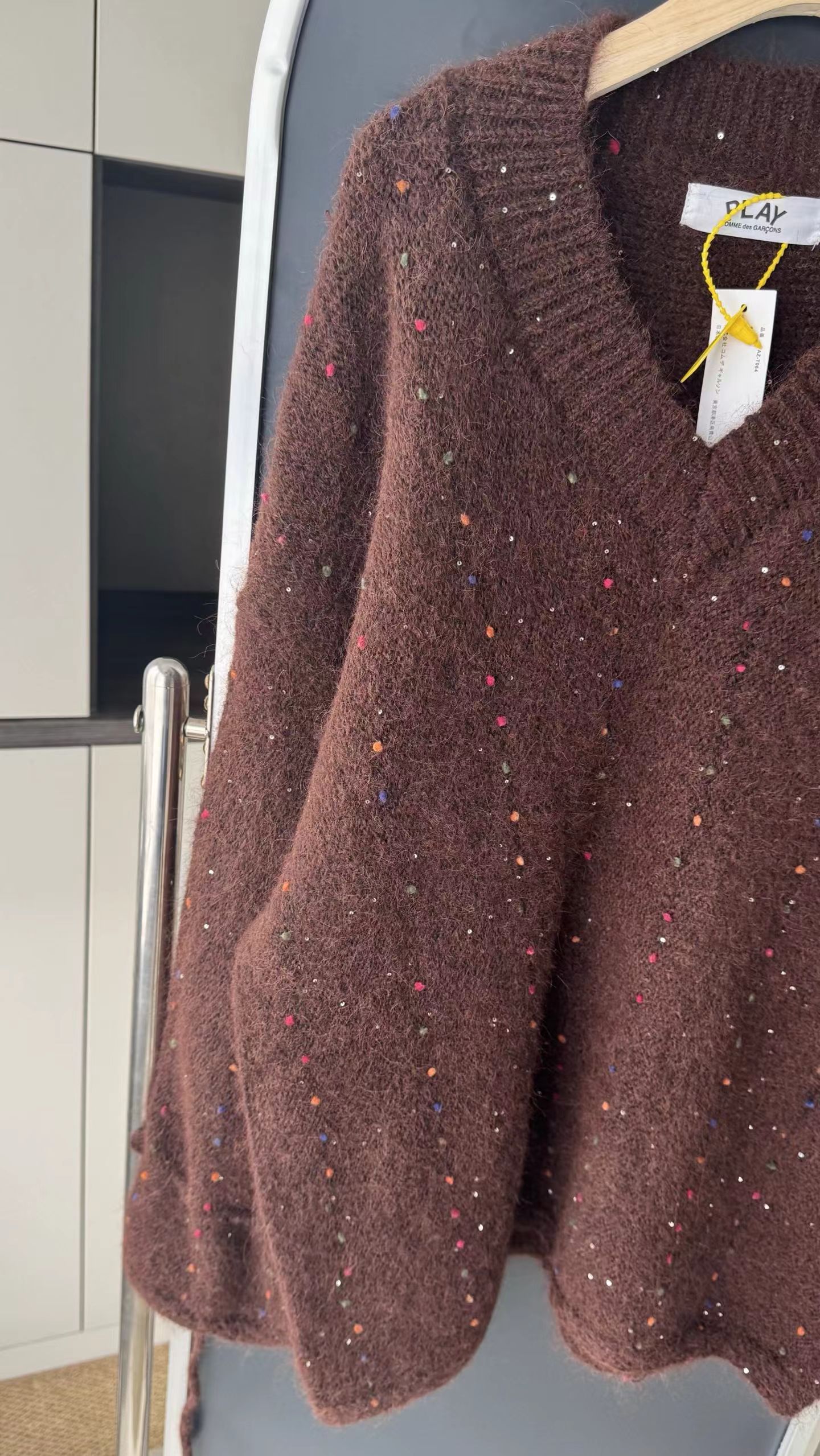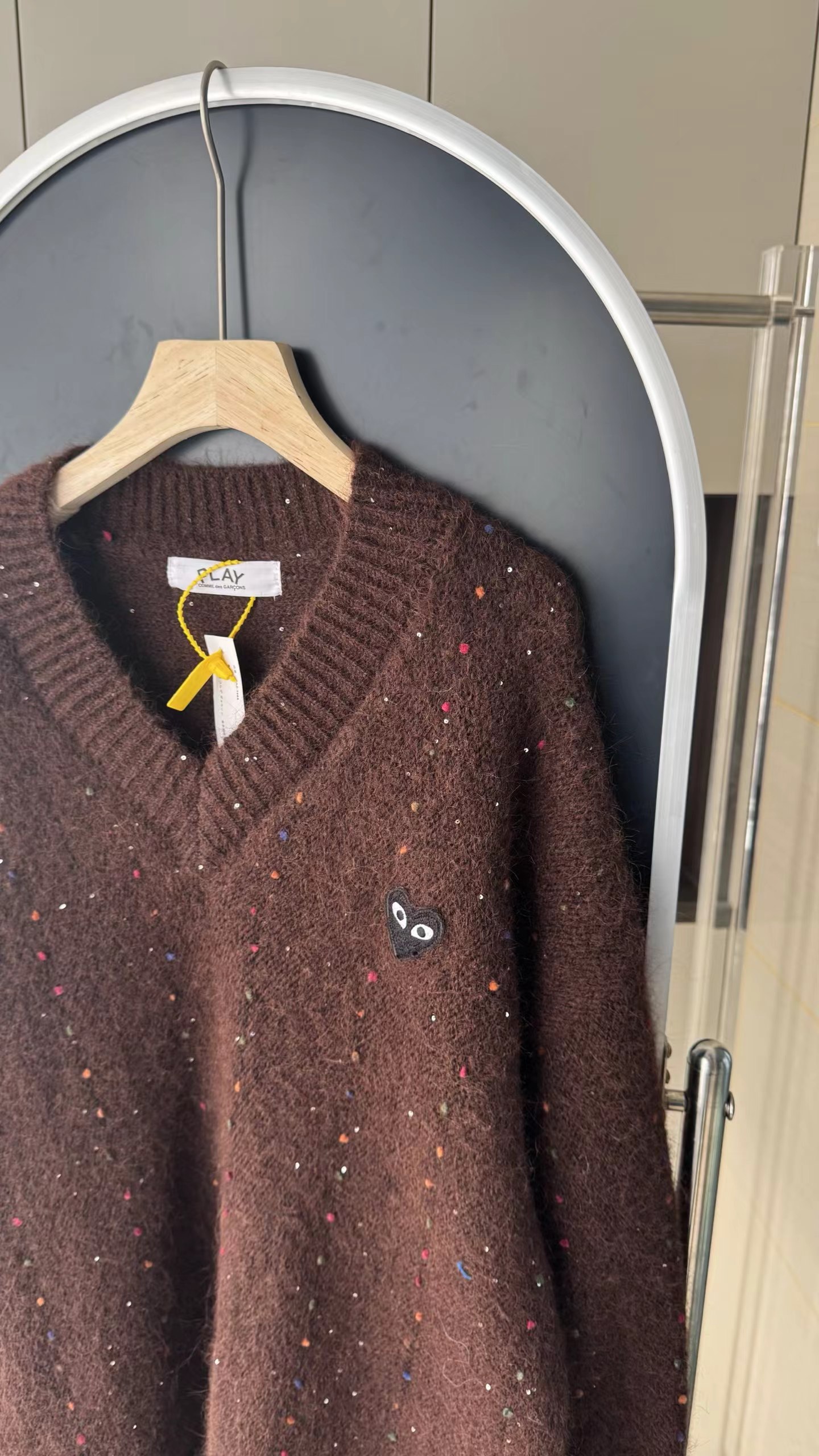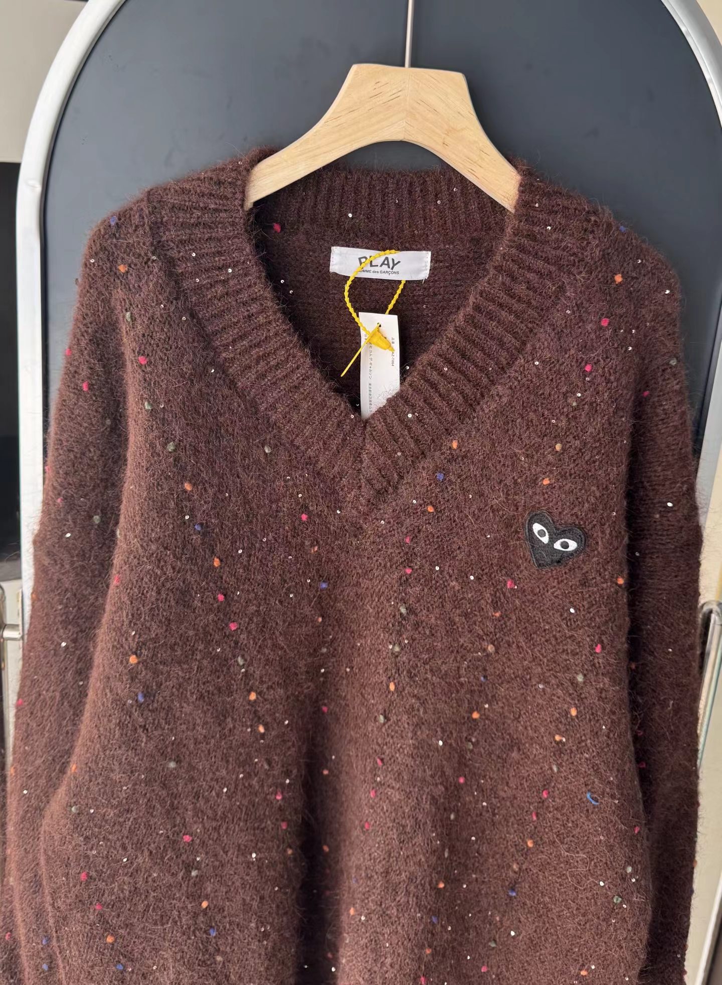 V领亮丝针织开衫这款毛衣是一件设计感十足的白色V领针织衫,充满甜美元素采用针织面料,质地轻柔且带有一定的透气性,衣身点缀着彩色波点,还融入了亮片元素,在光线照射下闪烁微光,工艺细腻jing致。- 款式细节:V领设计,能修饰颈部线条,增添优雅感;袖口为喇叭袖造型,且带有系带设计,可根据喜好调节,复古又俏皮;胸前有的黑色爱心图案(带眼睛设计),赋予了毛衣时尚辨识度。- 穿搭风格:整体风格偏向甜美可爱,可搭配白色裤子打造清新简约风,也可搭配裙装展现温柔气质,是一款兼具时尚感与少女感的单品。