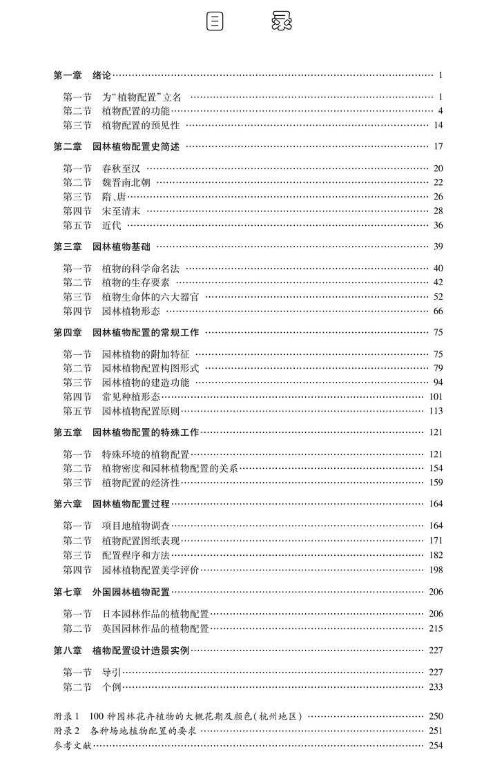 本书章节及附录名称如下:第一章绪论、第二章园林植物配置史简述、第三章园林植物基础、第四章园林植物配置的常规工作、第五章园林植物配置的特殊工作、第六章园林植物配置过程、第七章外国园林植物配置、第八章植物配置设计造景实例、附录1100种园林花卉植物的大概花期及颜色(杭州地区)、附录2各种场地植物配置的要求。