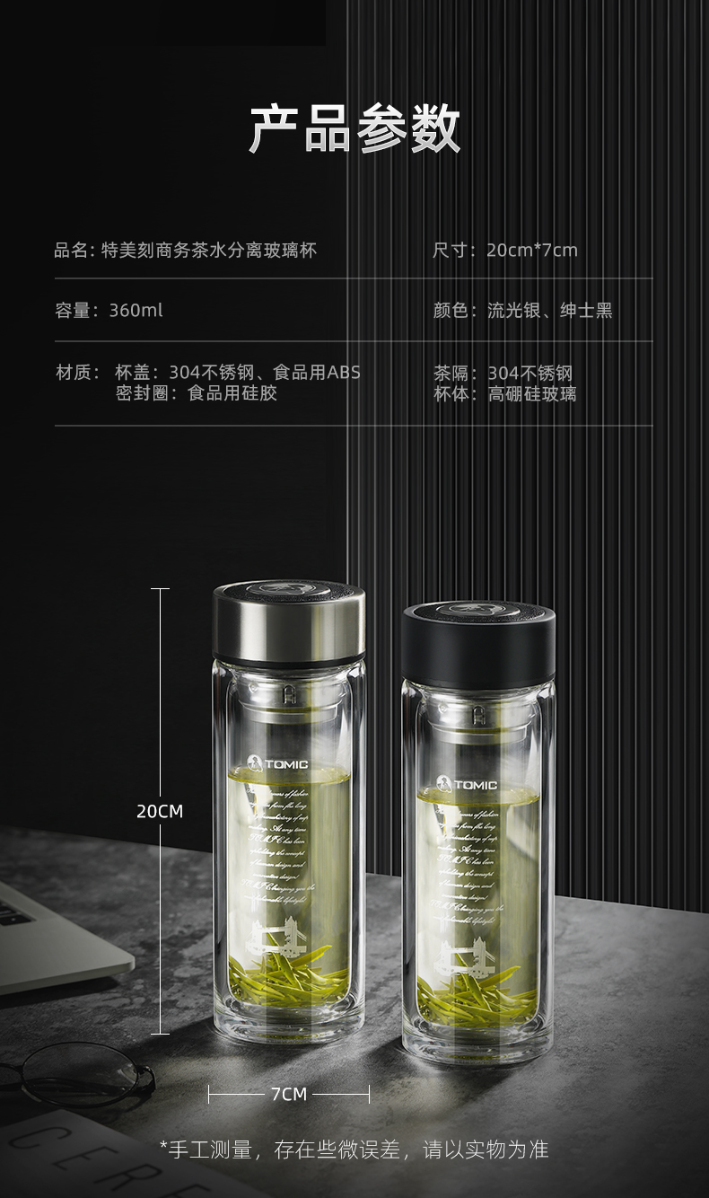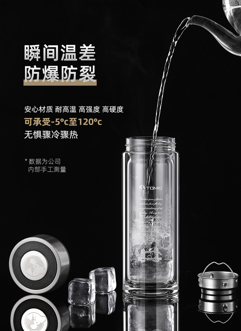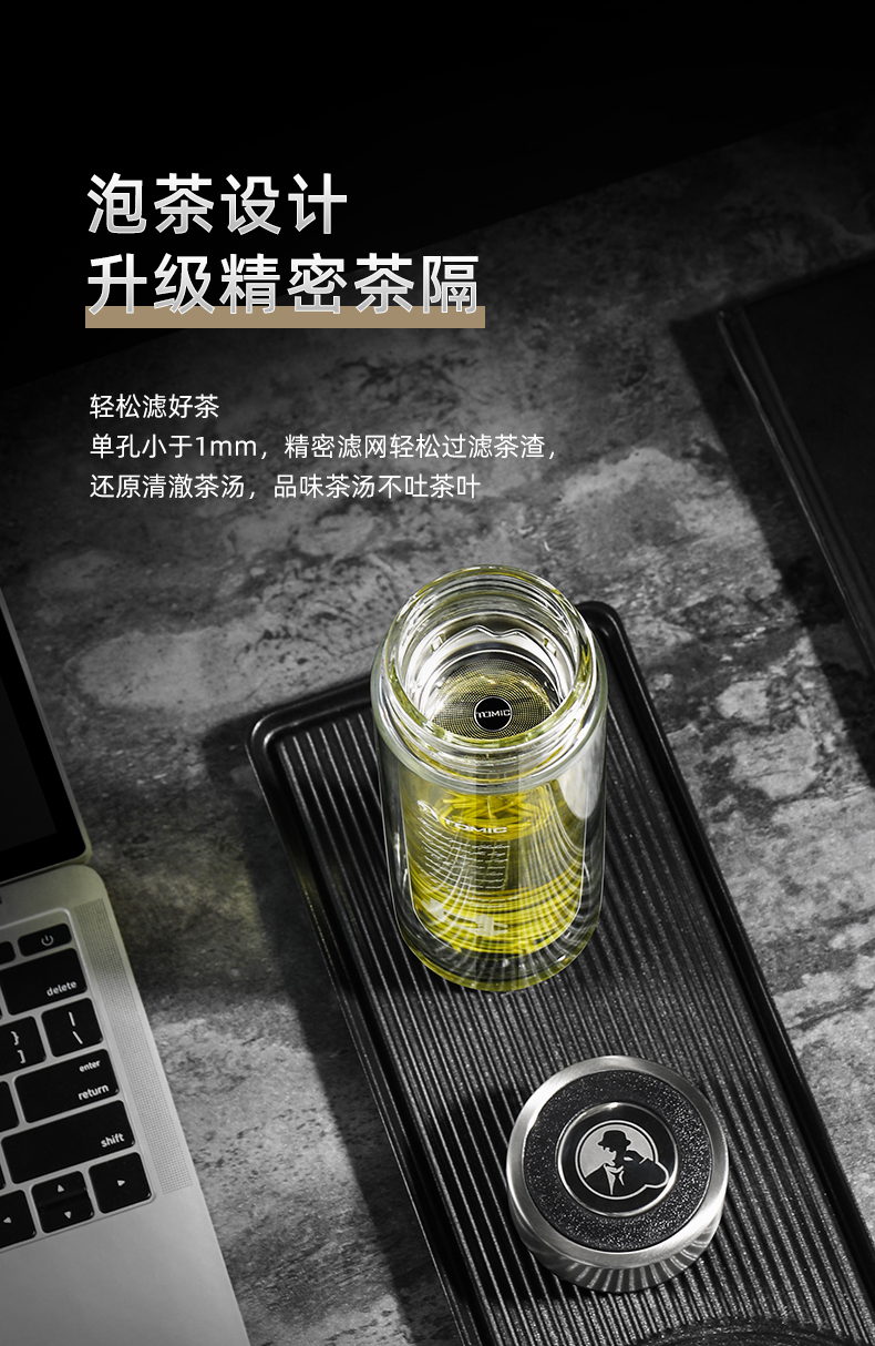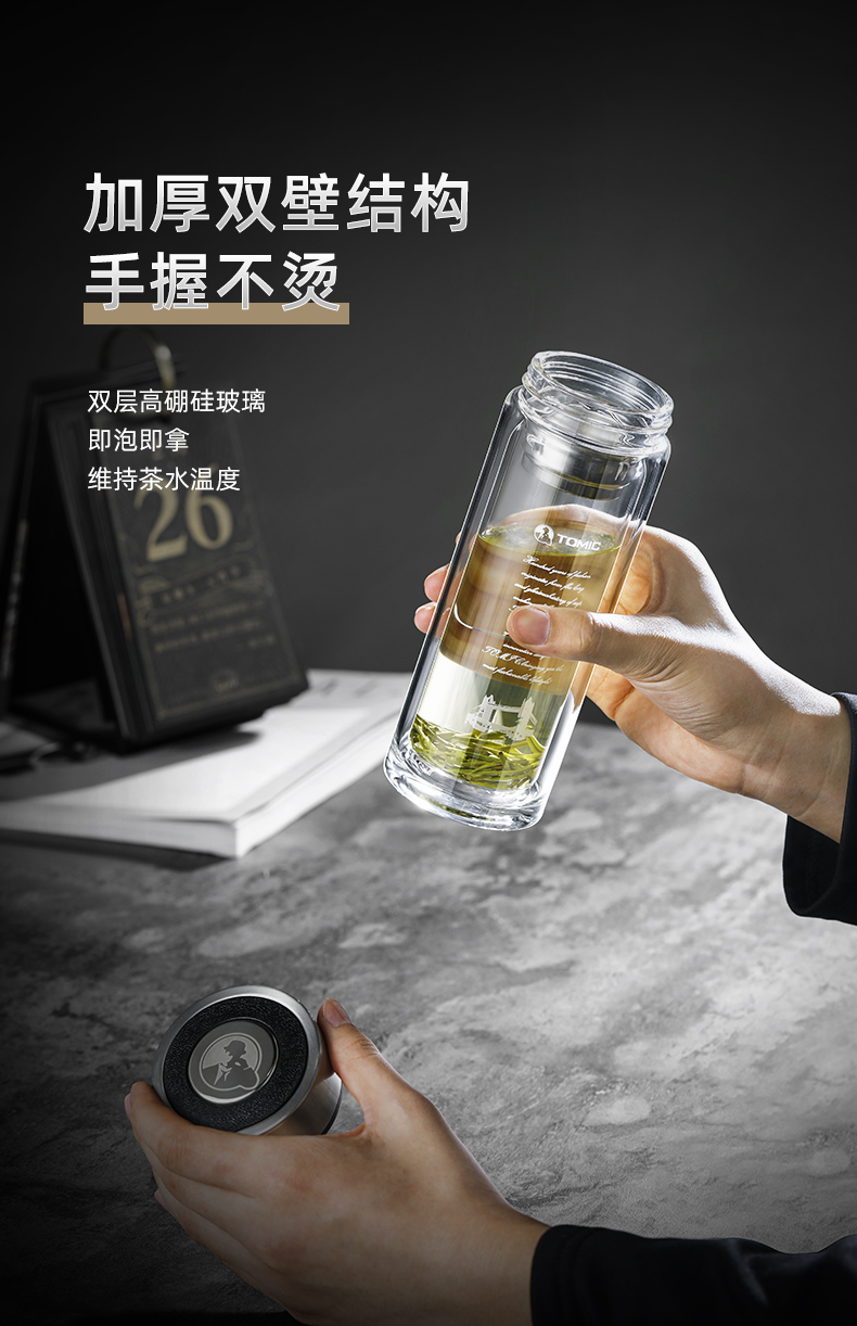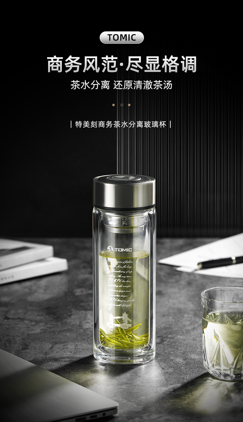 特美刻(TOMIC)双层玻璃杯男女士家用高档带过滤网茶杯商务办公水杯隔热透明特美赢杯子TG82003本色360ML