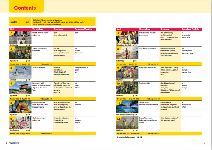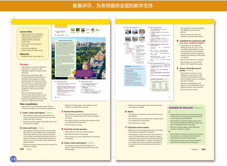教材的特点就是好上手,非常清晰,教师手册每个单元引入的资源非常多,PPP教学,每一册共有12个单元,每个单元有3节课,如果学校课时多,还有很多可以延伸教学的素材,在语法教学中还会提供20个语法游戏,增加课堂的趣味性。