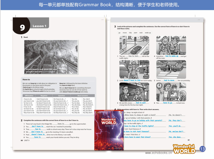 Wonderful World是小学阶段教材,一共六个等级,对应一到六年级,含学生用书,练习册,语法练习册,学生用CD等资料。相应还有其他配套的教师用书及资料;