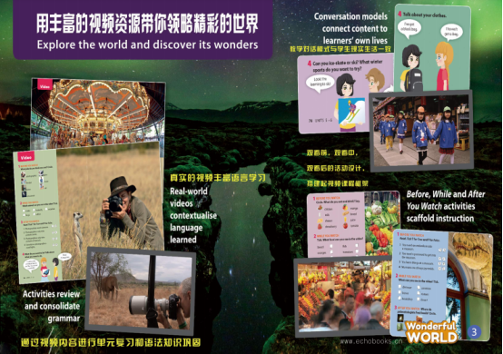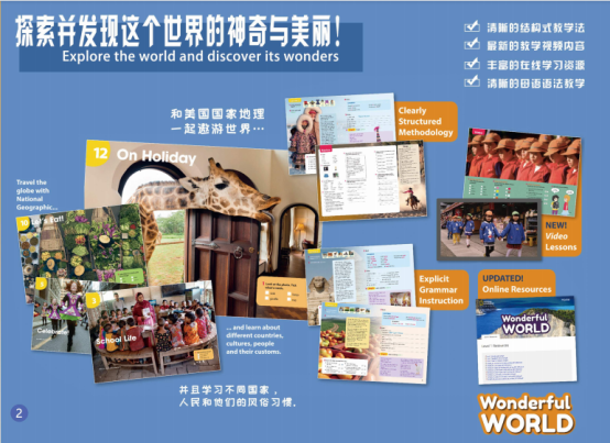 Wonderful World系列小学英语教程通过美国国家地理引人入胜的视频和启发灵感的照片,让学生在学习英文技能的同时探索并发现世界之美。该系列从Level 1到Level 6共6个级别,以词汇和语法教学为主线,配合真实世界的素材、丰富的拓展活动、全新的线上资源,充分激发学生的好奇心和创造力,将世界带入课堂,引领学生环游精彩世界,开启缤纷畅想!