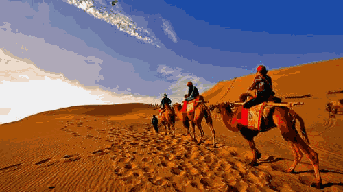 金黄的沙山上,每当狂风四起,便会发出巨响,而沙漠之中一湾泉水犹如明月,鸣沙山与月牙泉,是茫茫大漠的奇迹。鸣沙山和月牙泉是大漠戈壁中一对孪生姐妹。我们在这里特别安排大家【沙漠骑骆驼】