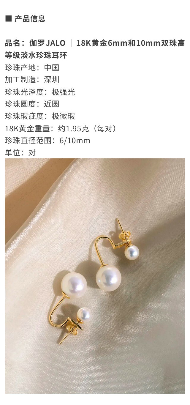伽罗 JALO 18K黄金6mm和10mm 双珠高等级淡水珍珠耳环