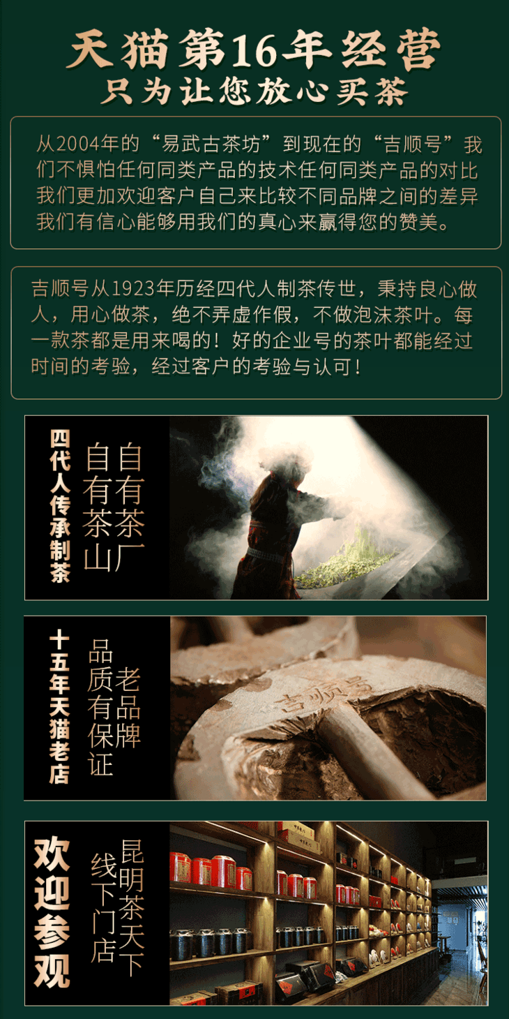 - 云南吉顺号茶业,专业云南普洱茶基地生产销售商。自有基地茶厂及运营仓储物流团队。