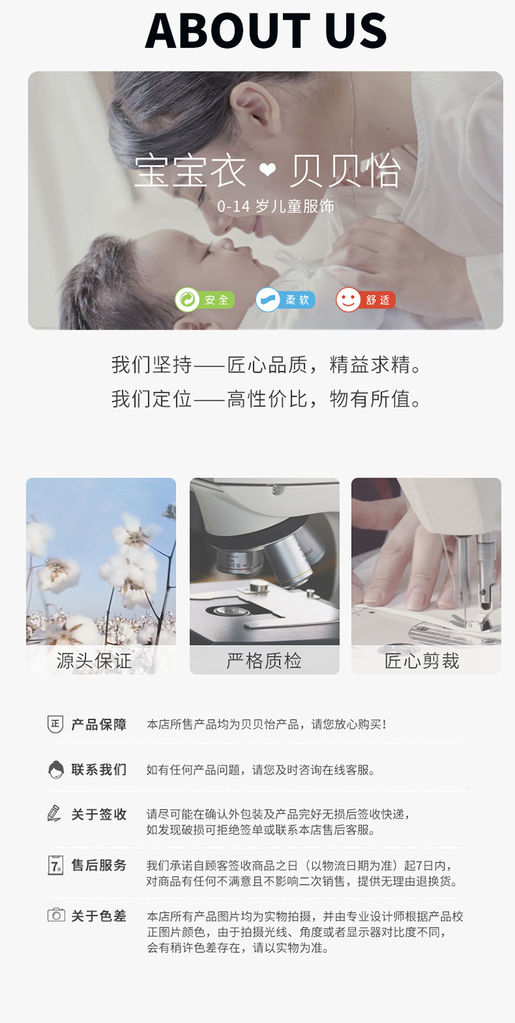 - 贝贝怡专注0-6岁婴幼儿服饰,坚持安全、柔软、舒适的产品理念,为千万中国家庭提供超高品质、安全可靠的婴幼儿服饰产品,妈妈放心,宝宝开心!