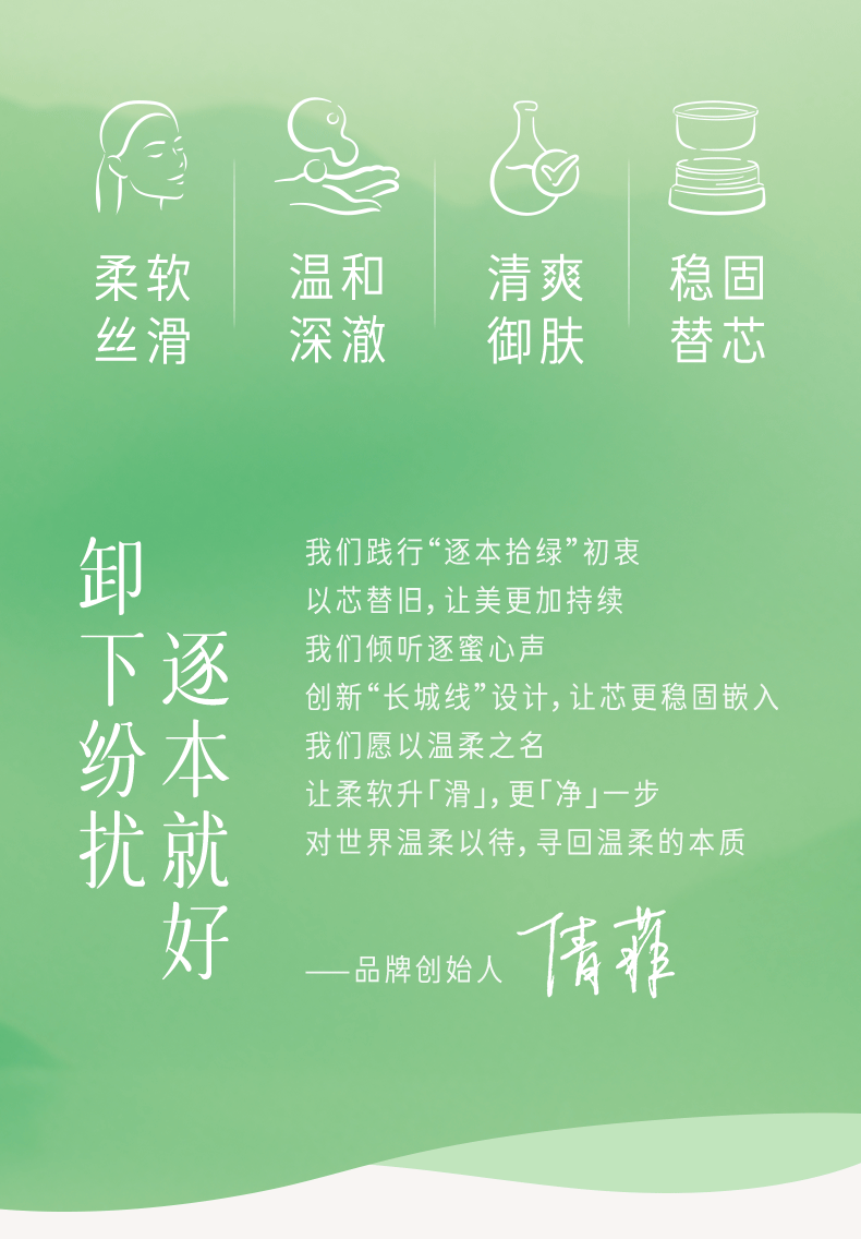 - 逐本以天然、诚实、疗愈、平衡为产品开发四大原则,以全球优质产地天然成分为基础,最小化肌肤与自然环境的代谢负担,最大化唤起素肌的健康之美。