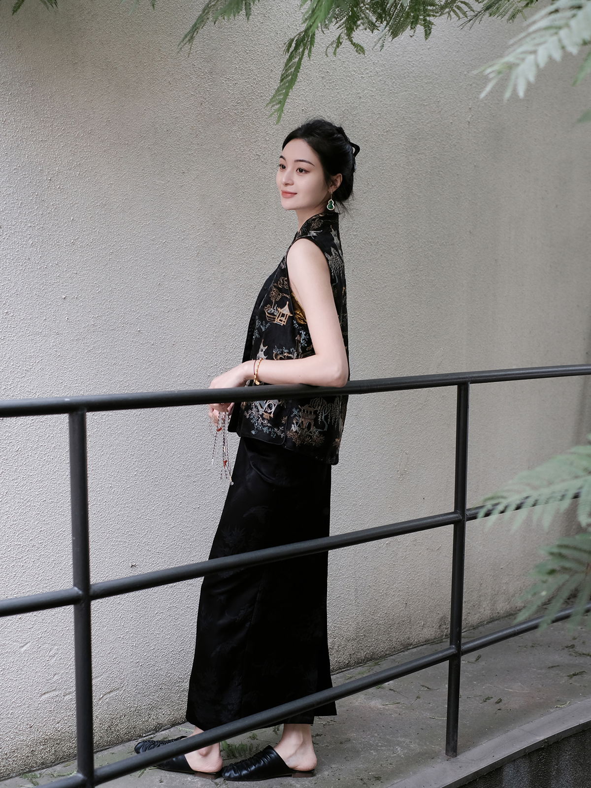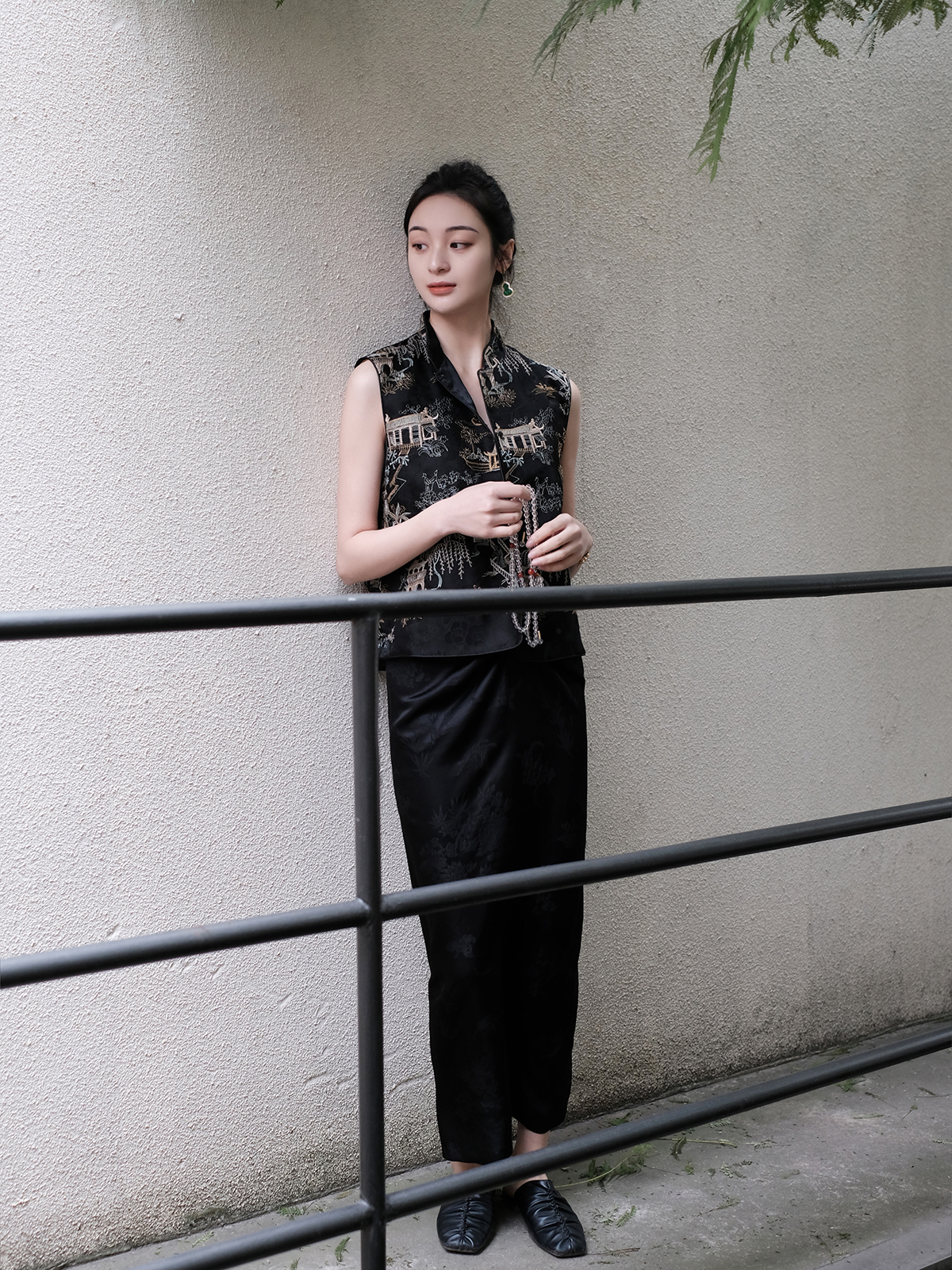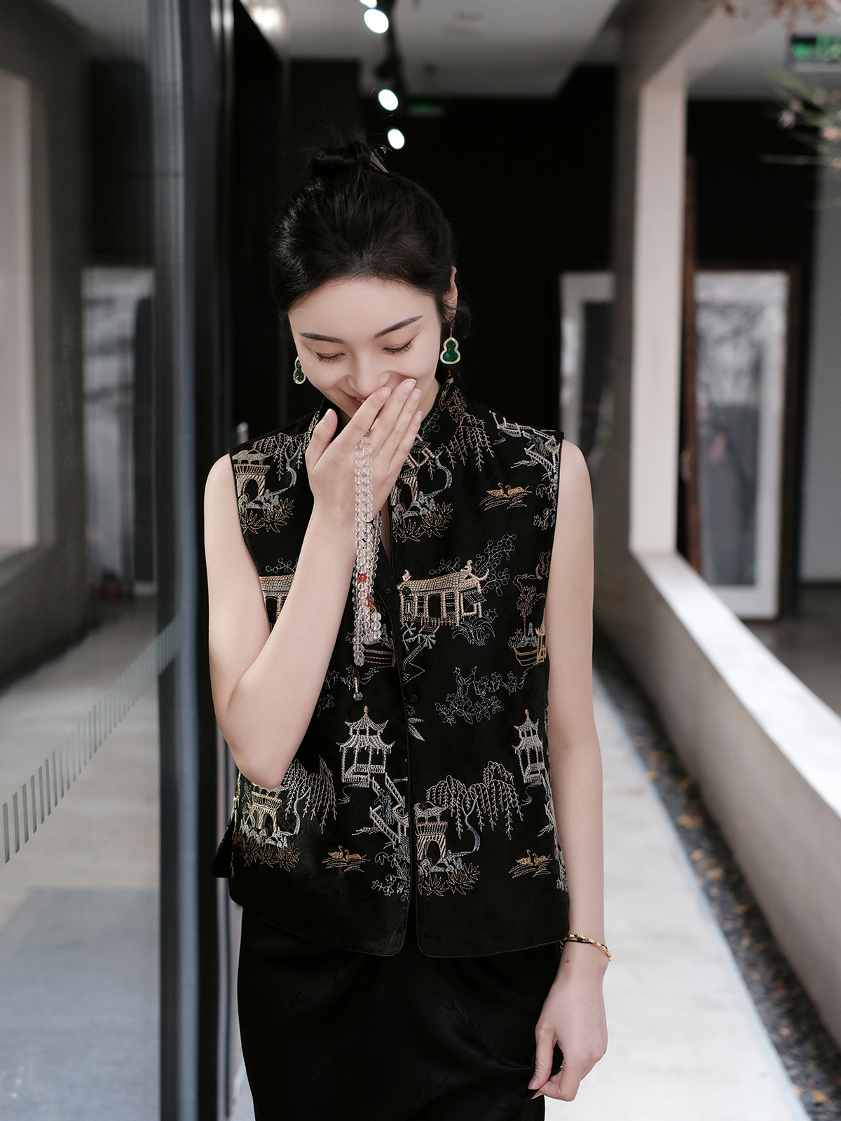 盛唐牡丹 |黑色真丝绡如意湖亭马甲
