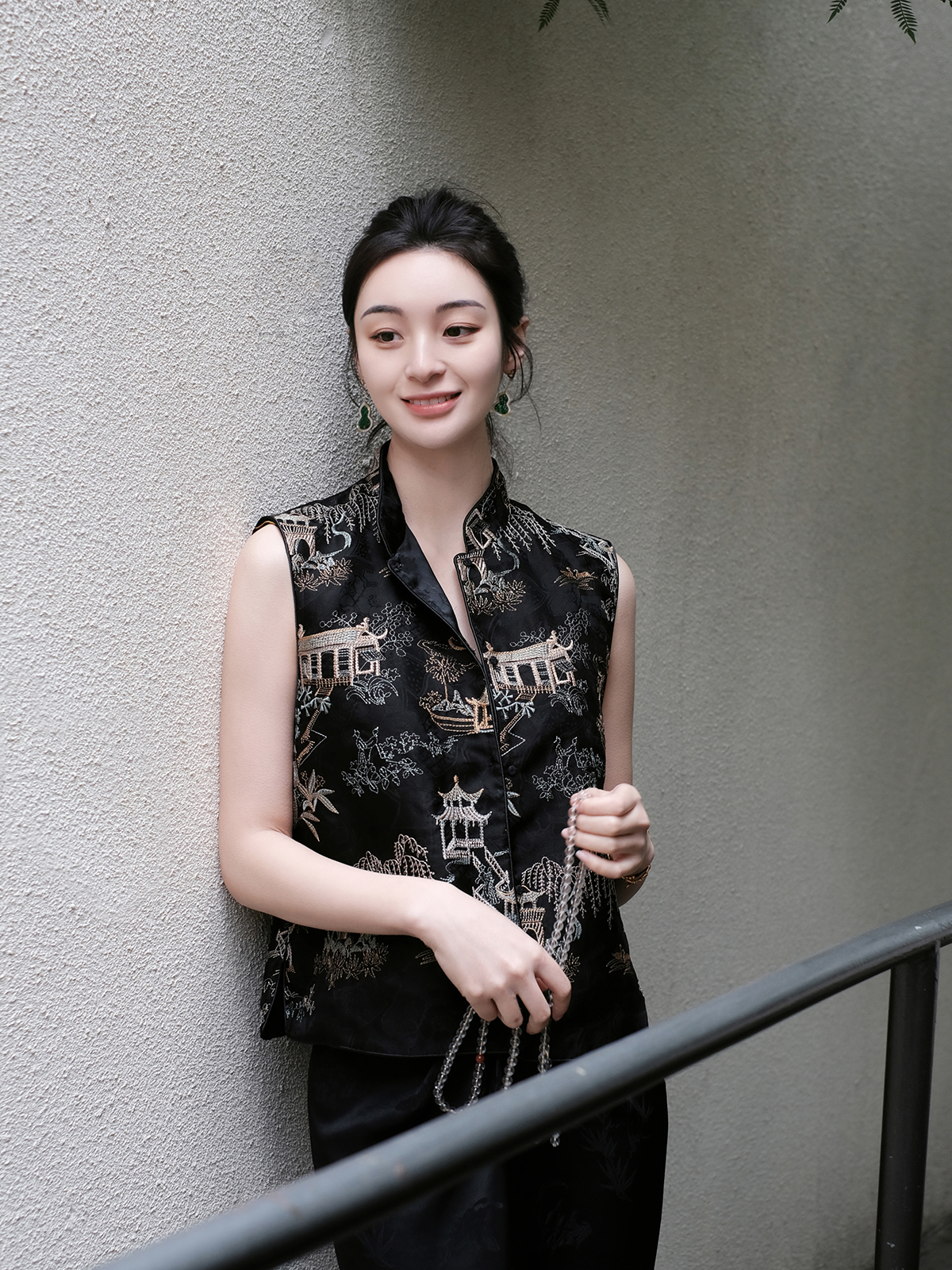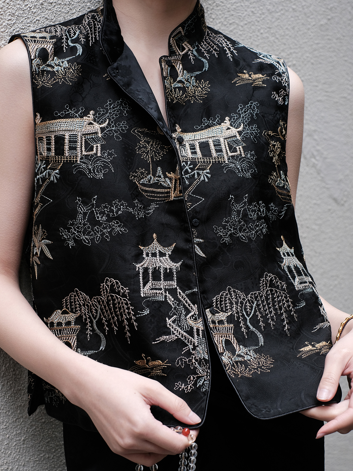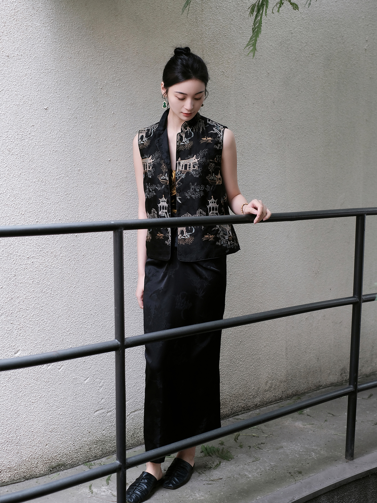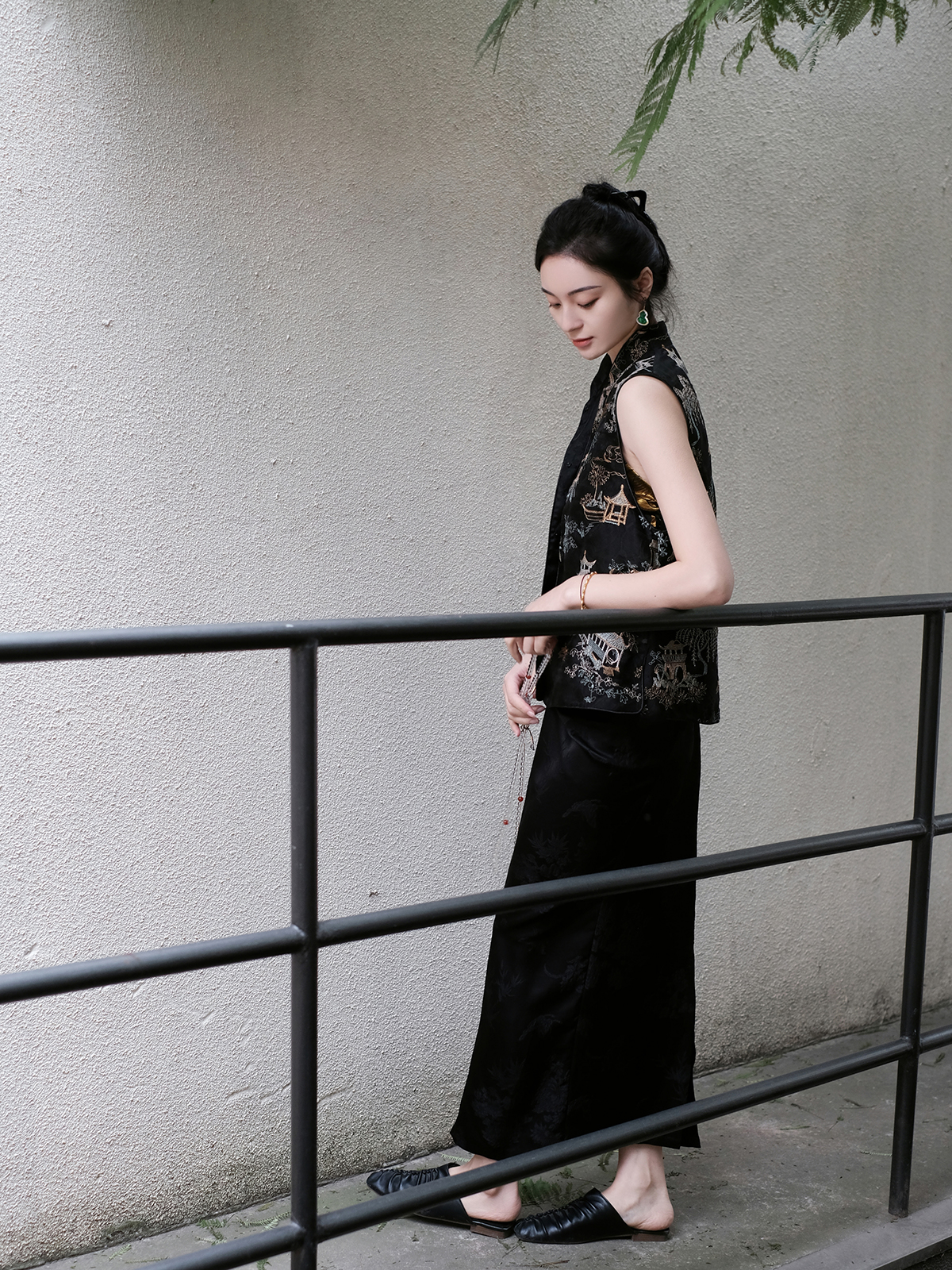 盛唐牡丹 |黑色真丝绡如意湖亭马甲